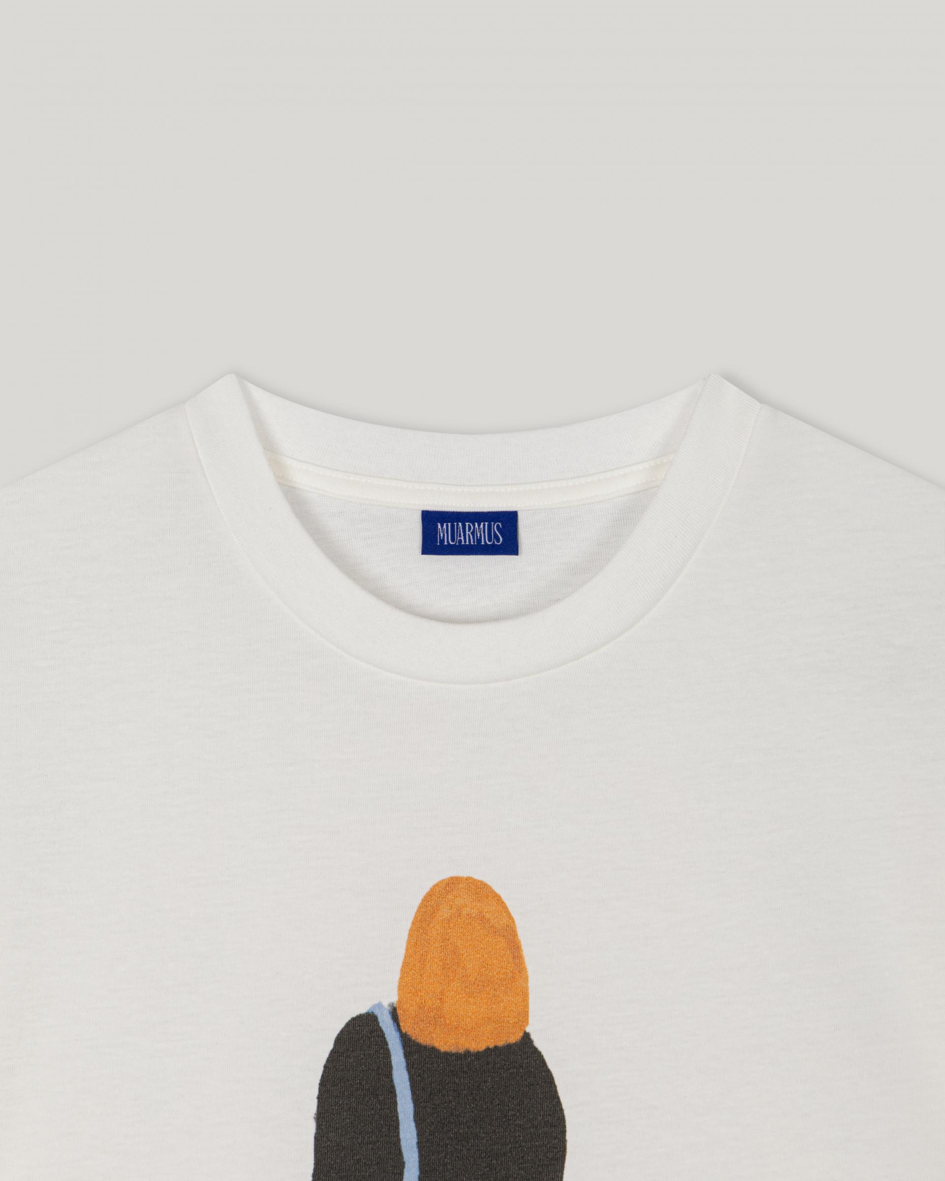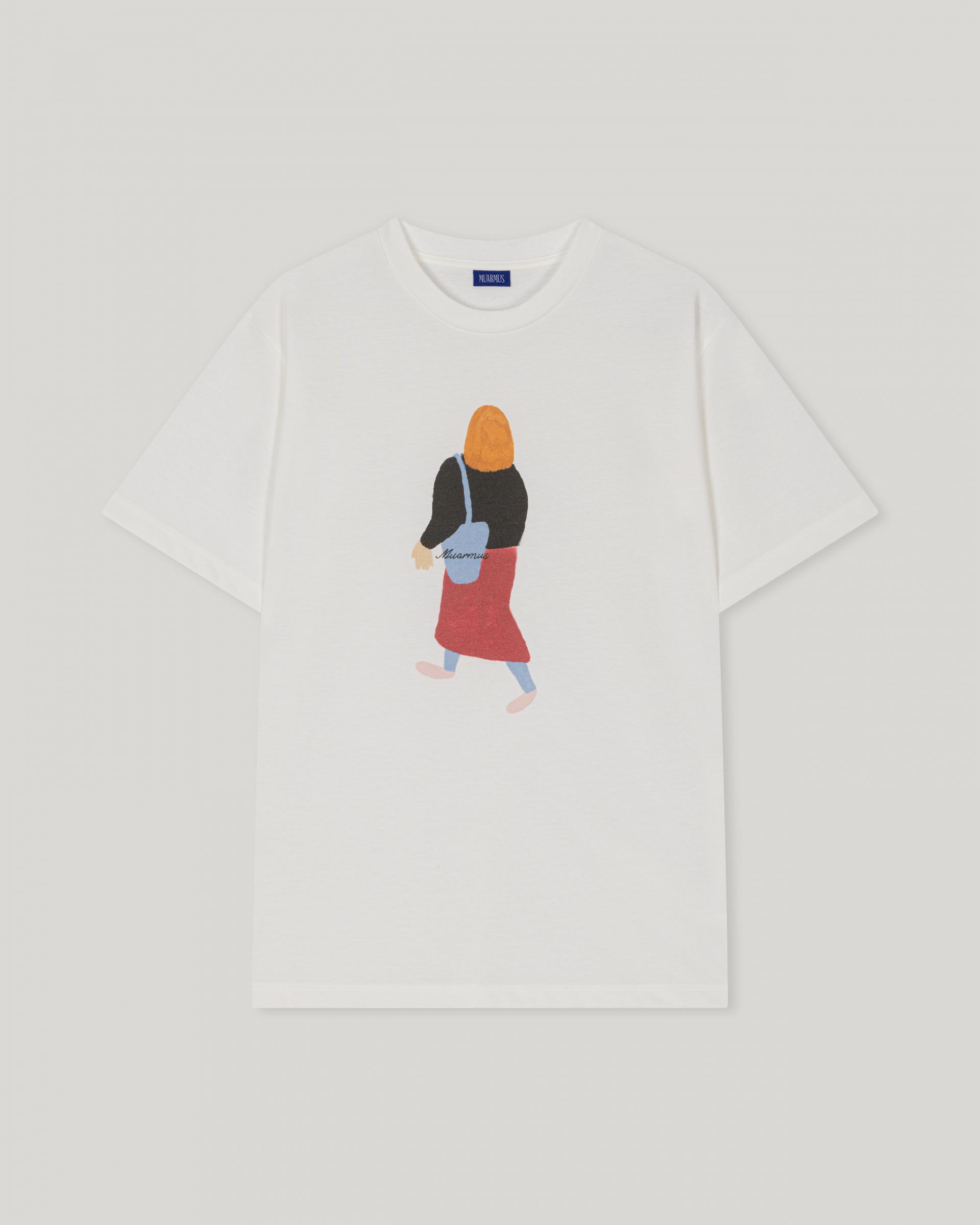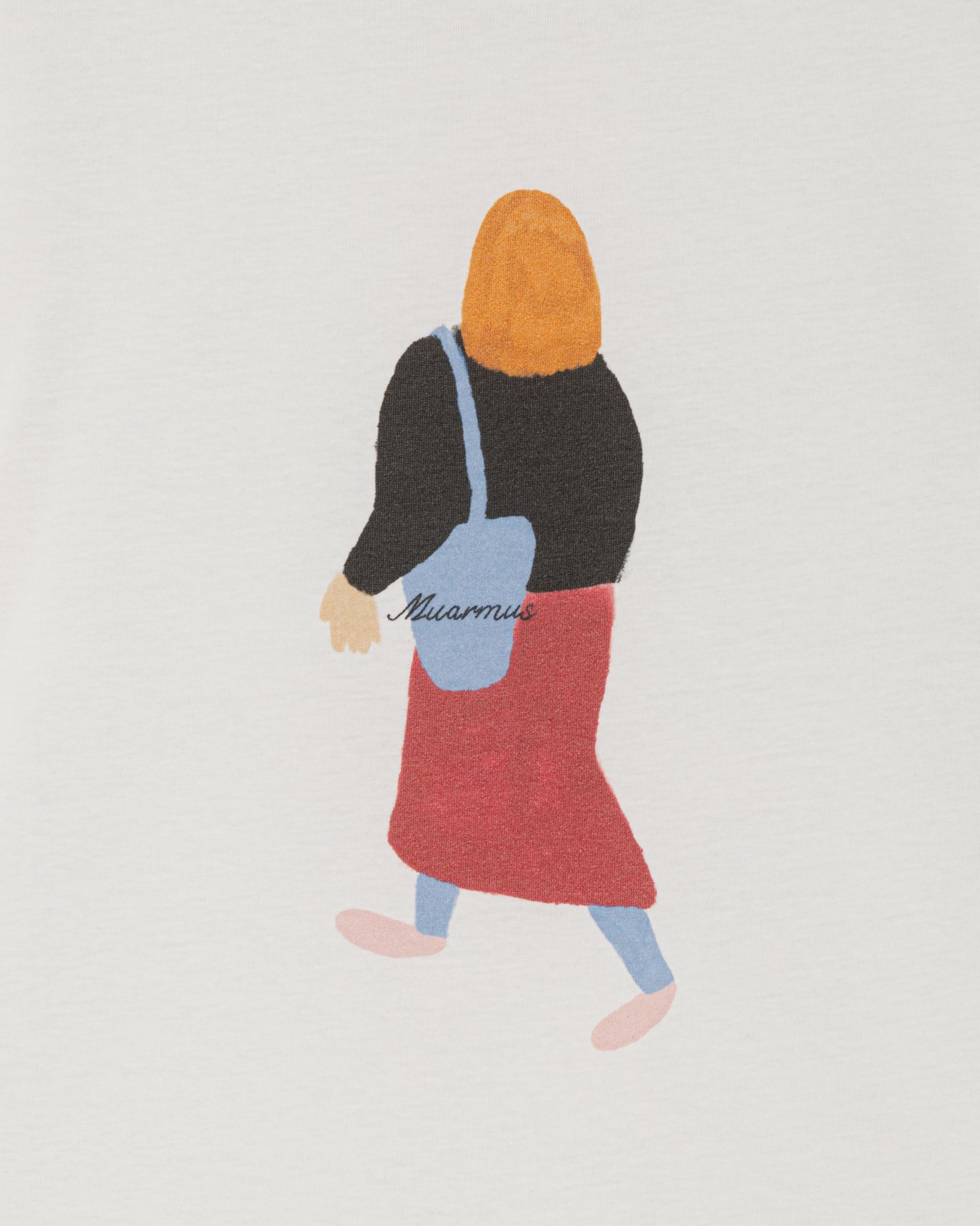 MUARMUS 필기체가 새겨진 숄더백을 든 소녀 드로잉을 프린팅하였습니다.