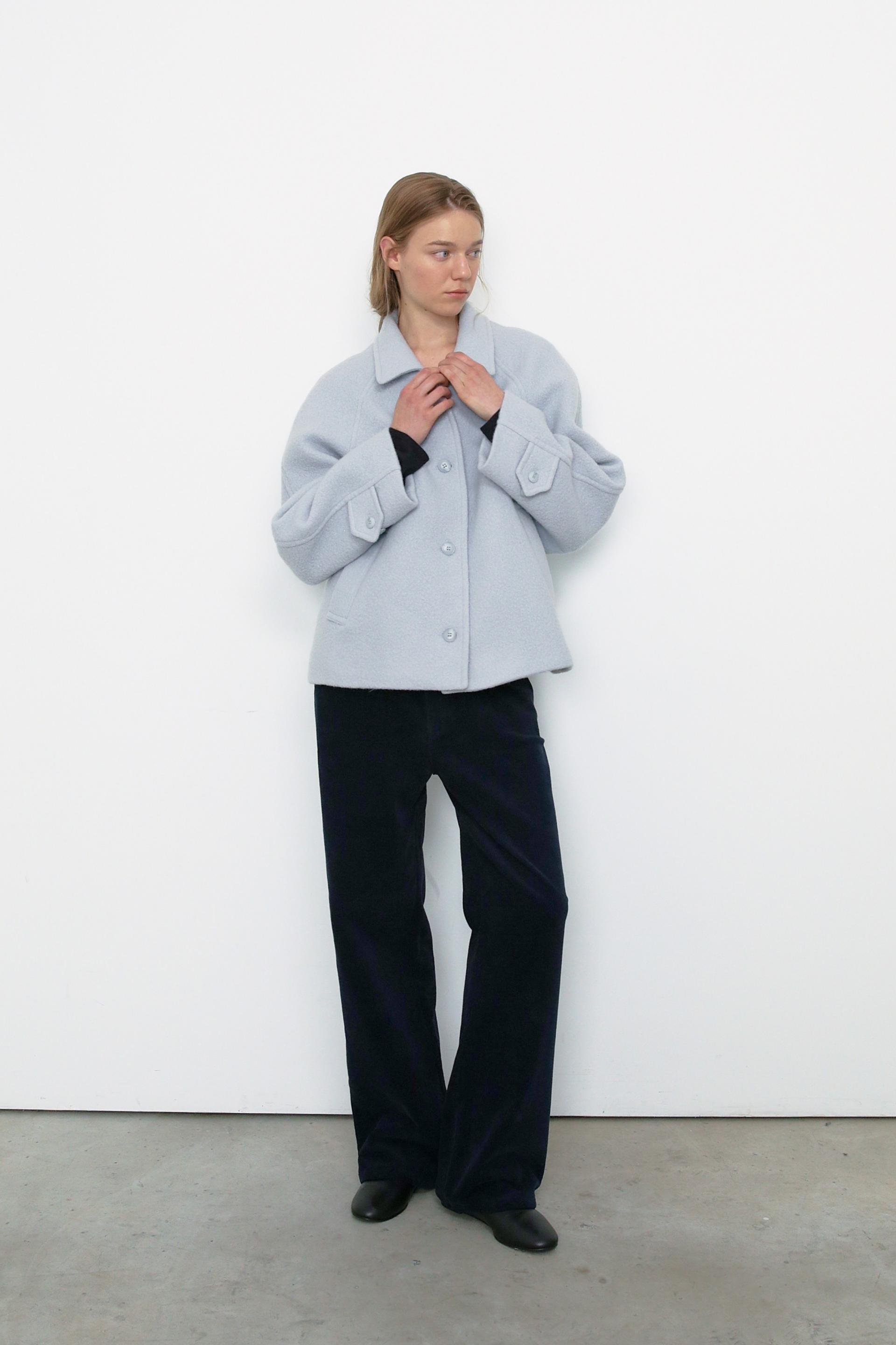 몸판 컬러와 톤을 맞춘 단추와 소매 비조 디테일로 디자인의 완성도를 높였으며,