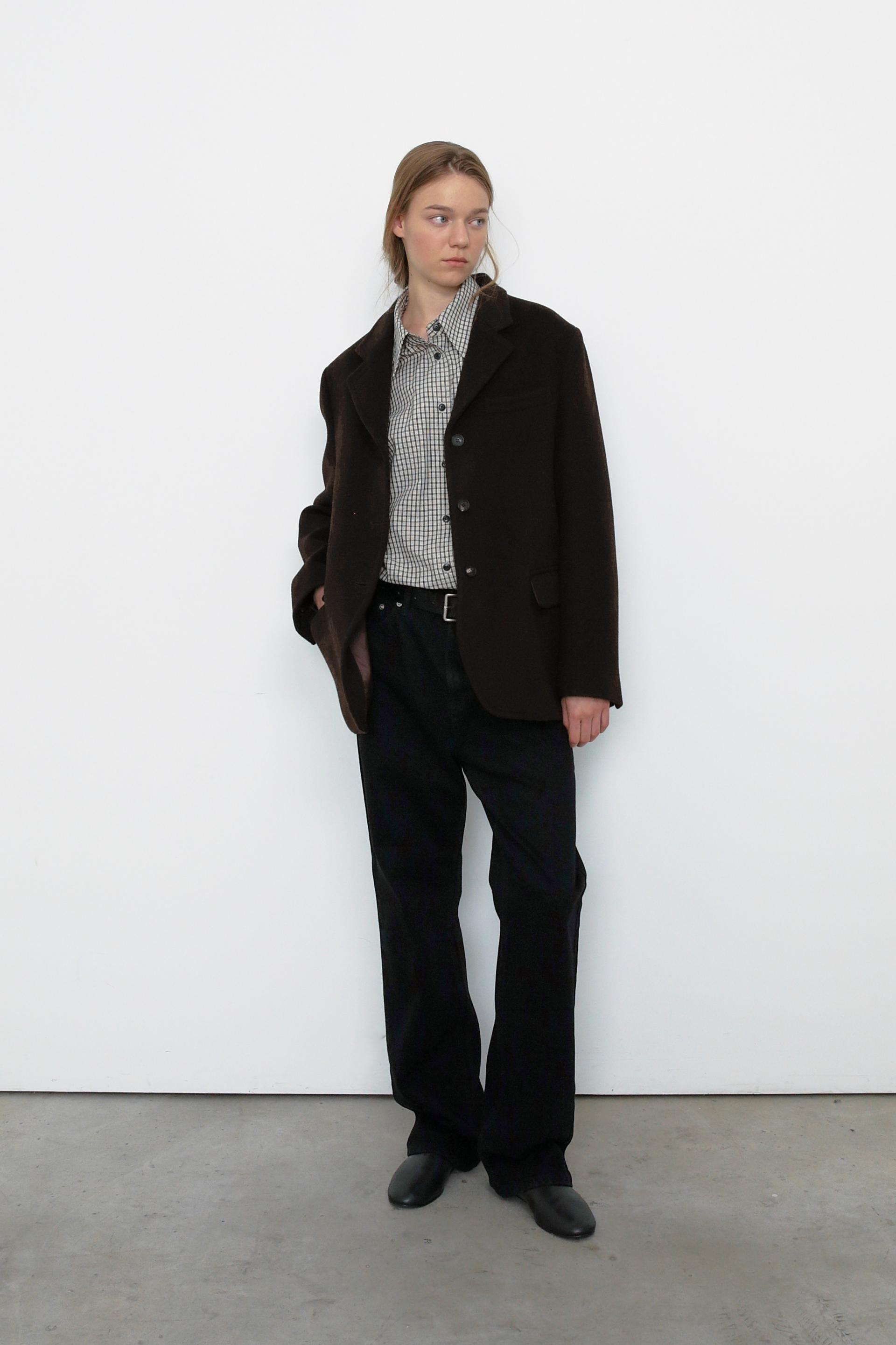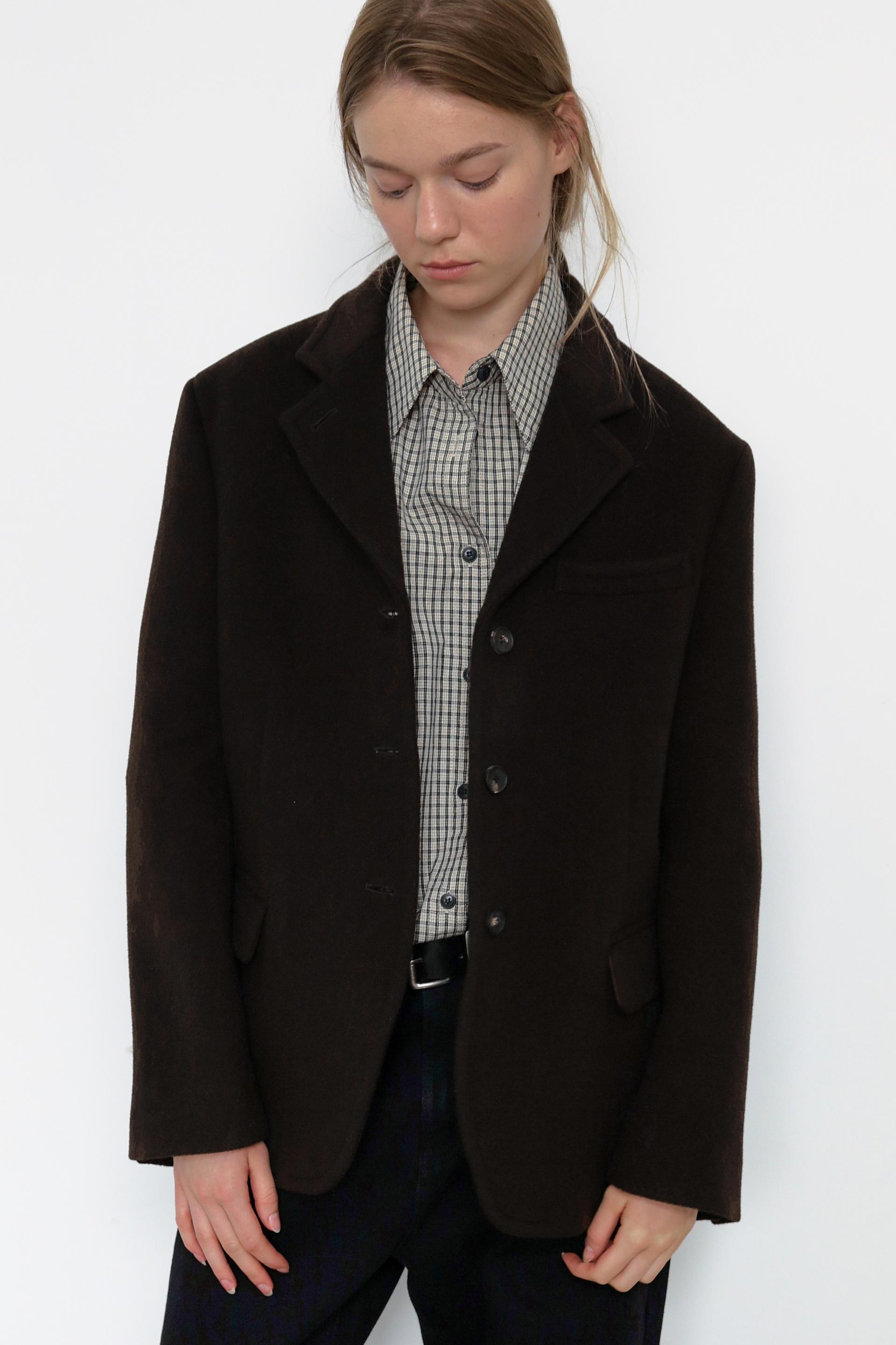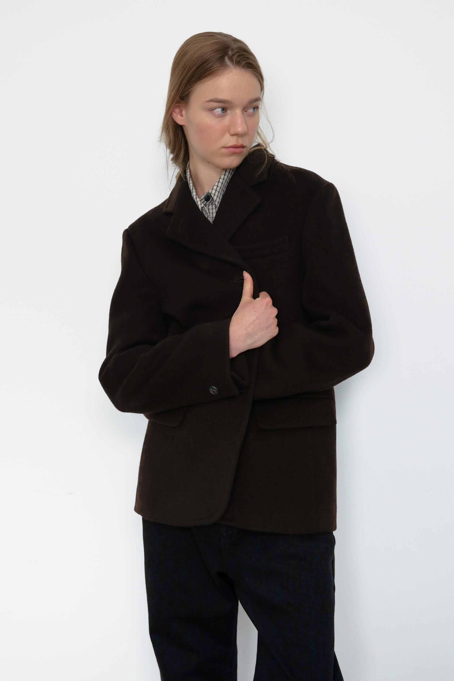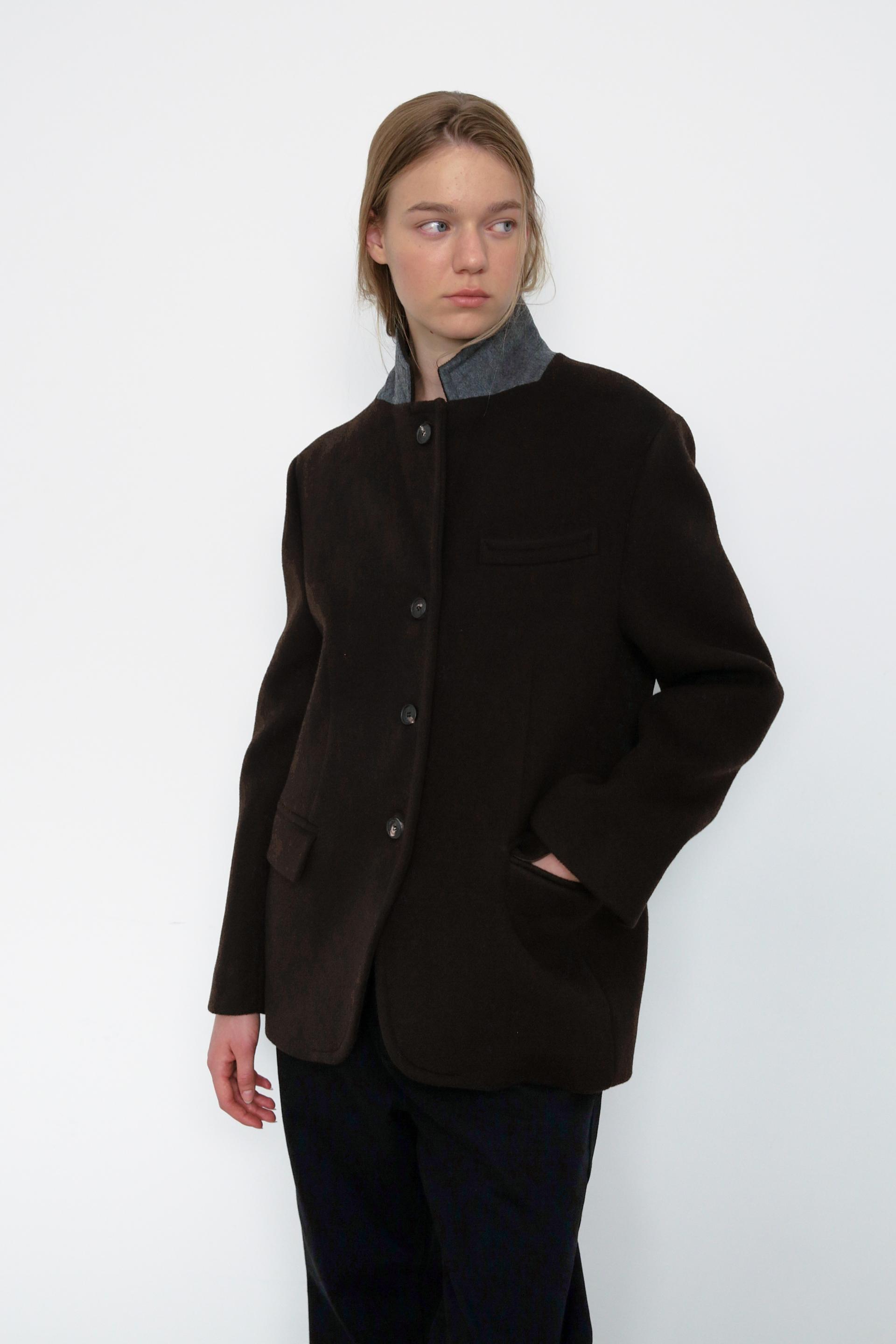 캐시미어가 함유된 하프 기장의 자켓으로, 부드러운 울 텍스쳐와 터치감을 자랑합니다.