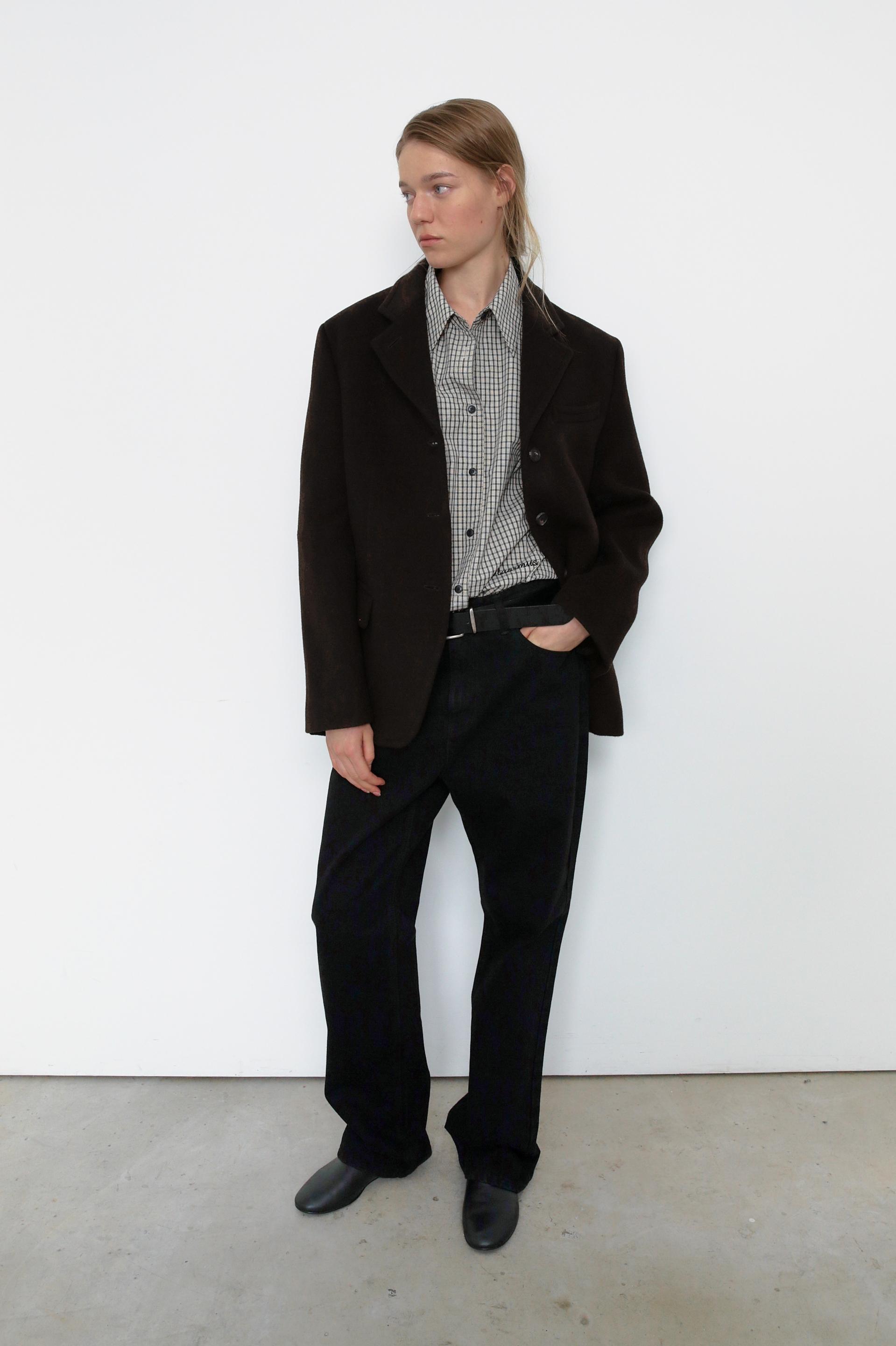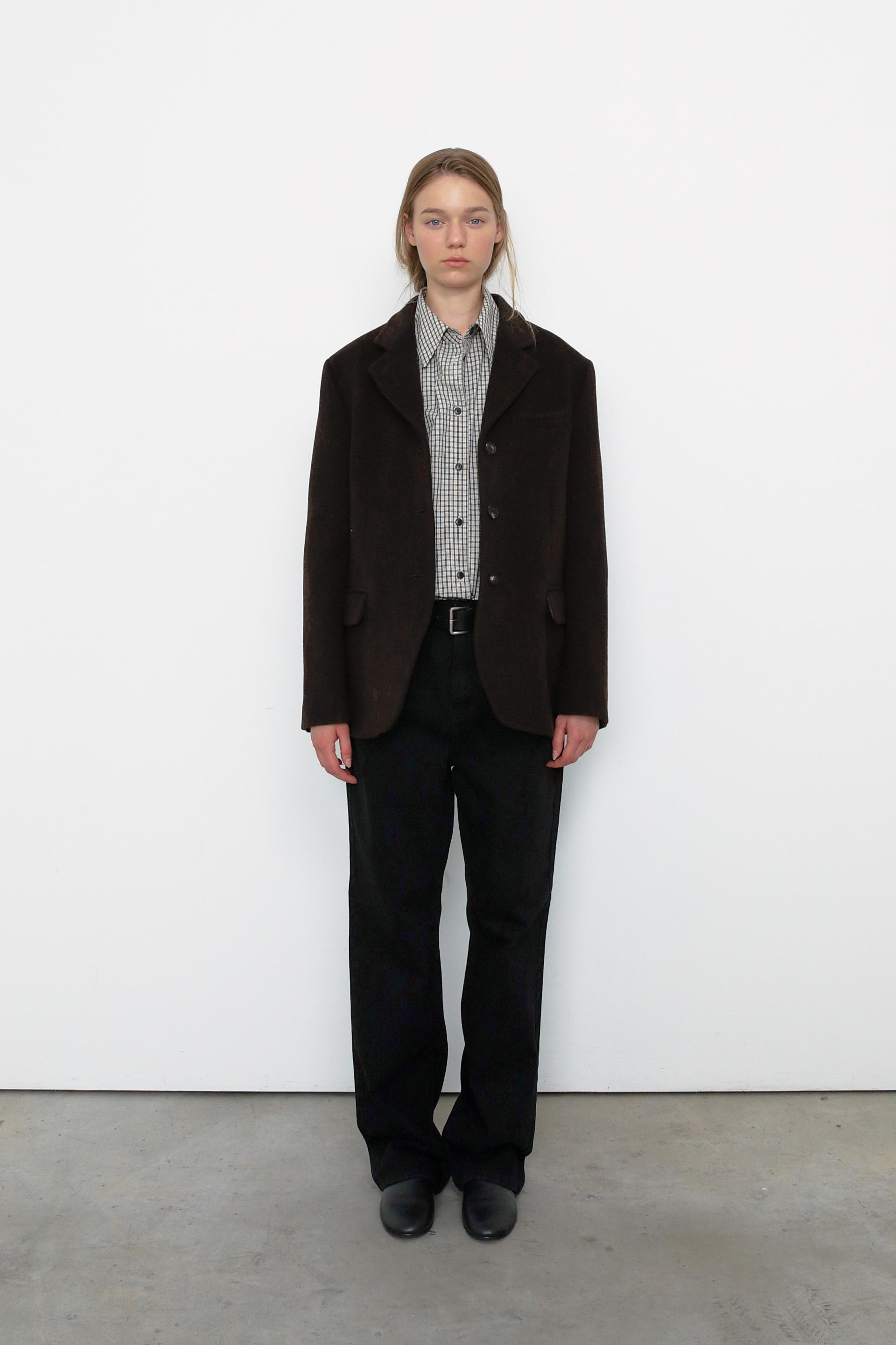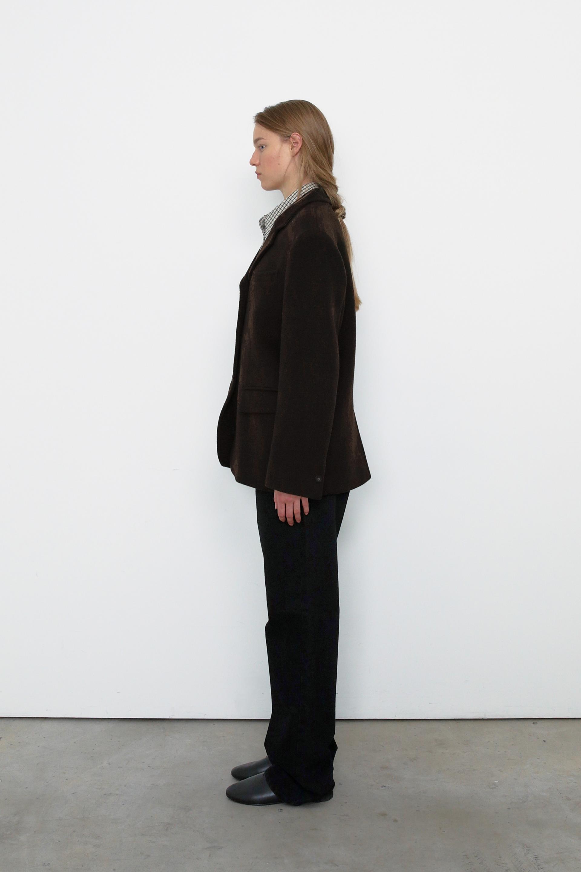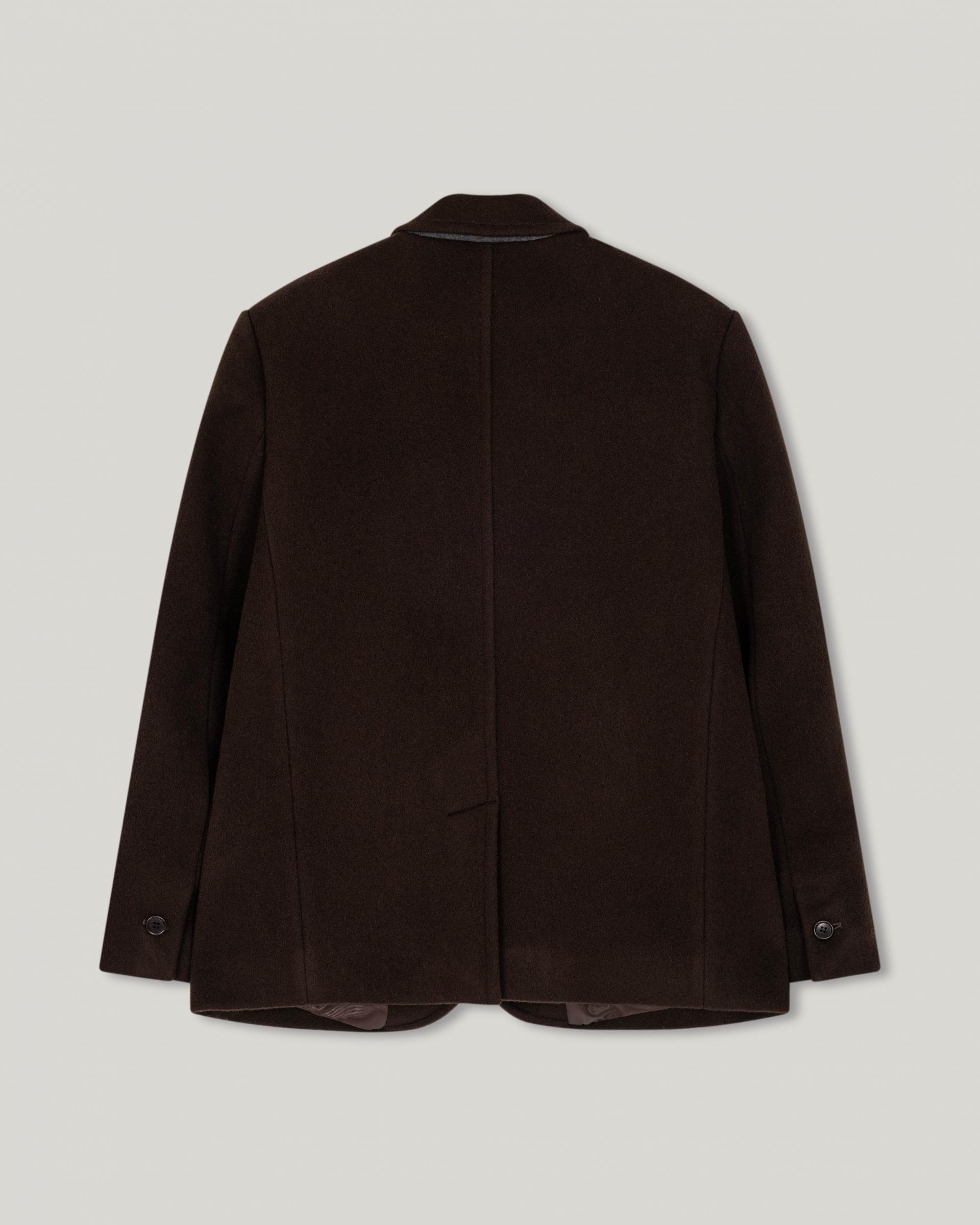 캐시미어가 함유된 하프 기장의 자켓으로, 부드러운 울 텍스쳐와 터치감을 자랑합니다.