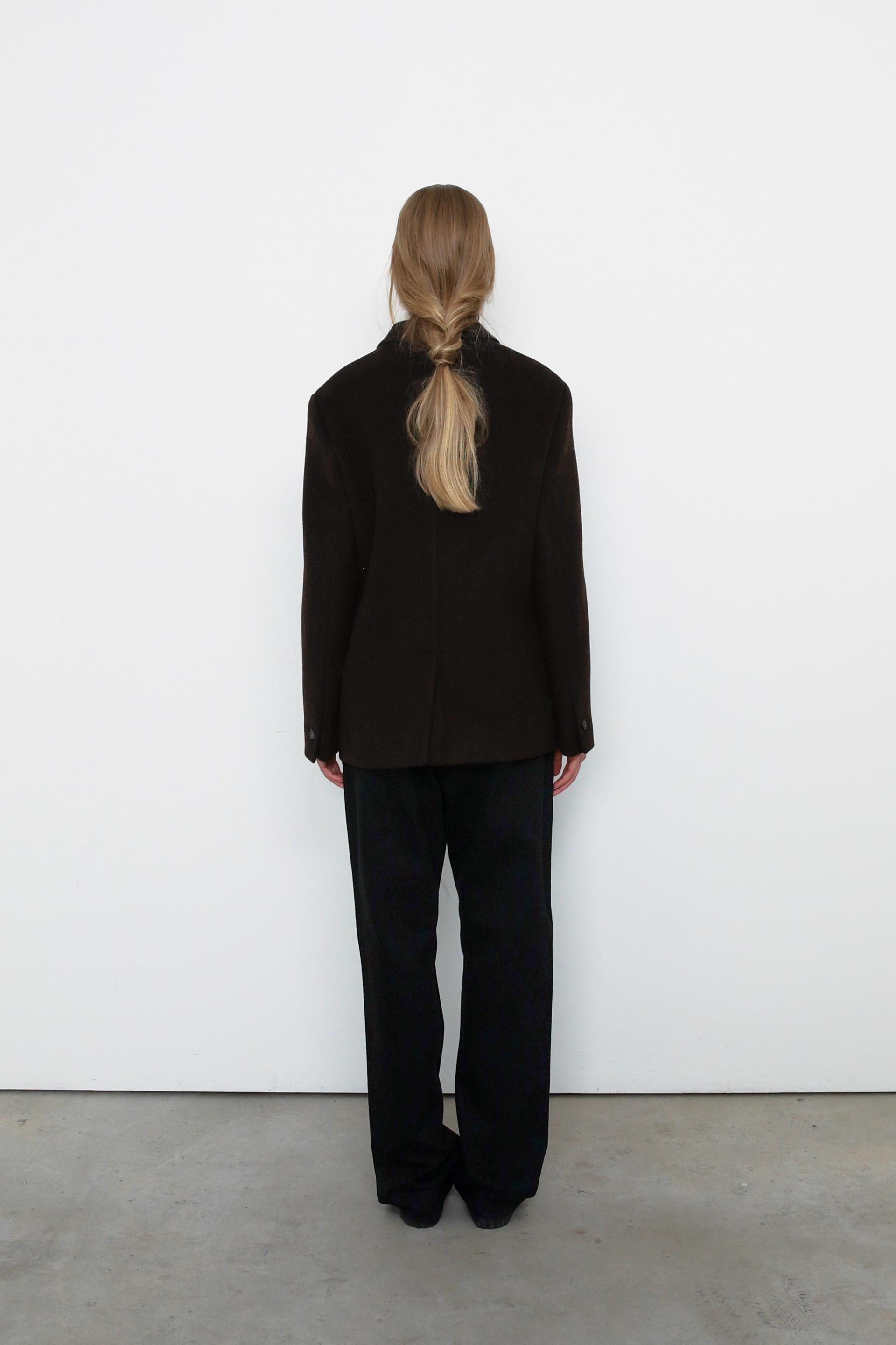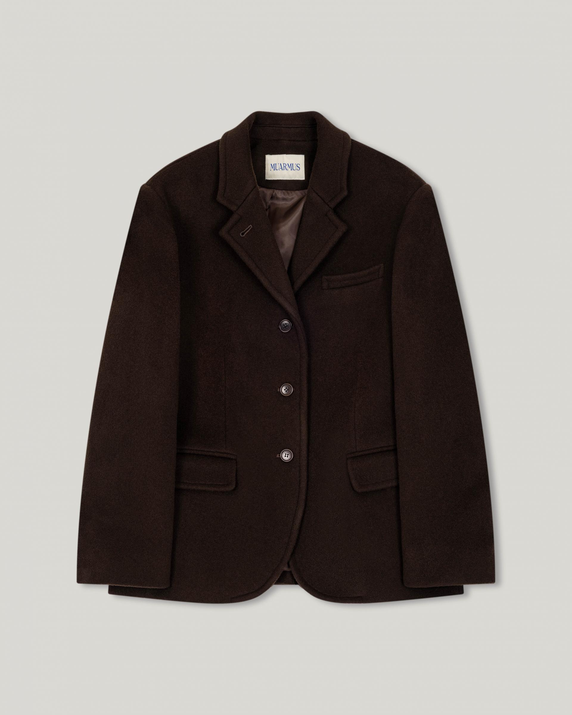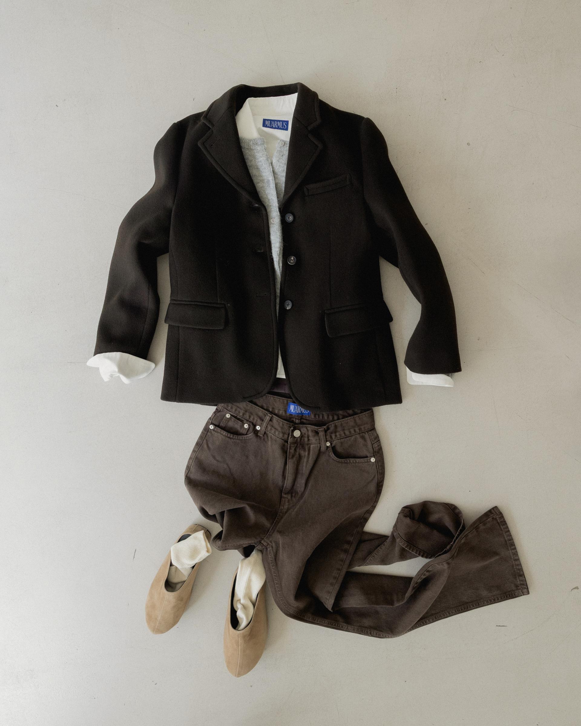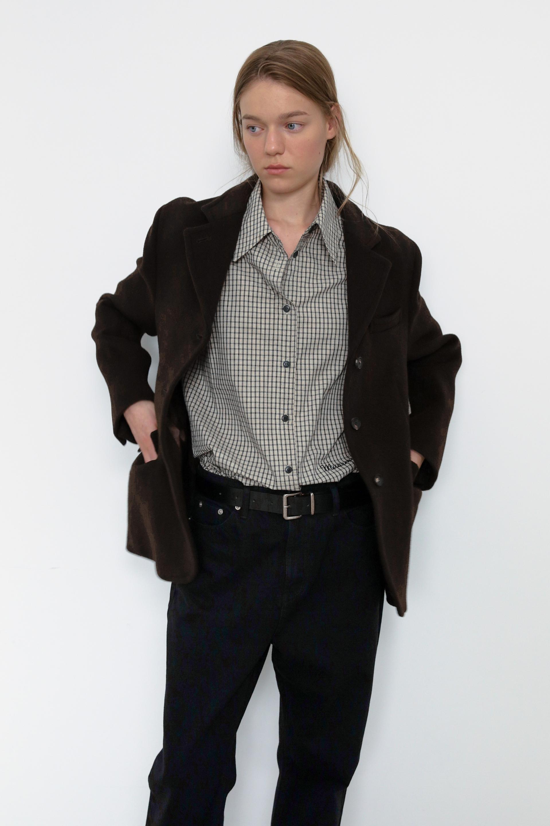 캐시미어가 함유된 하프 기장의 자켓으로, 부드러운 울 텍스쳐와 터치감을 자랑합니다.