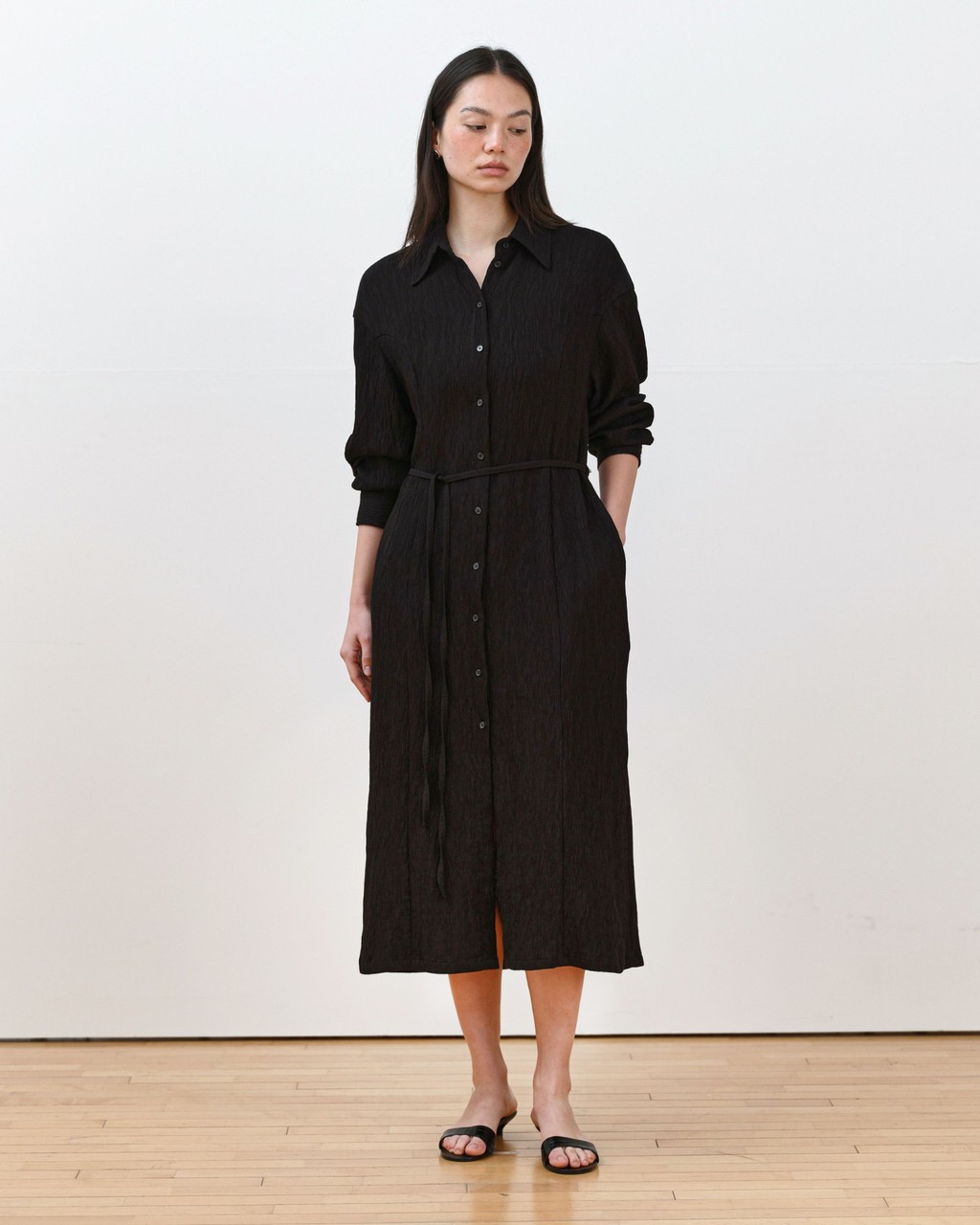 우아하고 세련된 실루엣을 완성하는 미에 플리츠 벨트 드레스입니다.