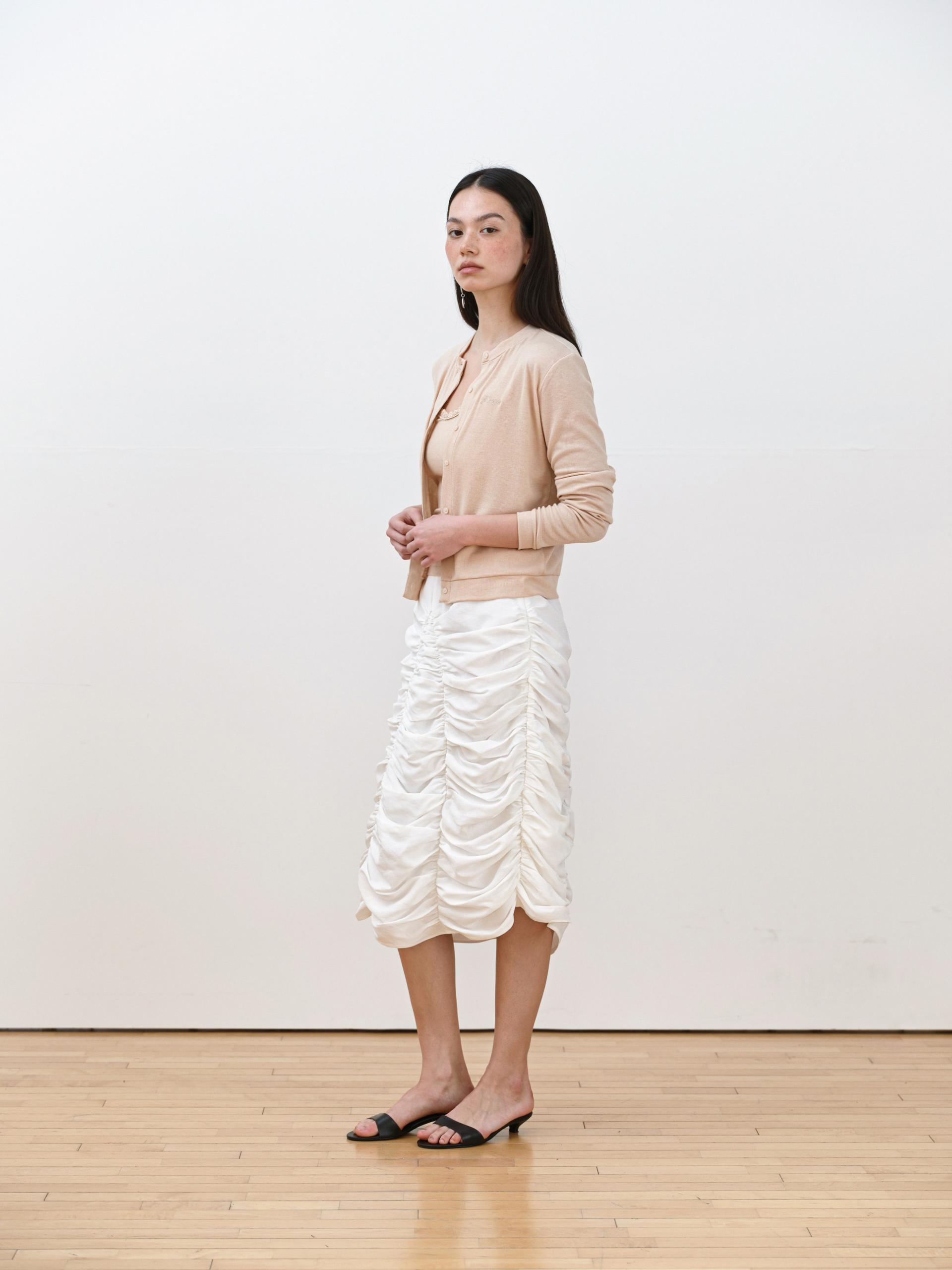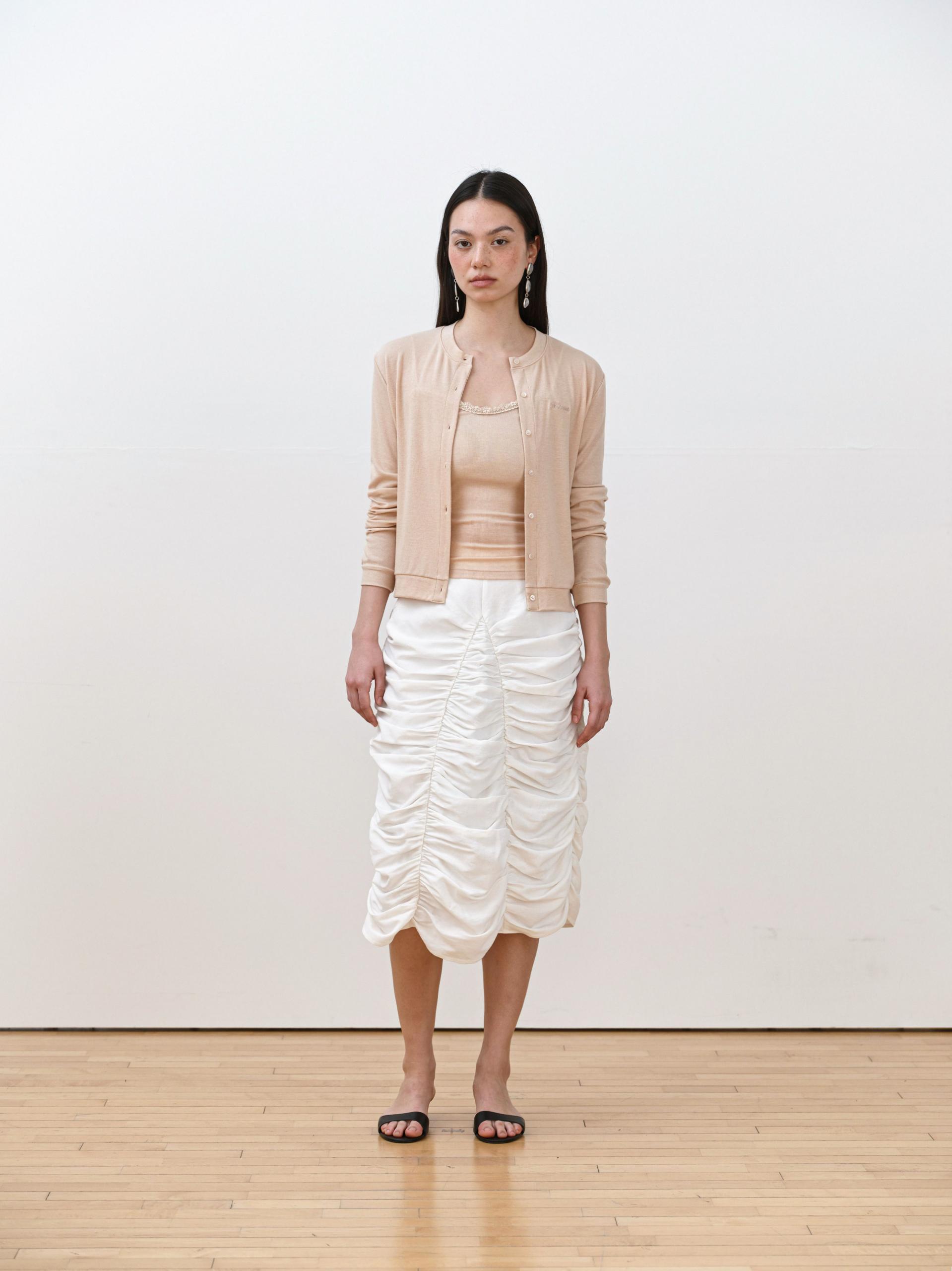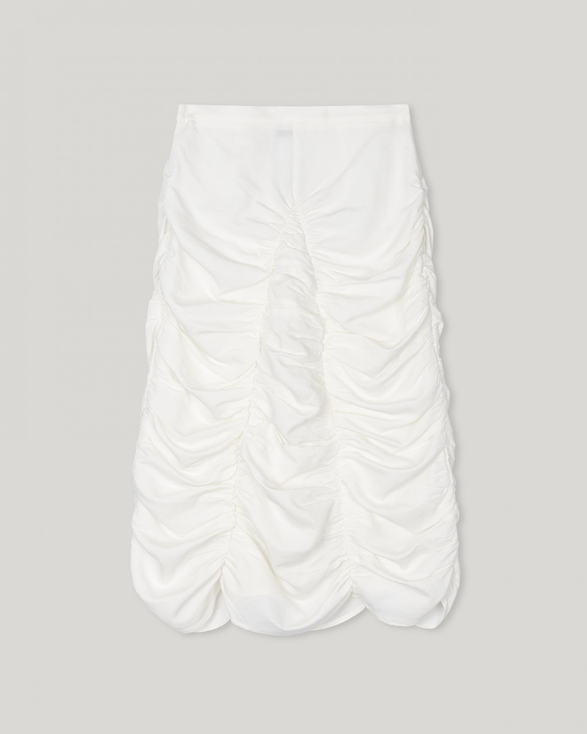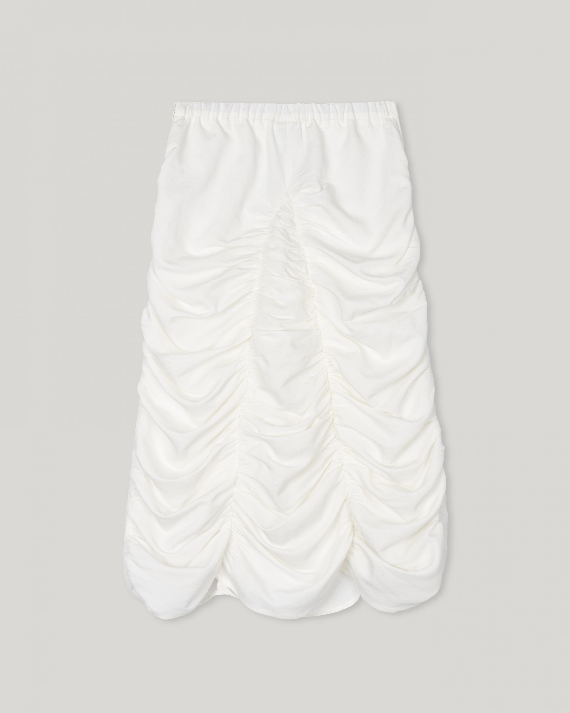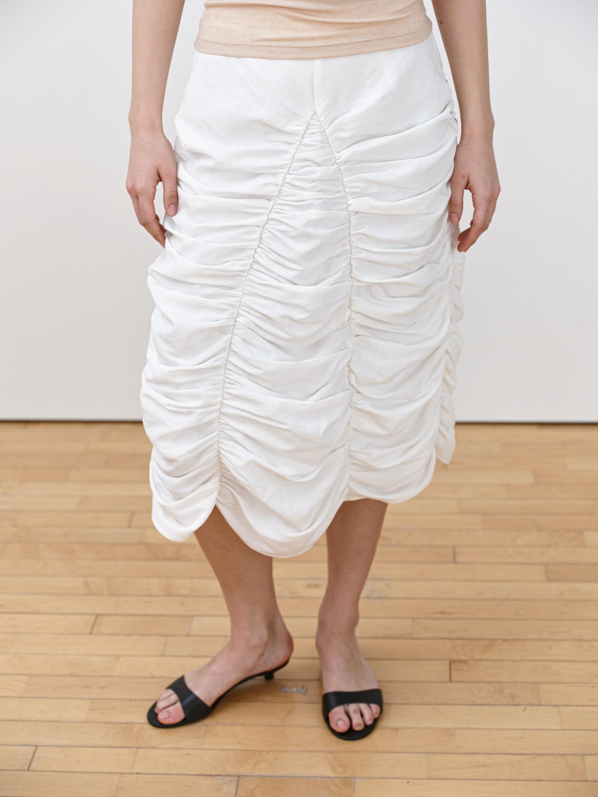 풍성하게 잡힌 셔링 디테일이 입체적인 볼륨감을 만들어주는 미디 스커트입니다.