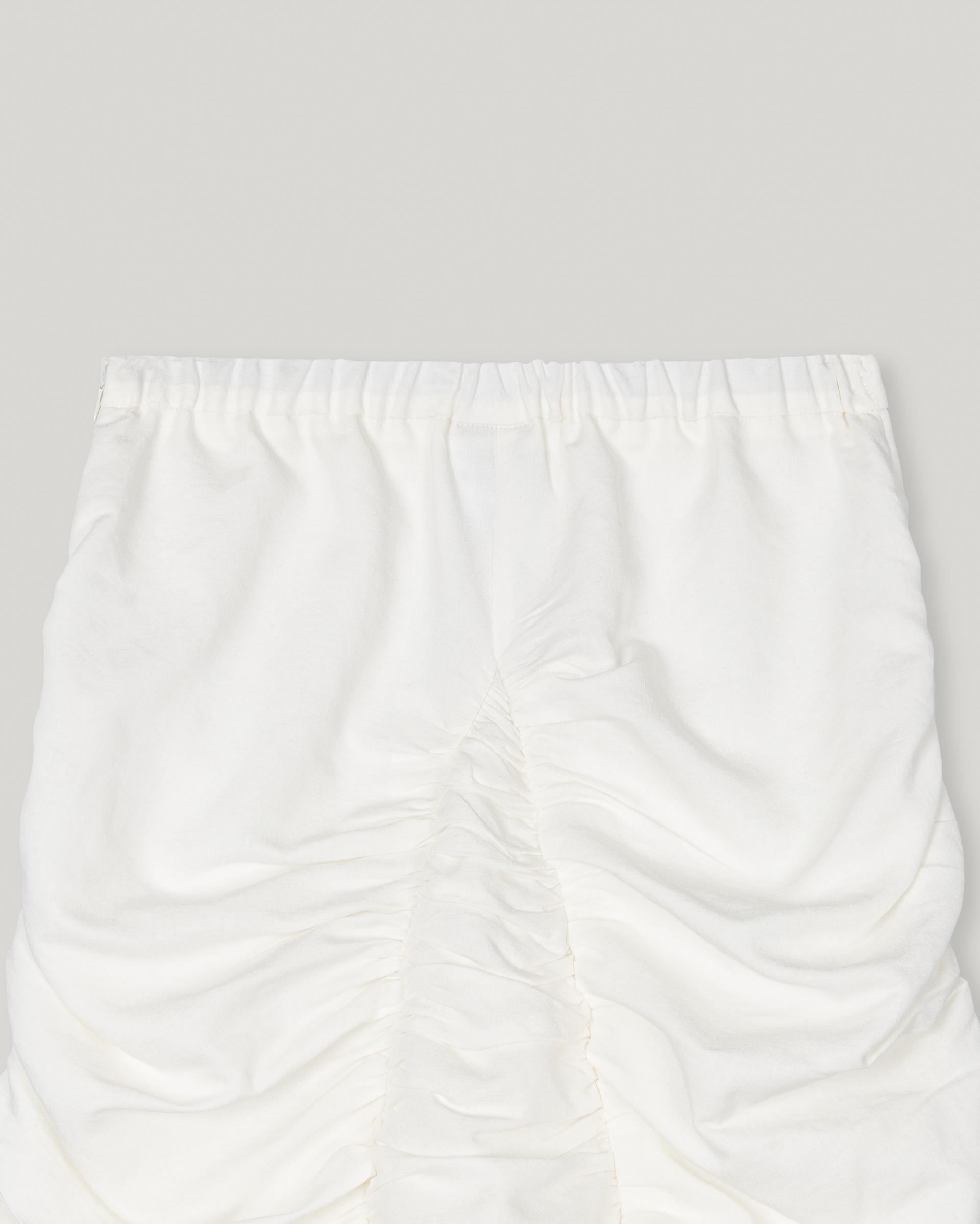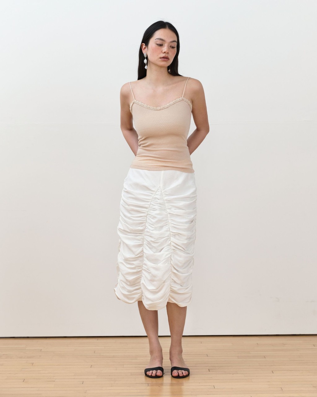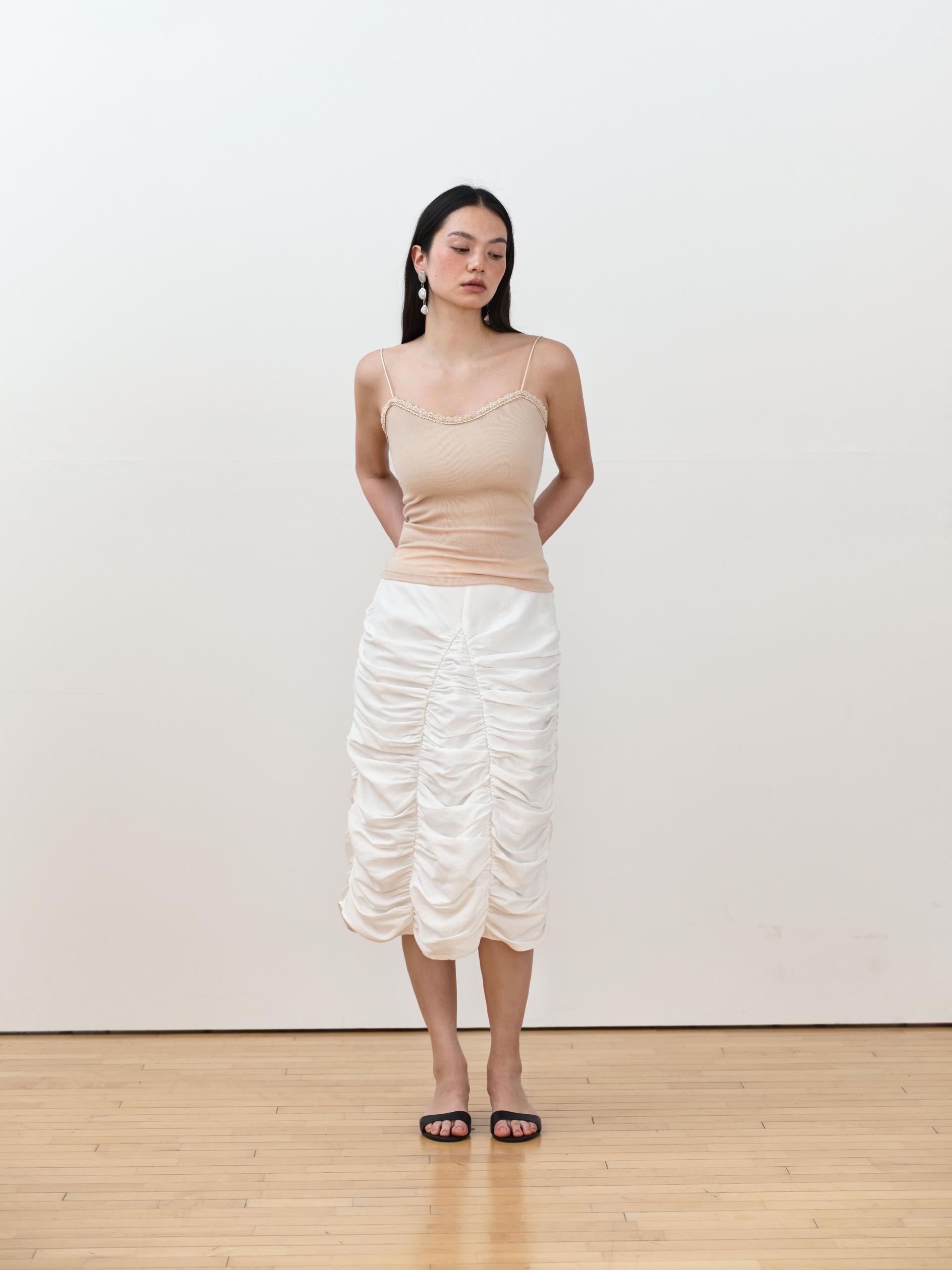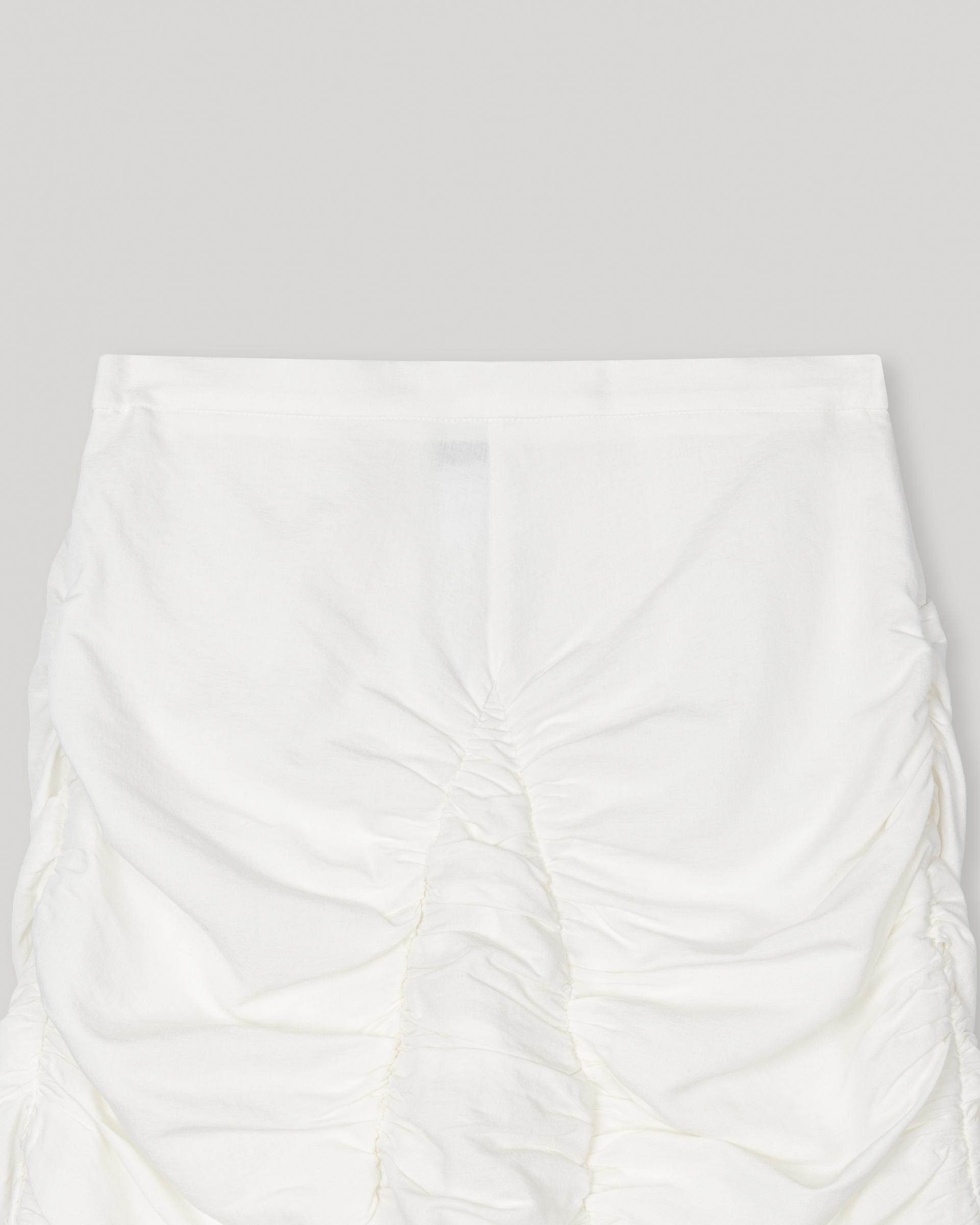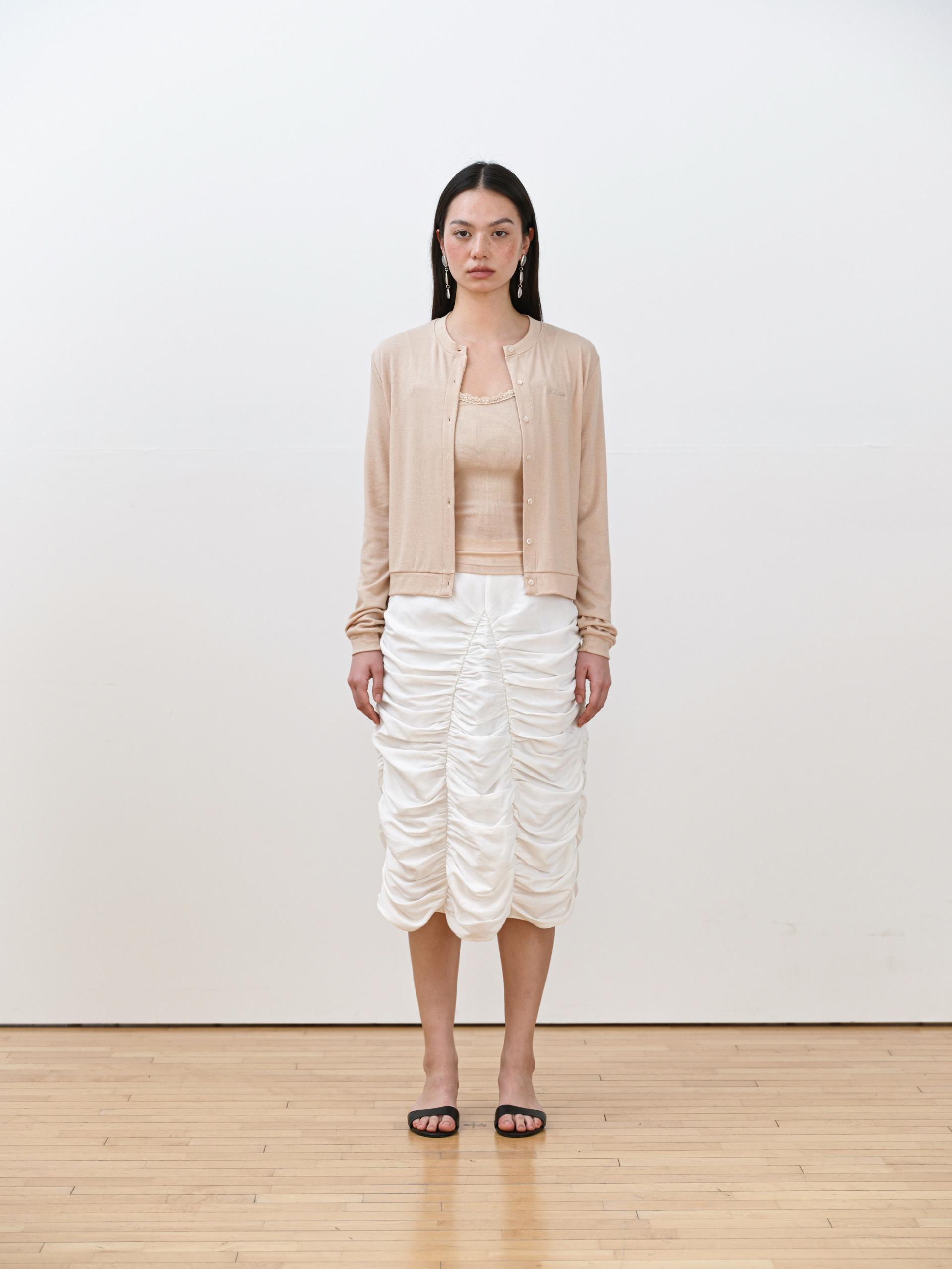 풍성하게 잡힌 셔링 디테일이 입체적인 볼륨감을 만들어주는 미디 스커트입니다.