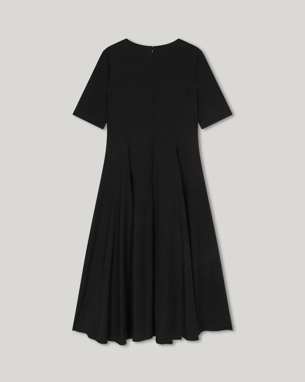 라운드 네크라인으로 여성스러운 무드를 연출하였으며 자연스럽게 훌지는 실루엣의 드레스 라인으로 편안하게 연출이 가능합니다.