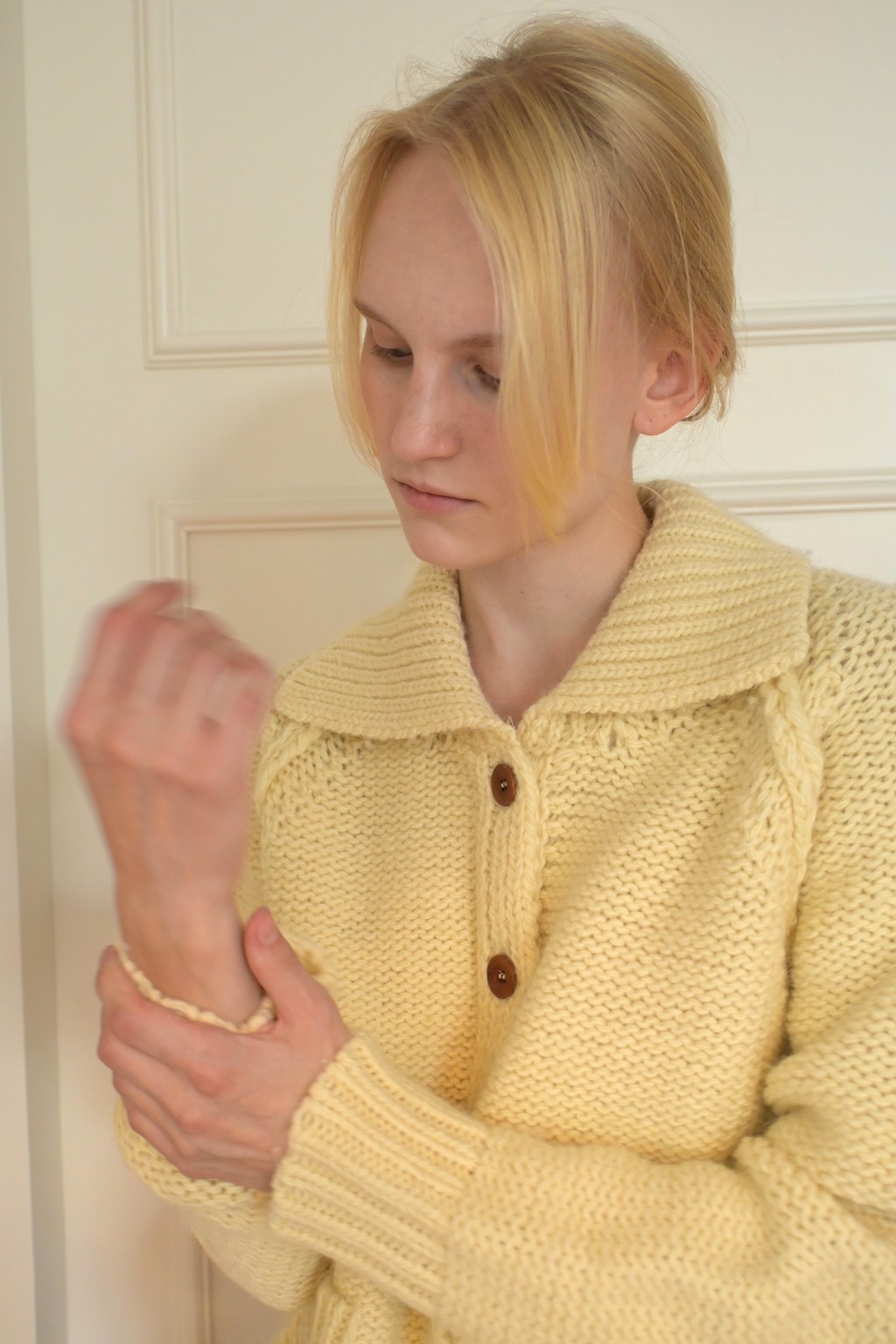 소재감이 느껴지며 뛰어난 보온성을 자랑합니다. 우드 단추 컬러 포인트로
