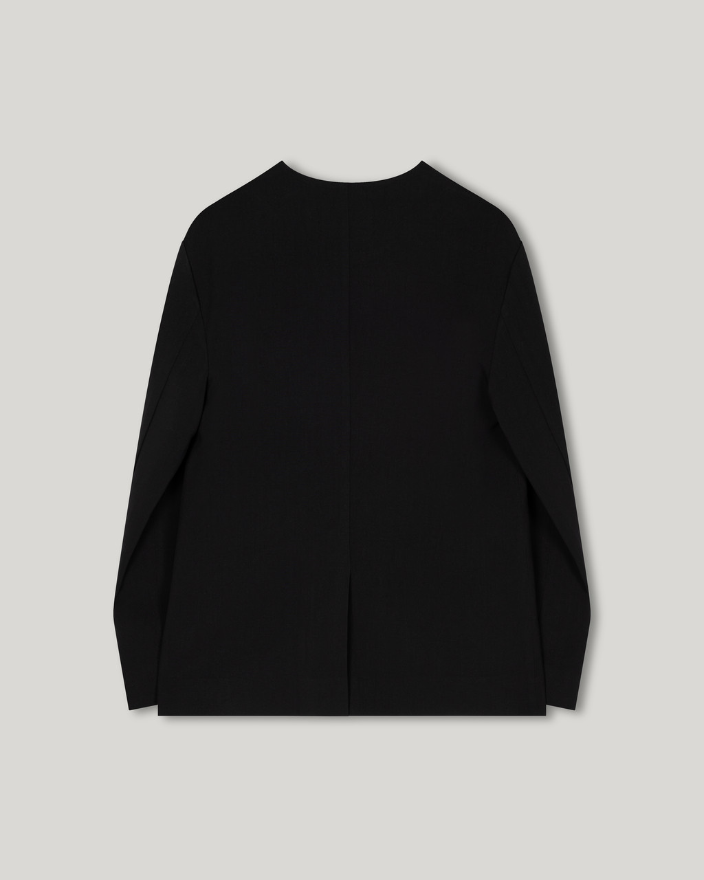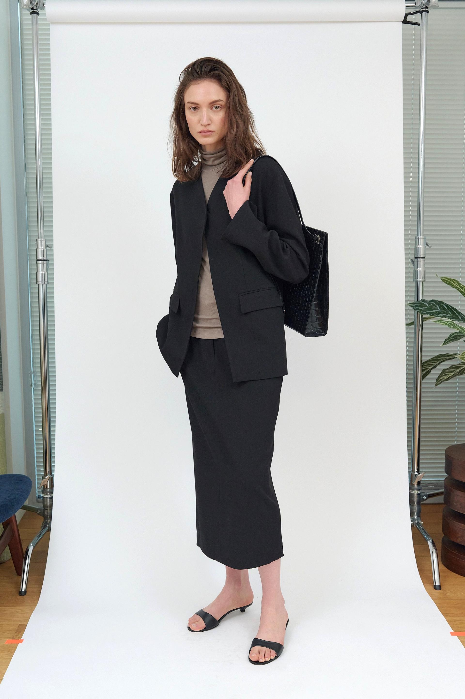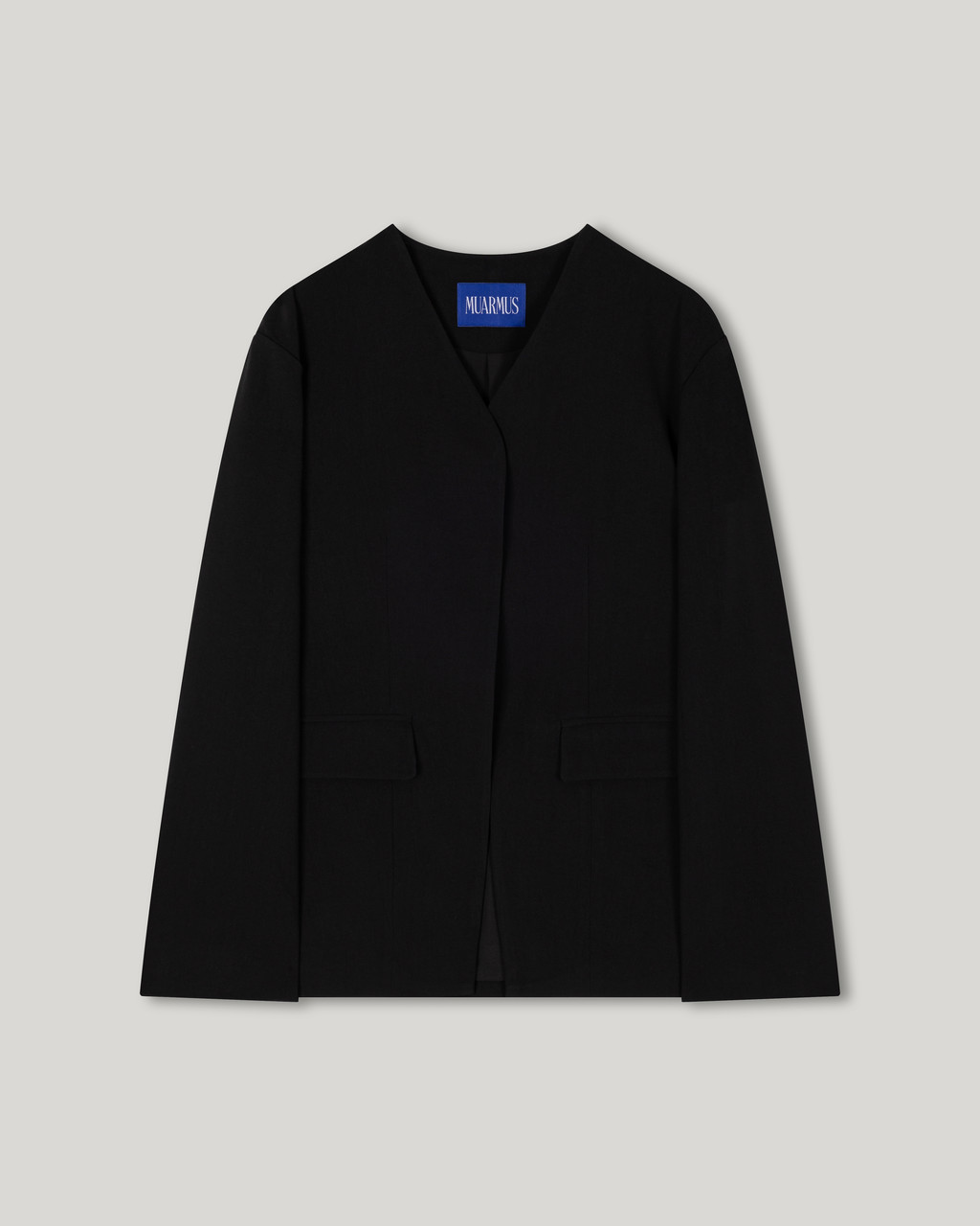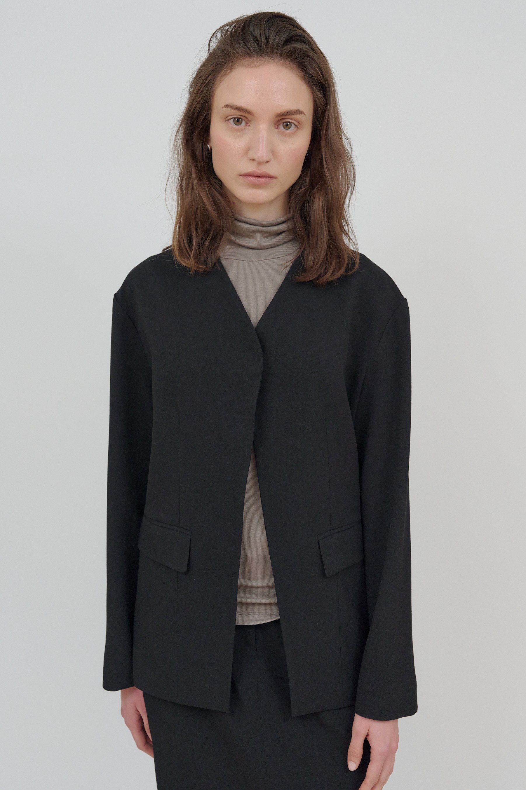 세련된 미니멀리즘이 돋보이는 자켓입니다. 깔끔한 노 카라 디자인으로 트렌디 하면서도 클래식한 무드를 연출하며,