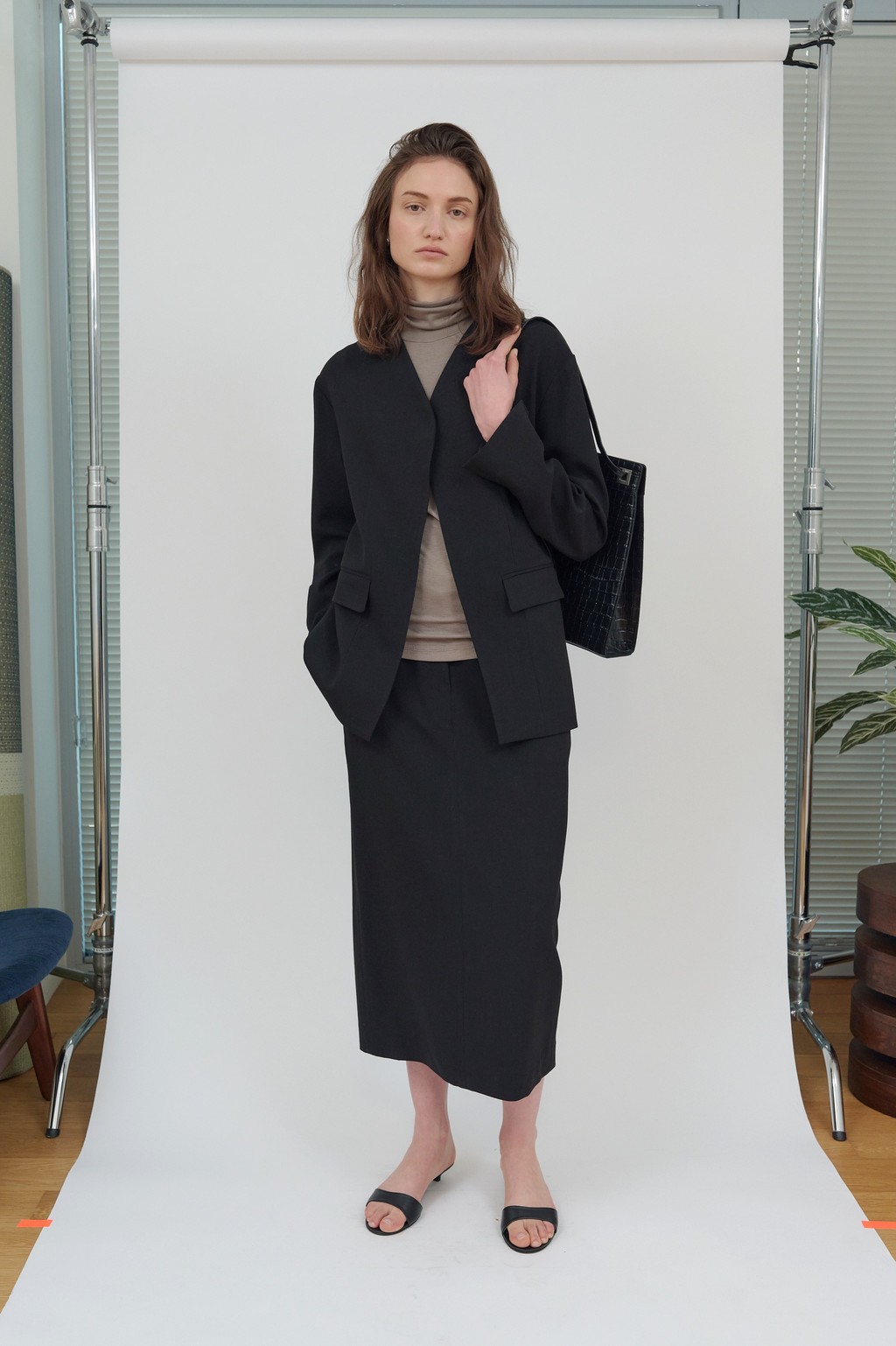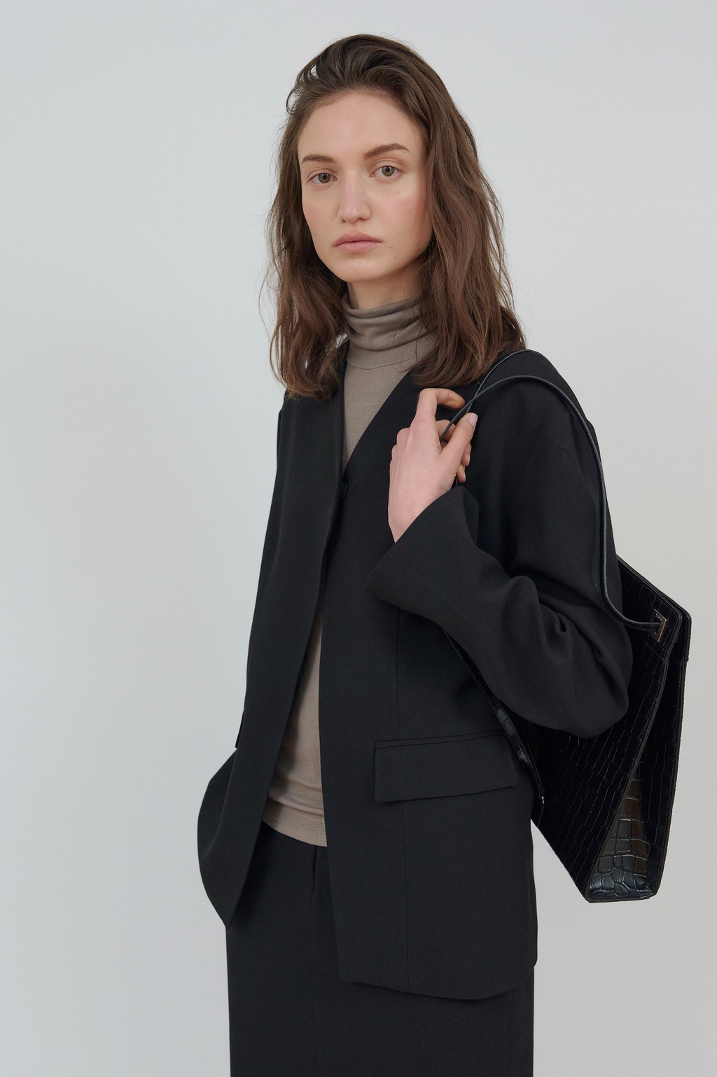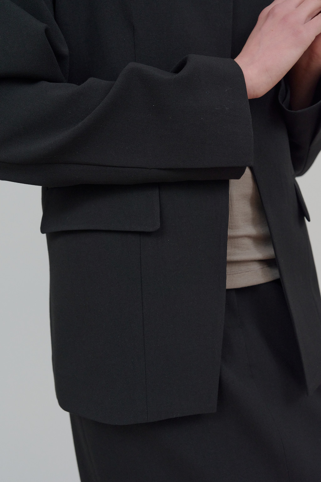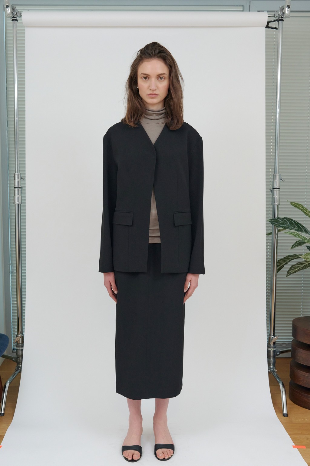 세련된 미니멀리즘이 돋보이는 자켓입니다. 깔끔한 노 카라 디자인으로 트렌디 하면서도 클래식한 무드를 연출하며,