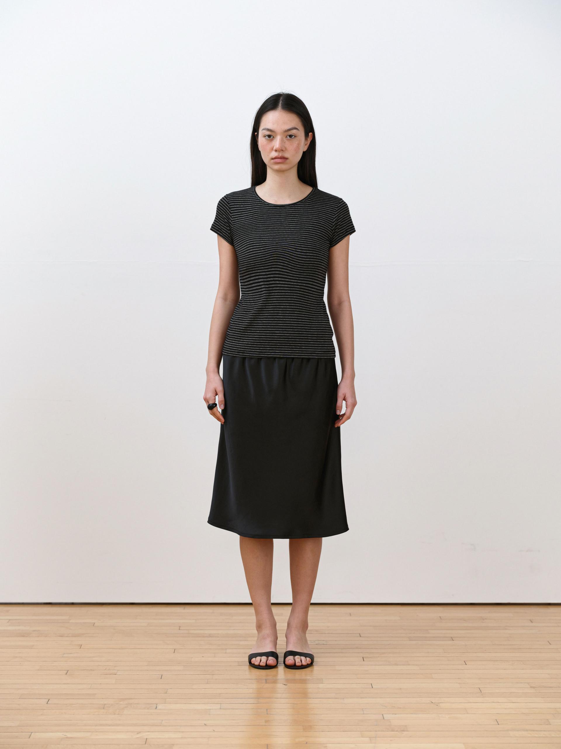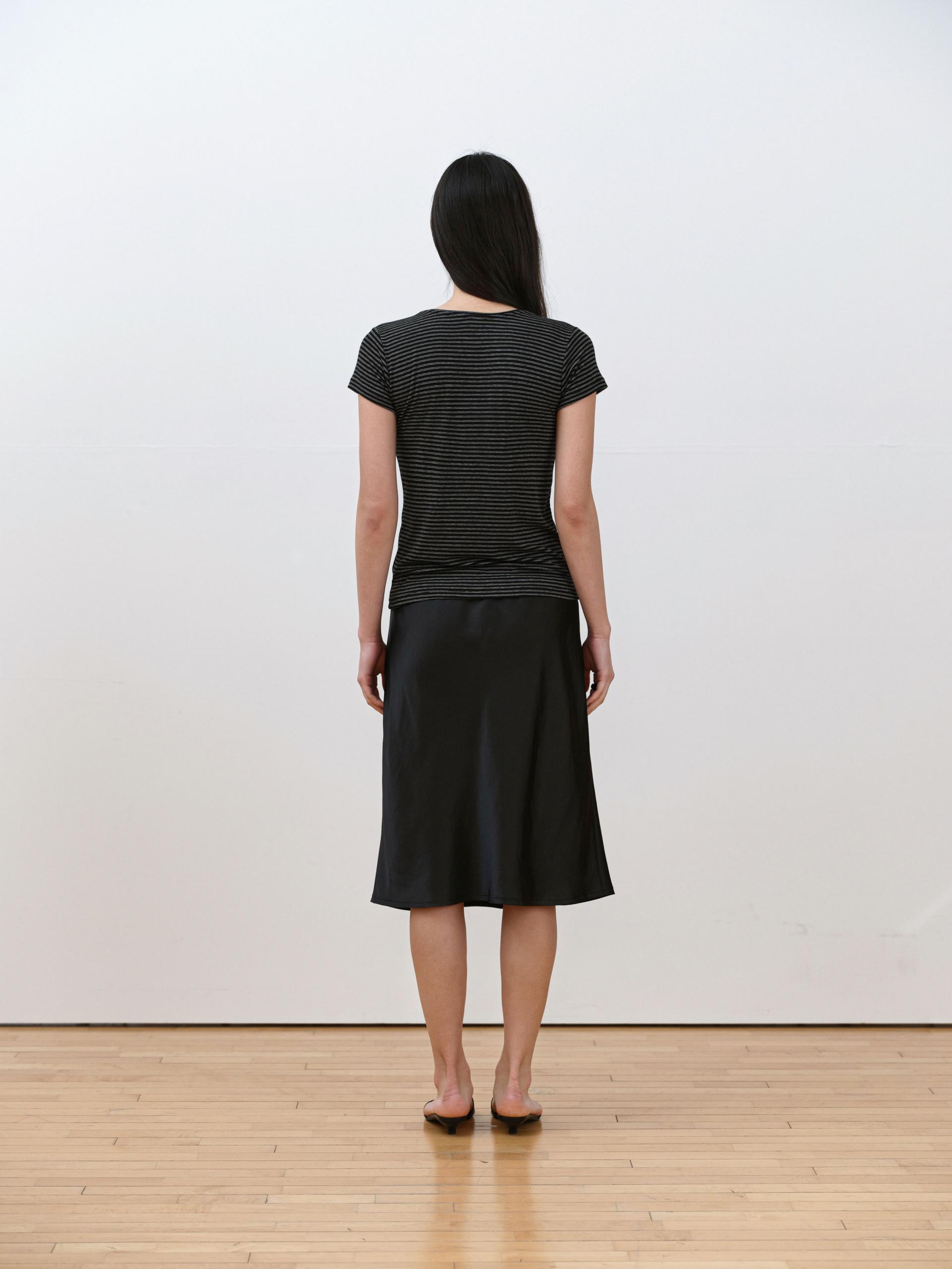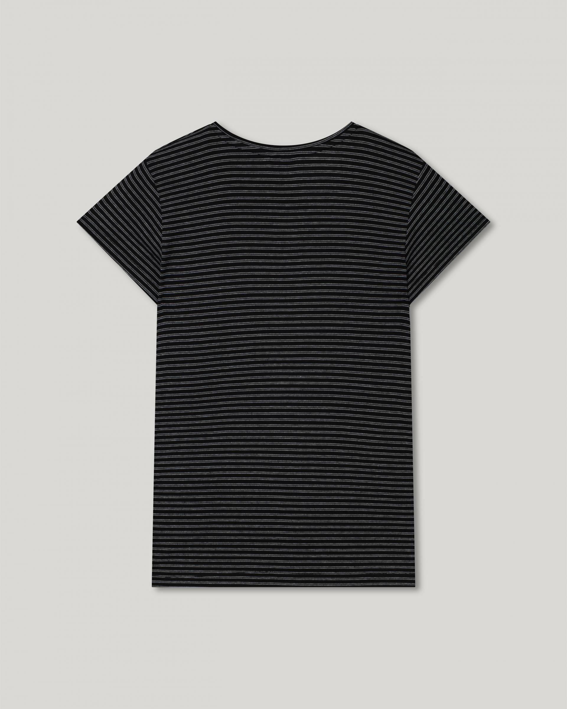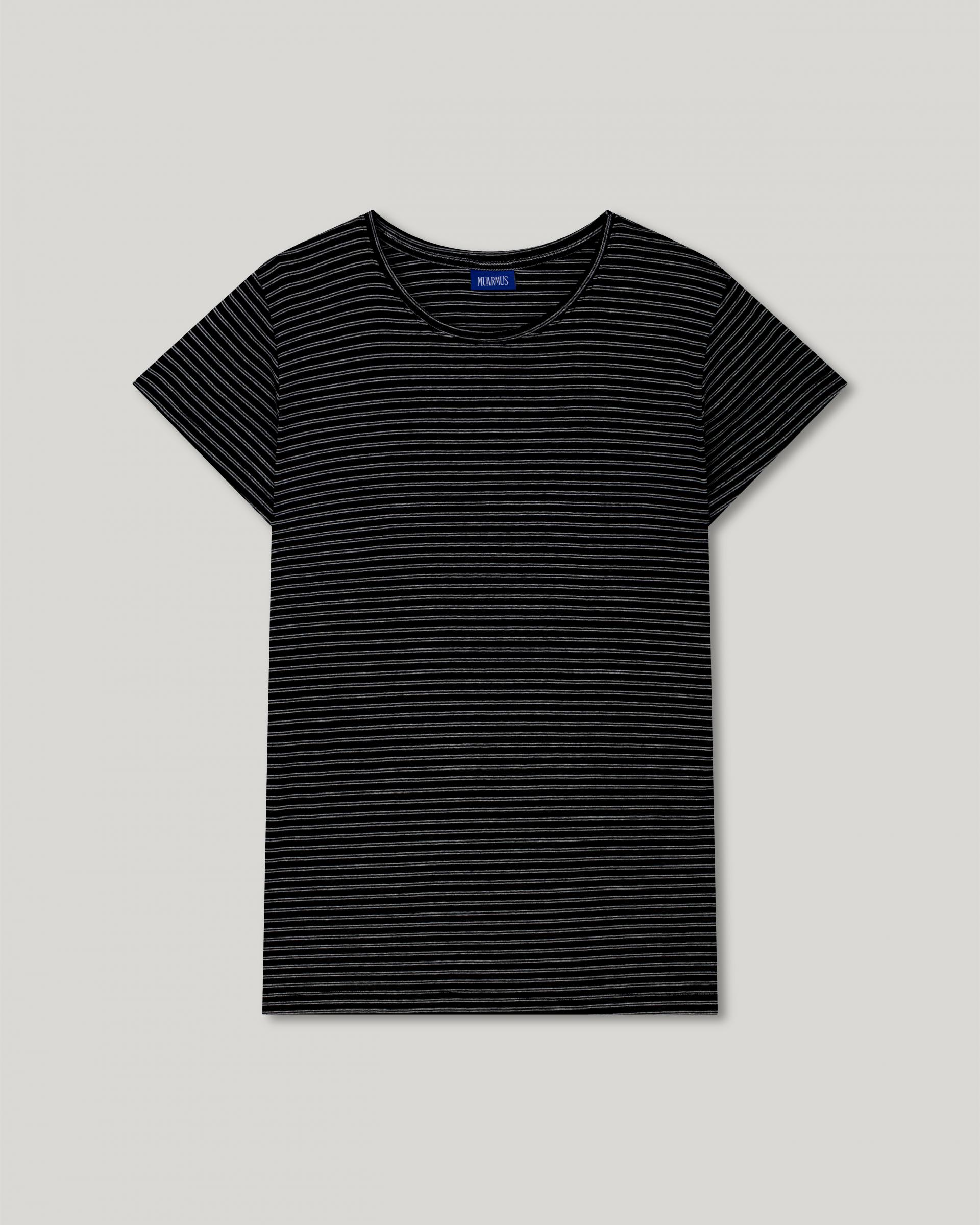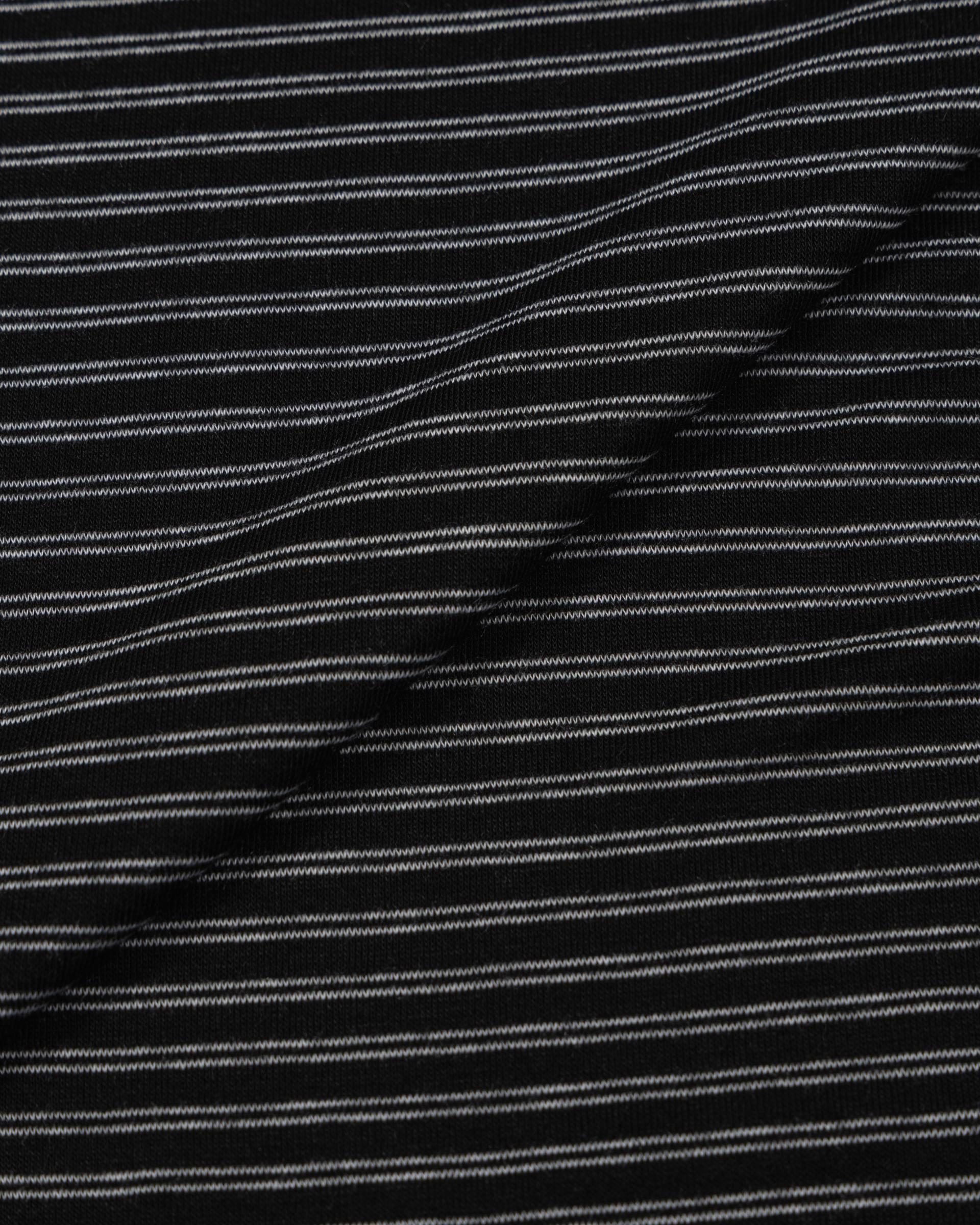 부드럽게 흐르는 레이온 혼방 원단으로 제작된 슬림핏 스트라이프 티셔츠입니다.