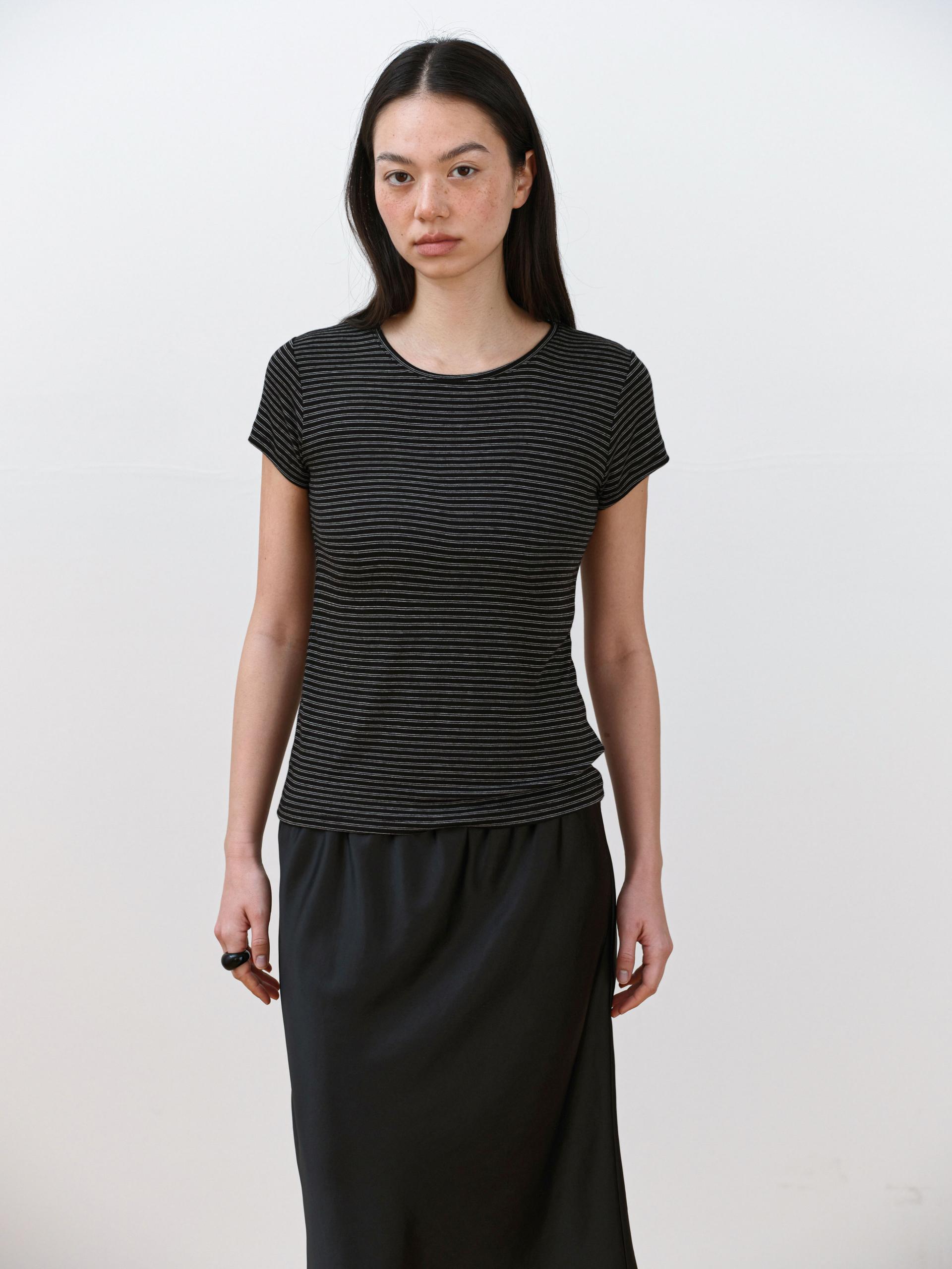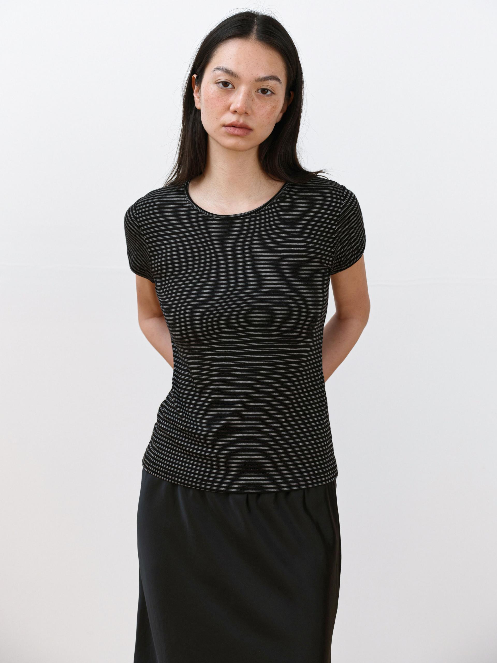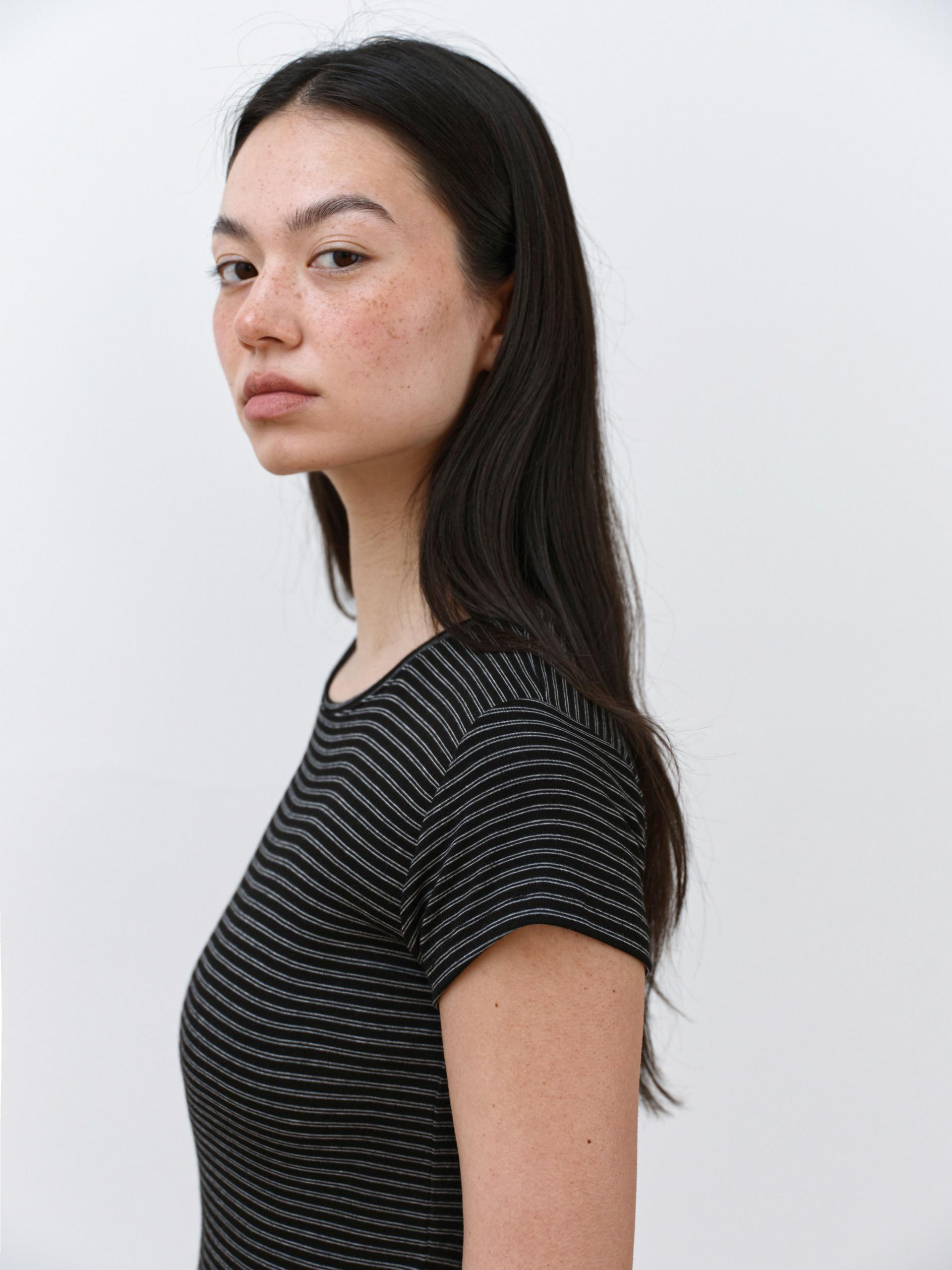 부드럽게 흐르는 레이온 혼방 원단으로 제작된 슬림핏 스트라이프 티셔츠입니다. 가볍고 신축성 좋은 소재로, 단독은 물론 이너로도 활용하기 좋습니다. 얇은 골지조직이 바디라인을 자연스럽게 잡아주며 여리한 실루엣을 완성합니다.