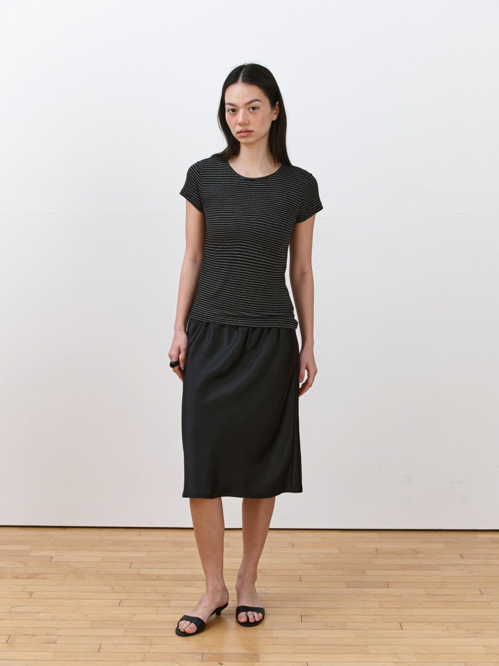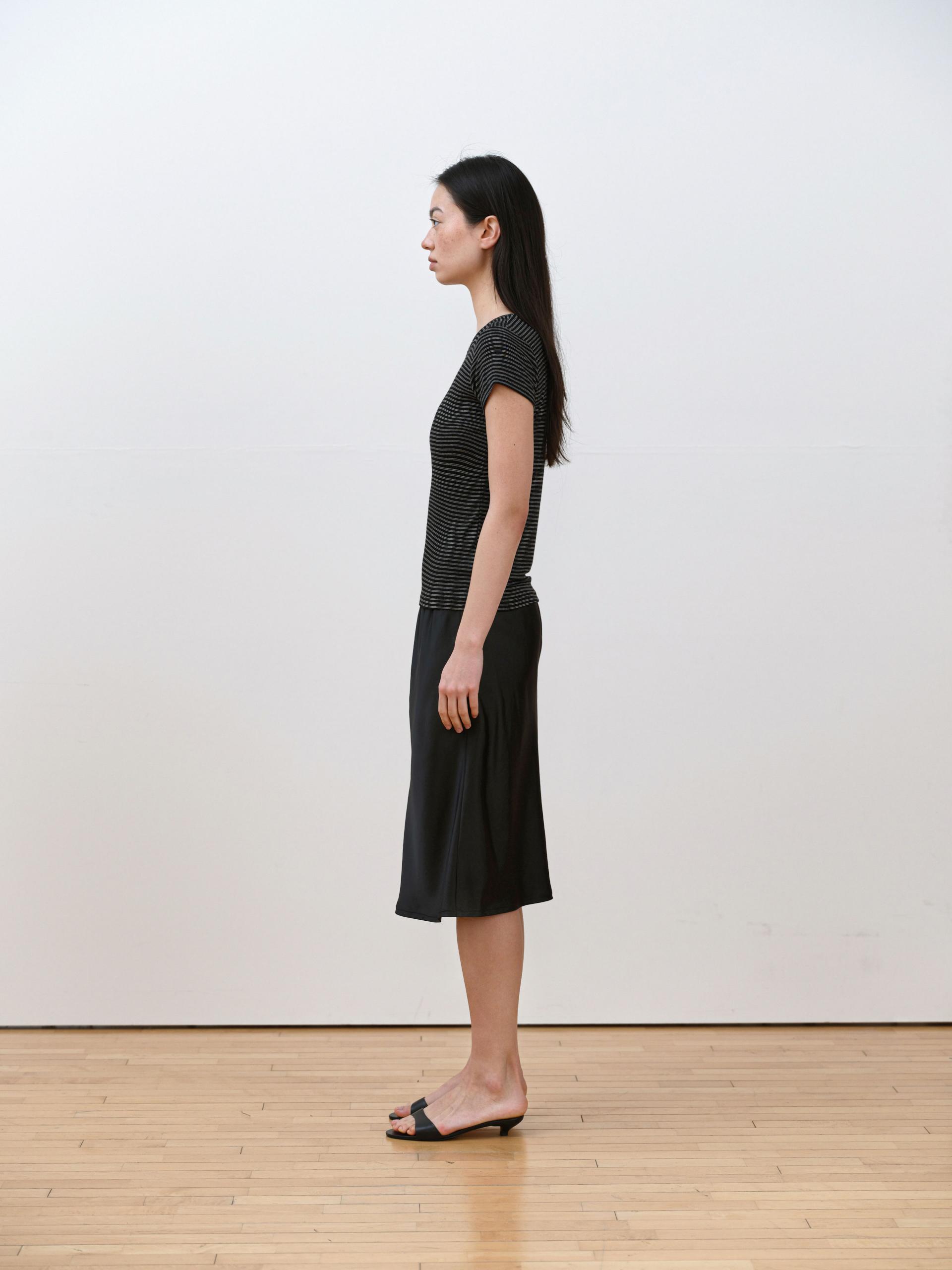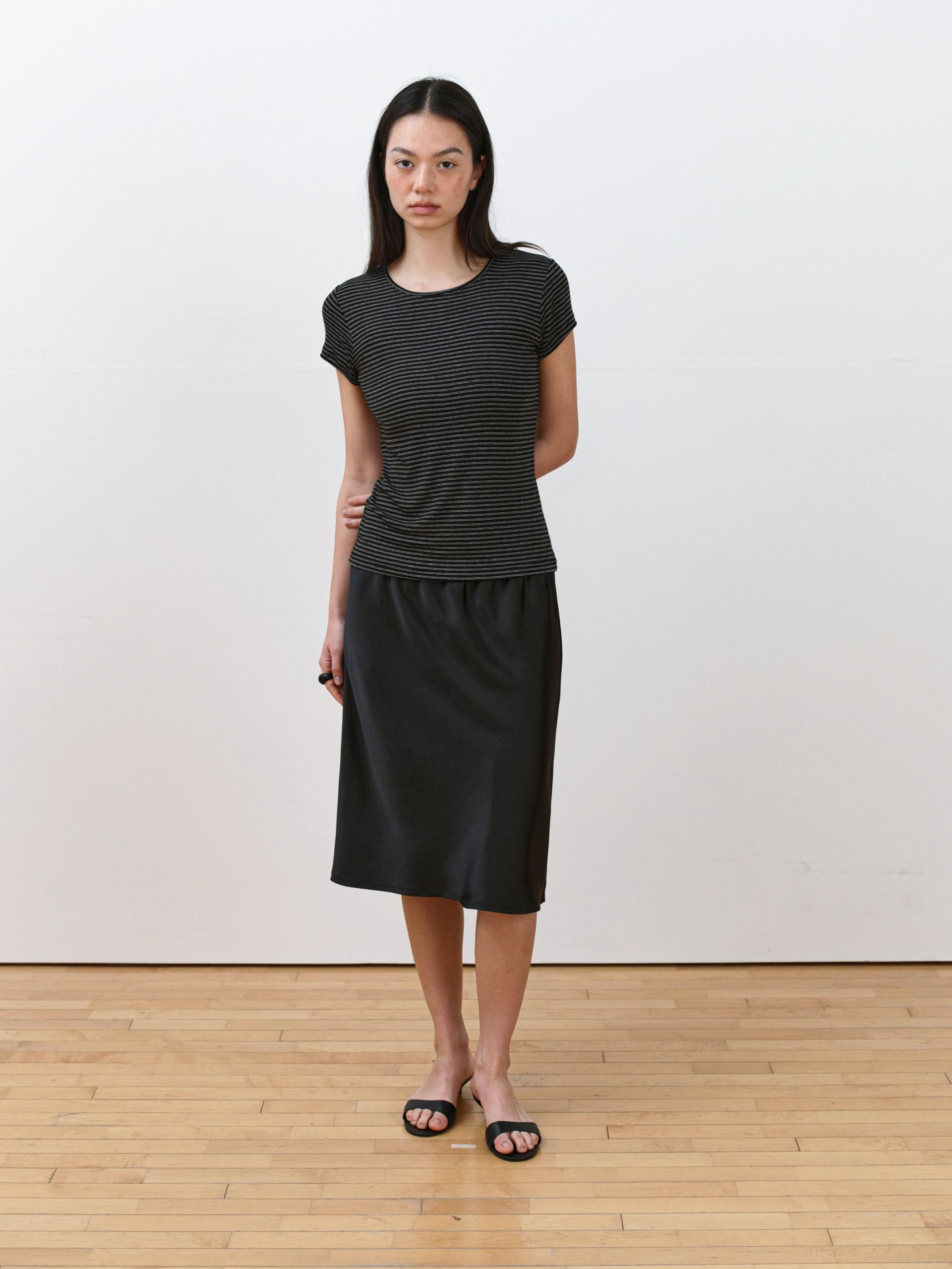 부드럽게 흐르는 레이온 혼방 원단으로 제작된 슬림핏 스트라이프 티셔츠입니다. 가볍고 신축성 좋은 소재로, 단독은 물론 이너로도 활용하기 좋습니다. 얇은 골지조직이 바디라인을 자연스럽게 잡아주며 여리한 실루엣을 완성합니다.