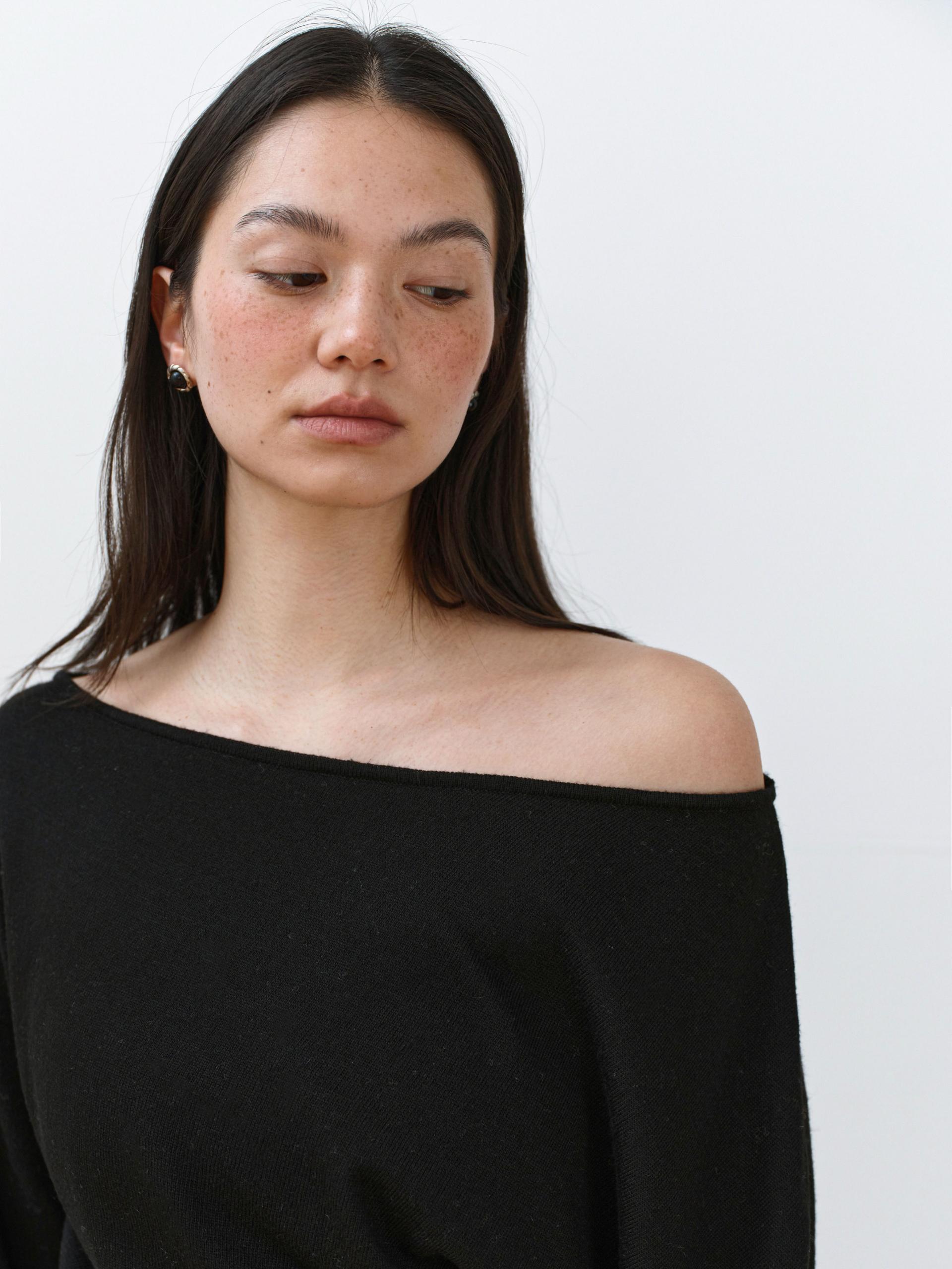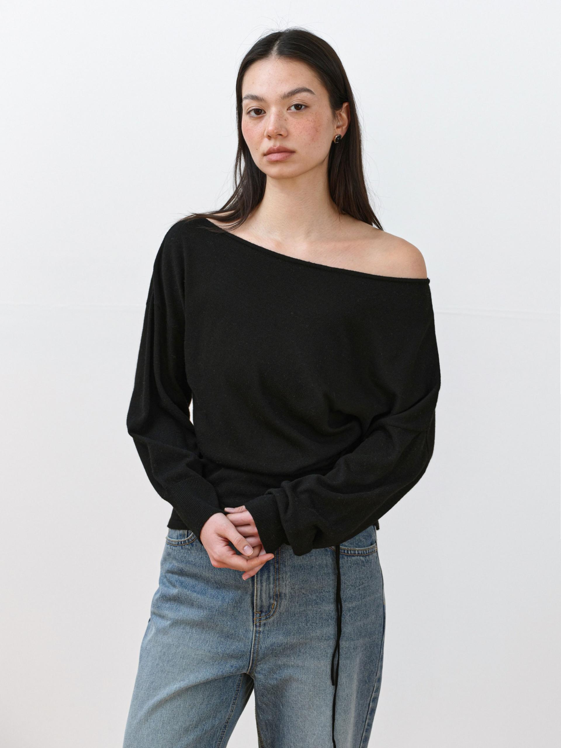 과하지 않은 오프숄더 실루엣이 여성스러운 무드를 완성해주는 니트 아이템입니다.