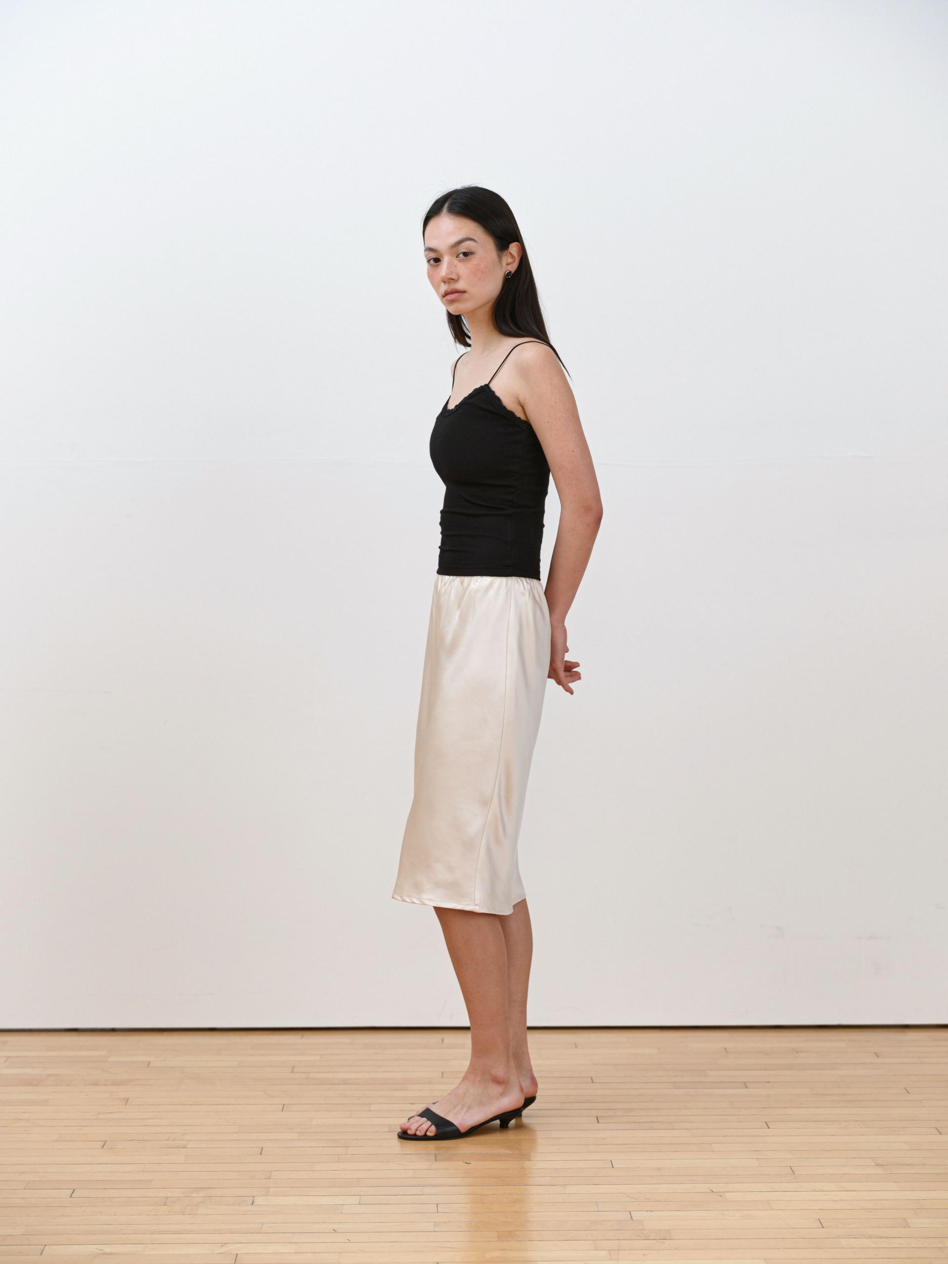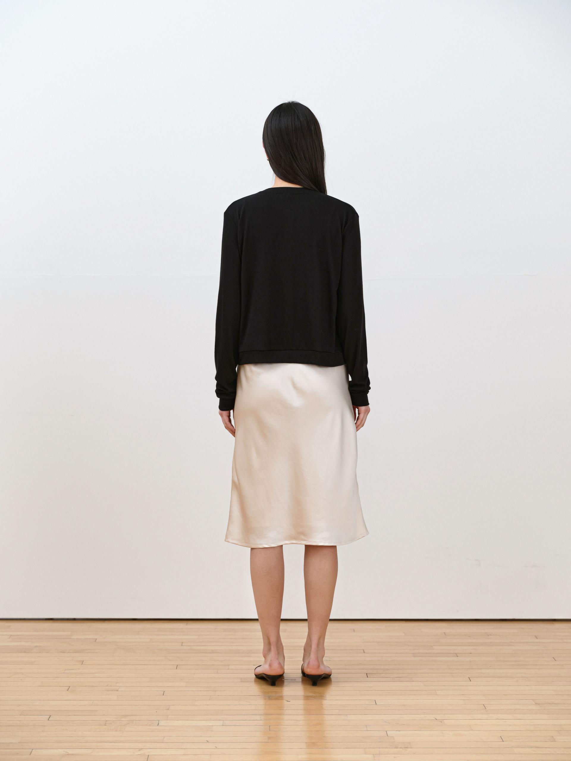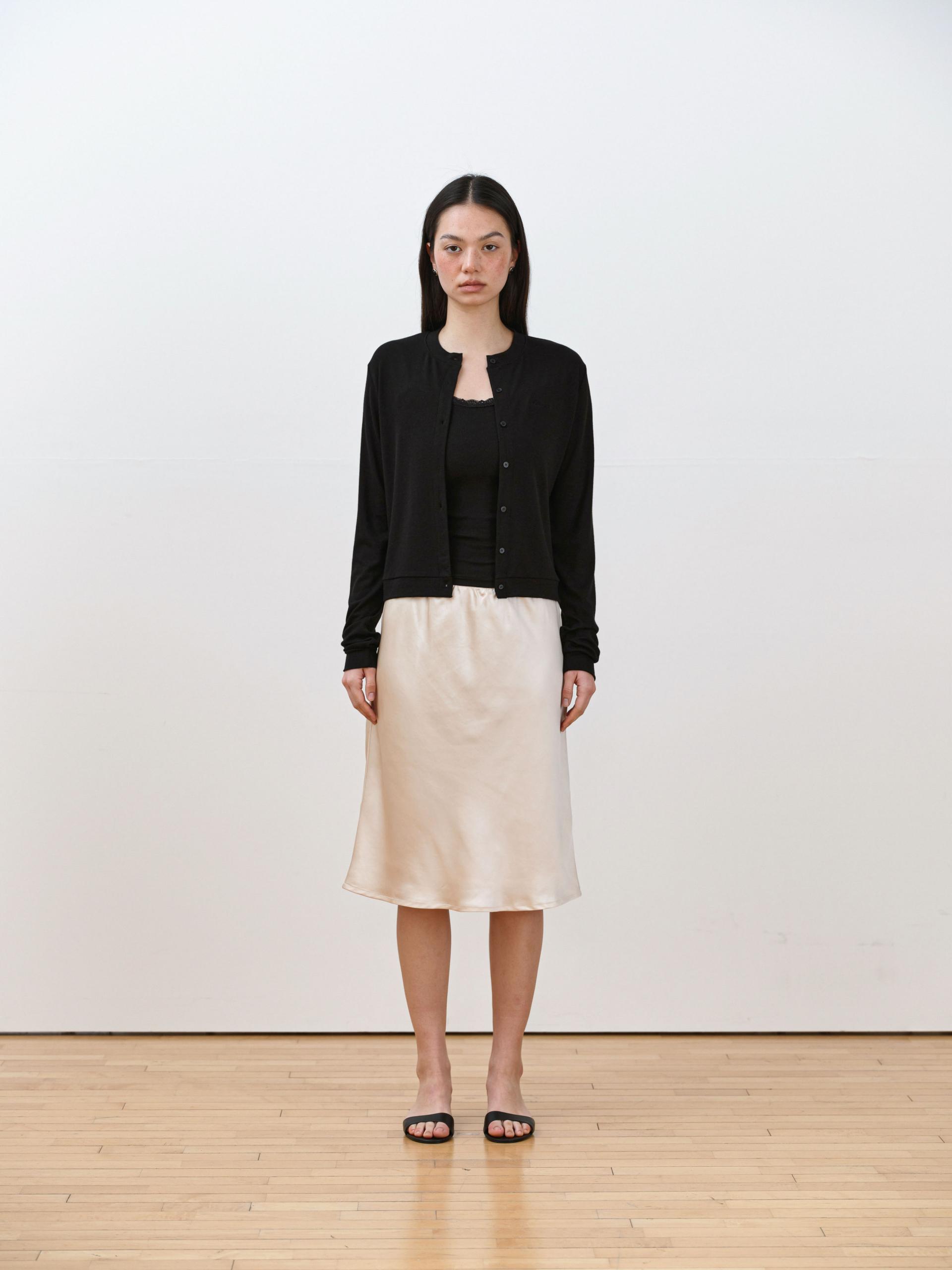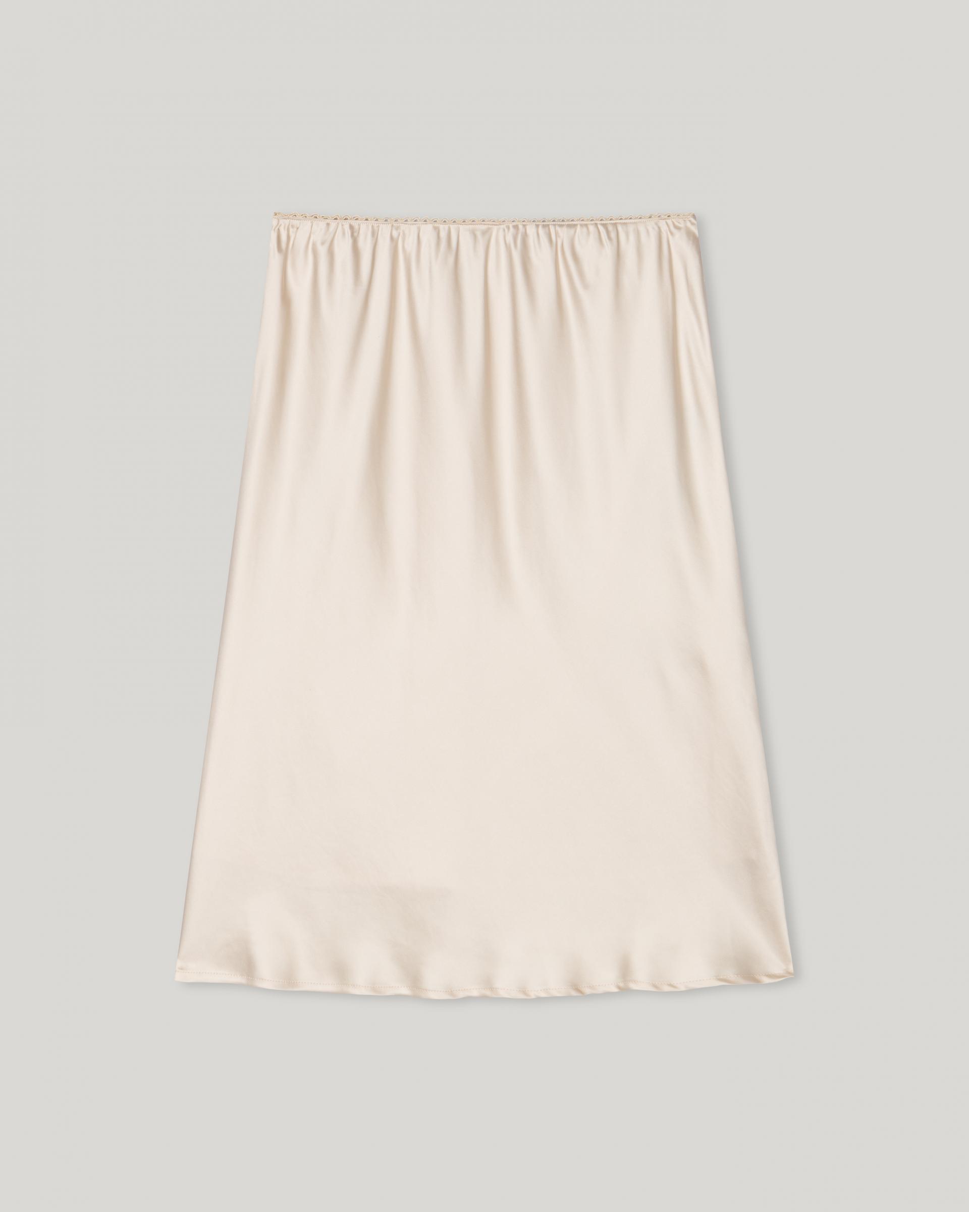 은은한 광택감이 느껴지는 새틴 텍스처와 자연스럽게 흐르는 드레이프 실루엣이