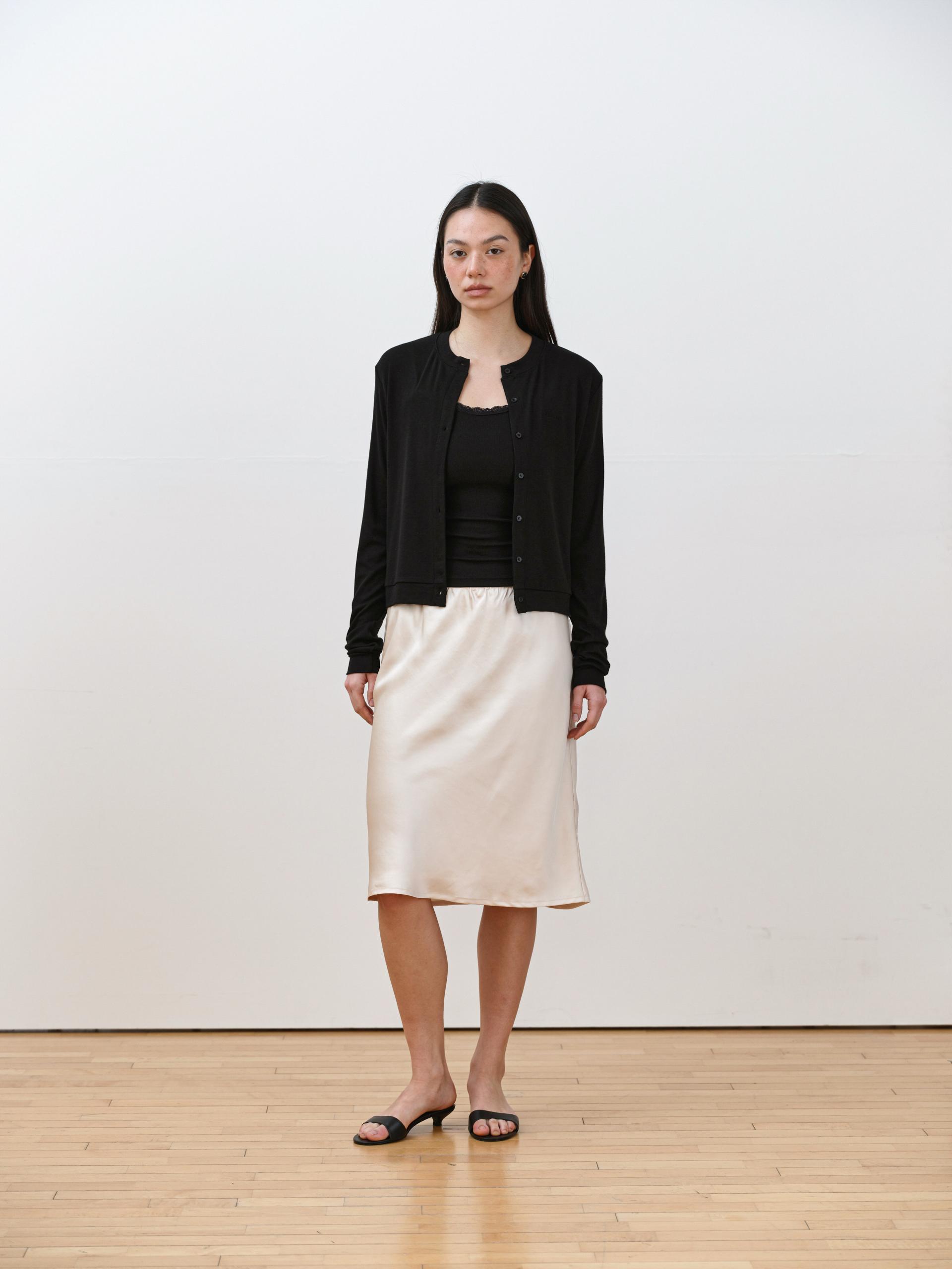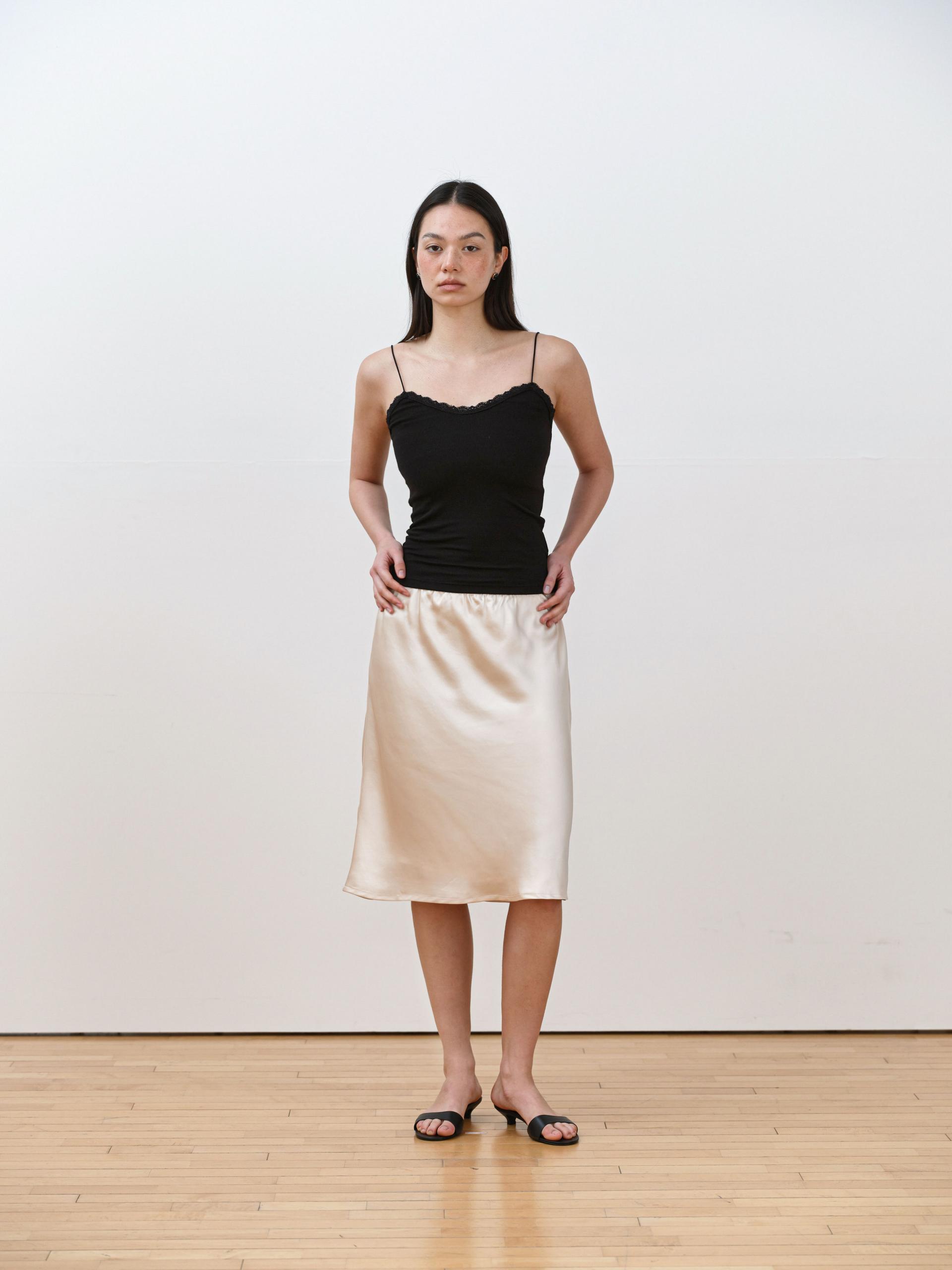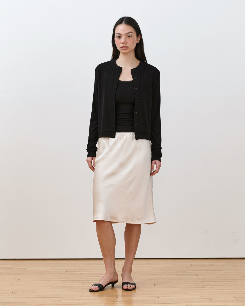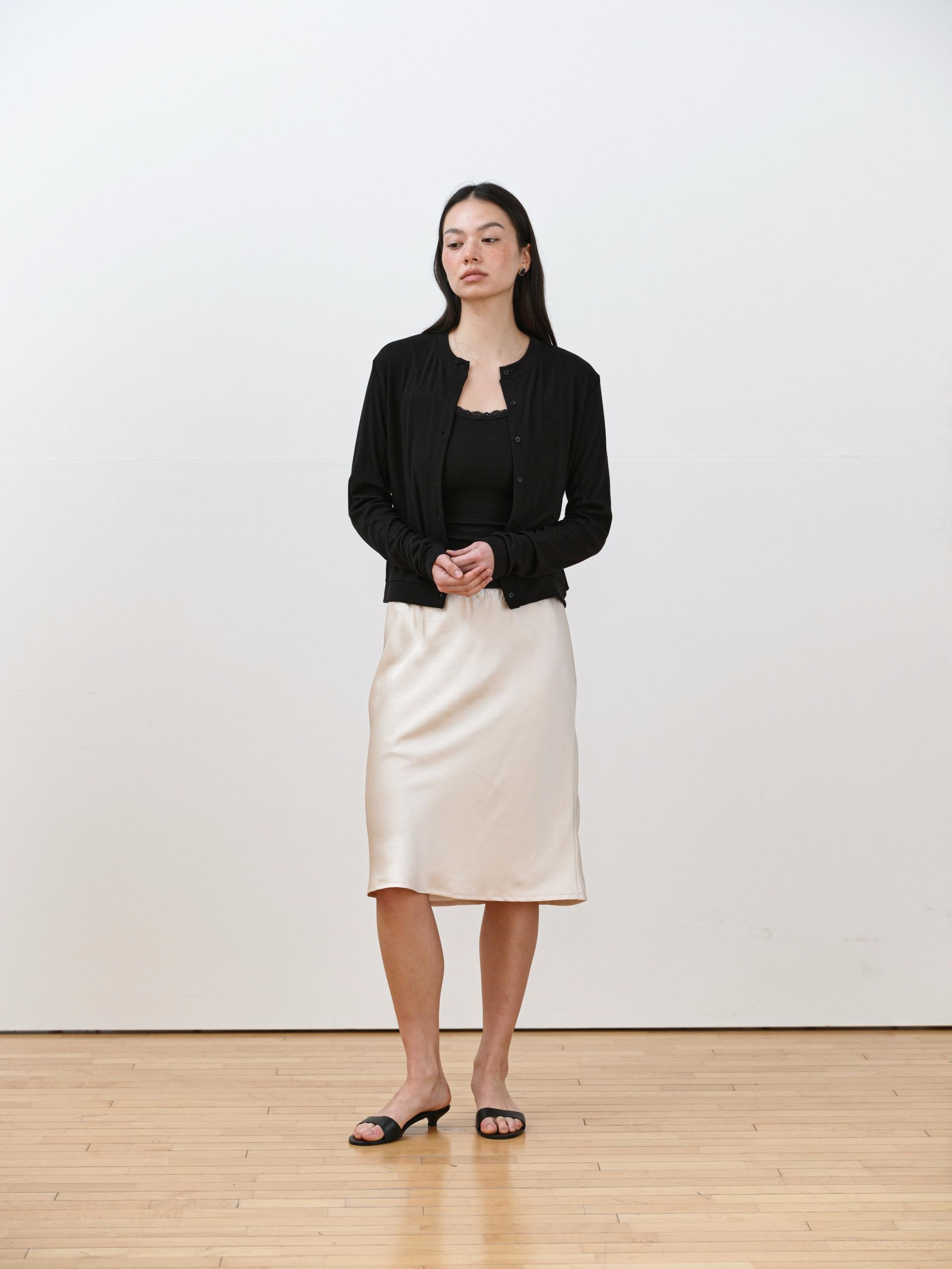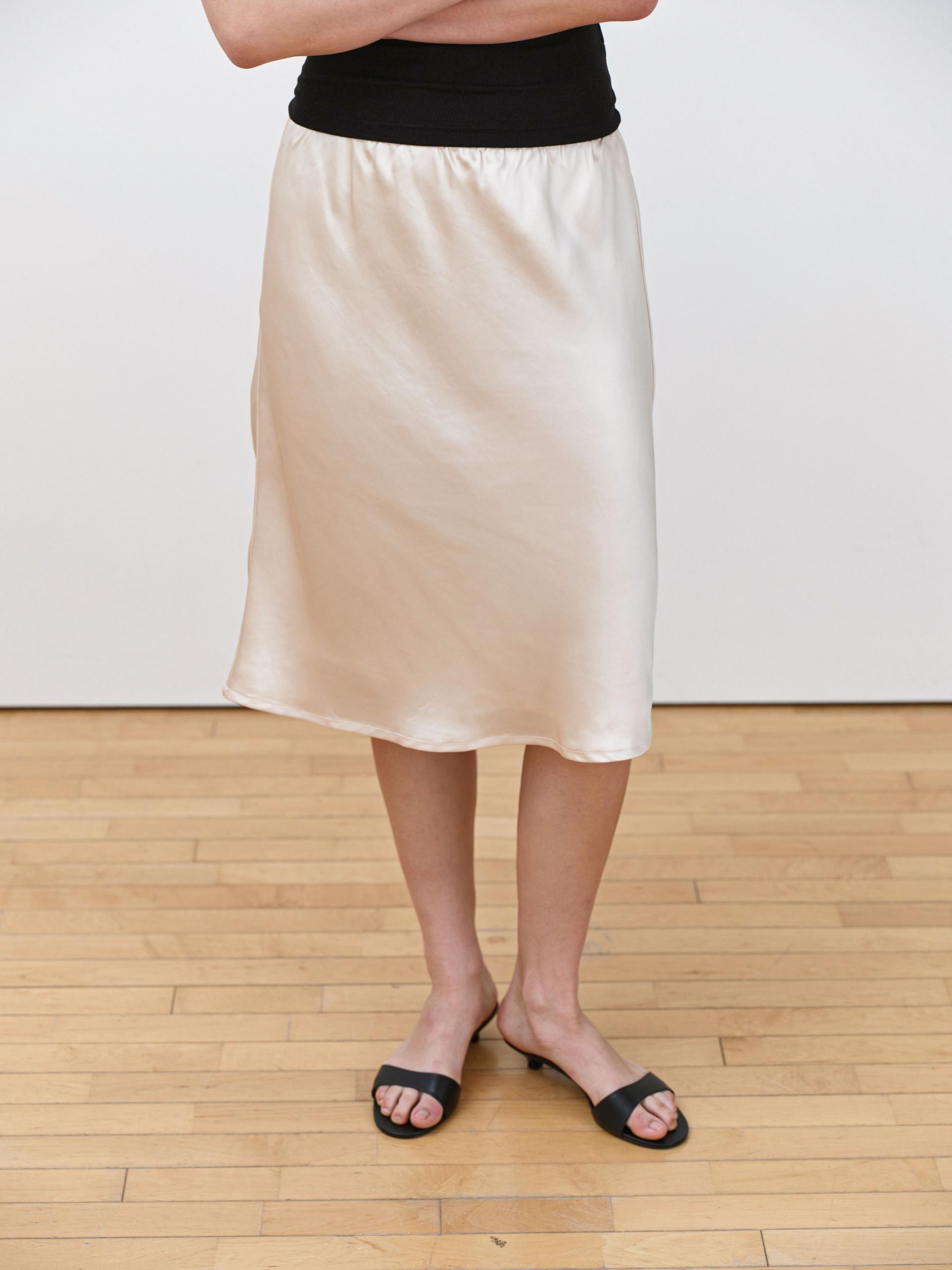 은은한 광택감이 느껴지는 새틴 텍스처와 자연스럽게 흐르는 드레이프 실루엣이