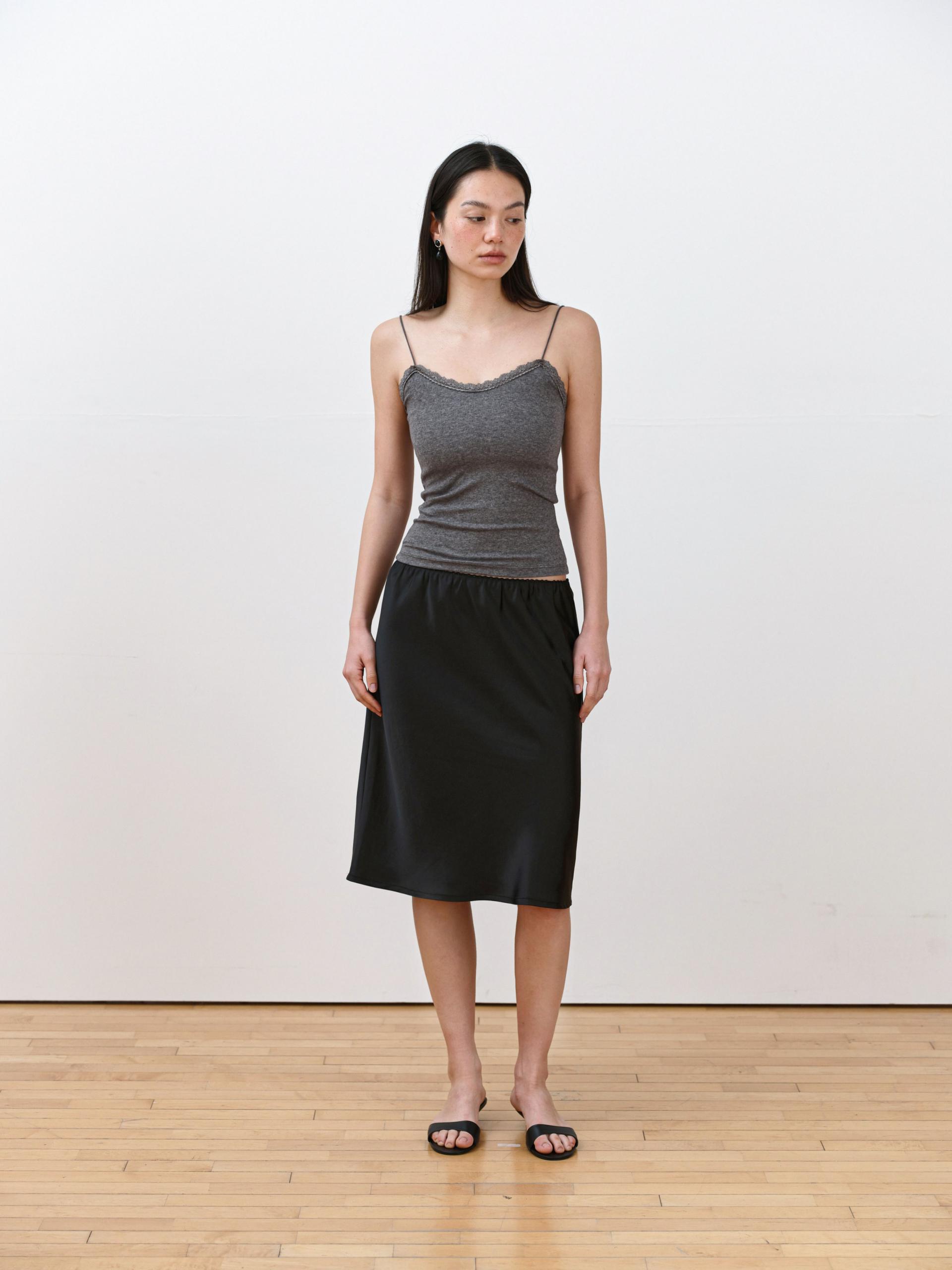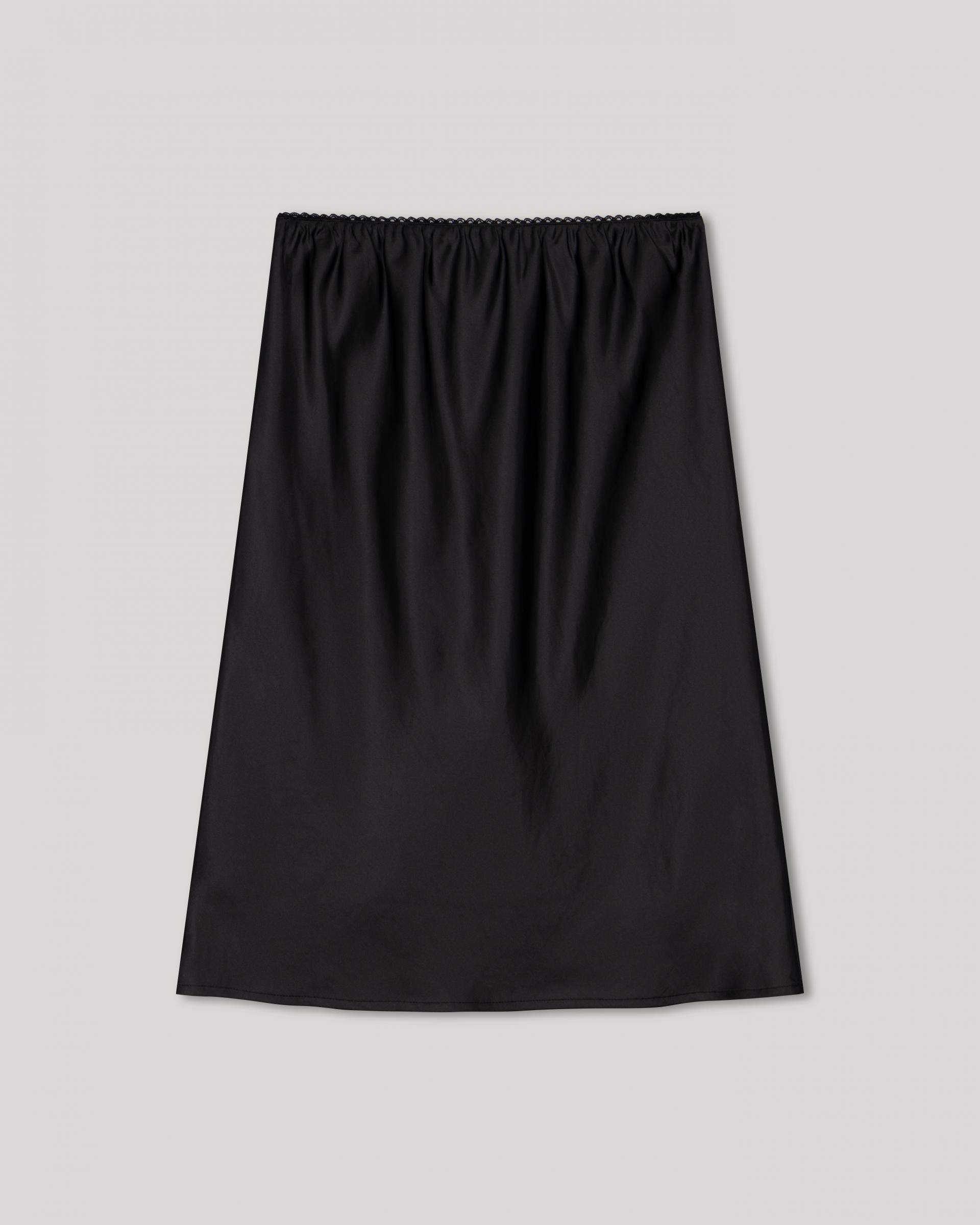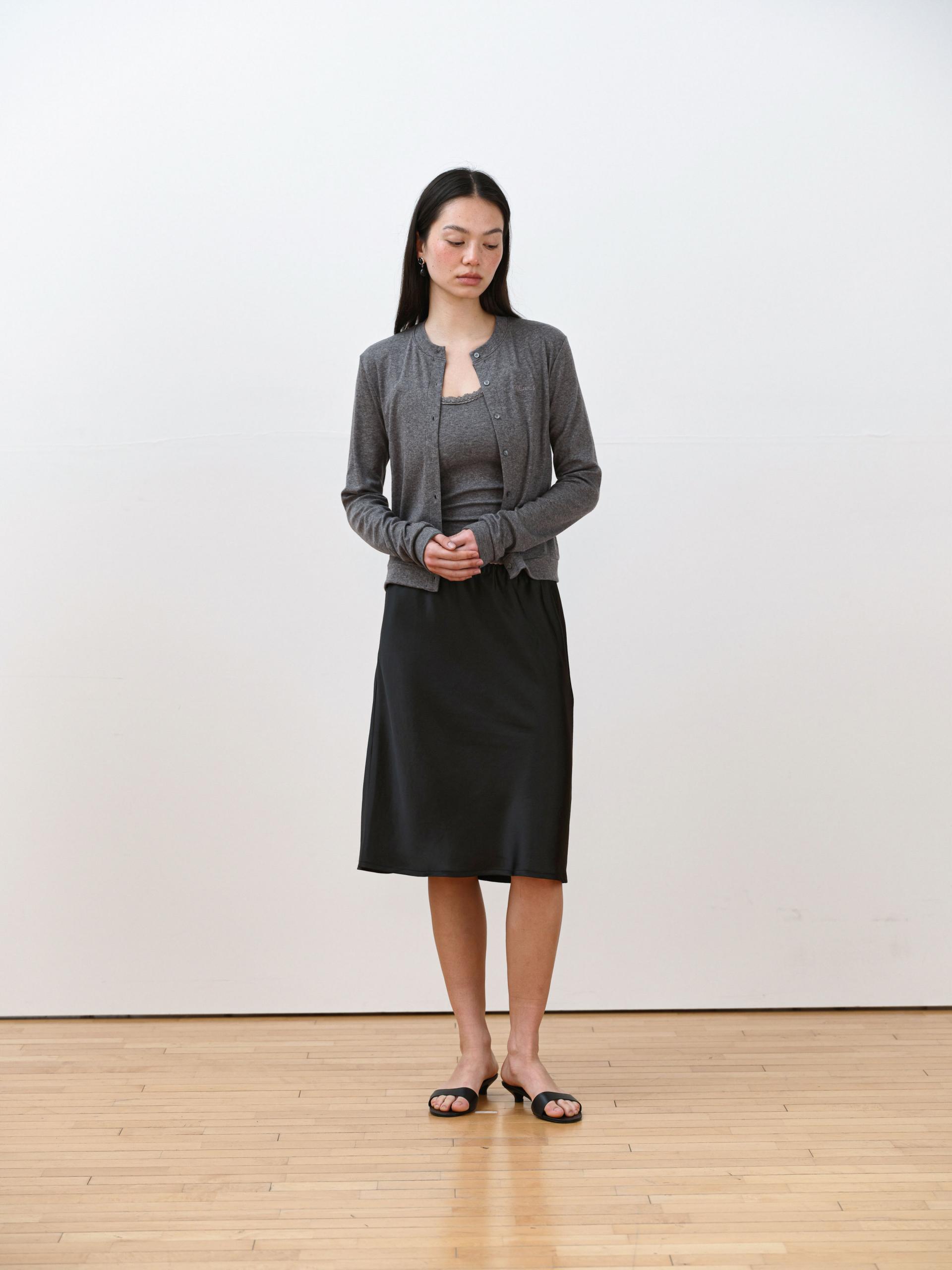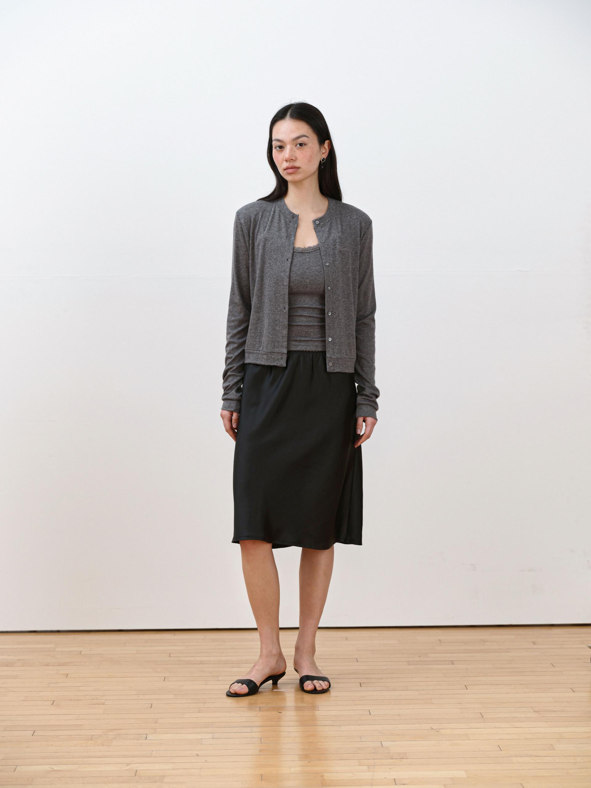 은은한 광택감이 느껴지는 새틴 텍스처와 자연스럽게 흐르는 드레이프 실루엣이