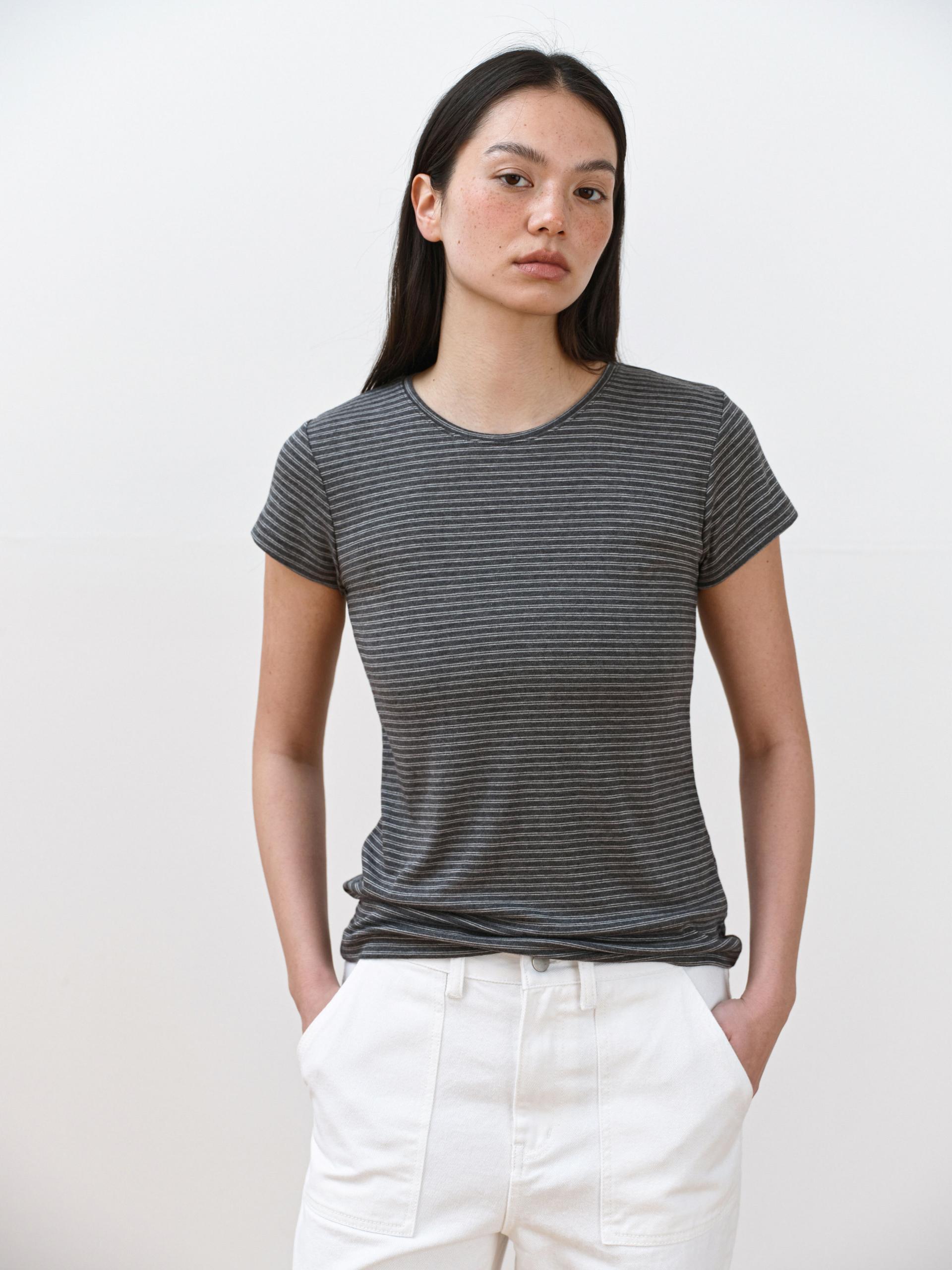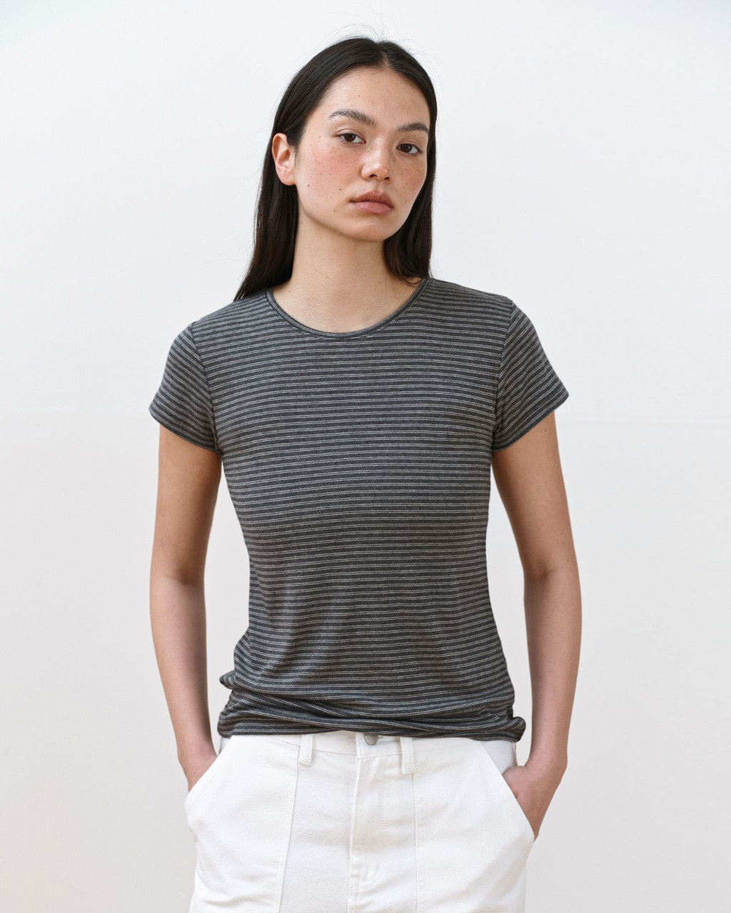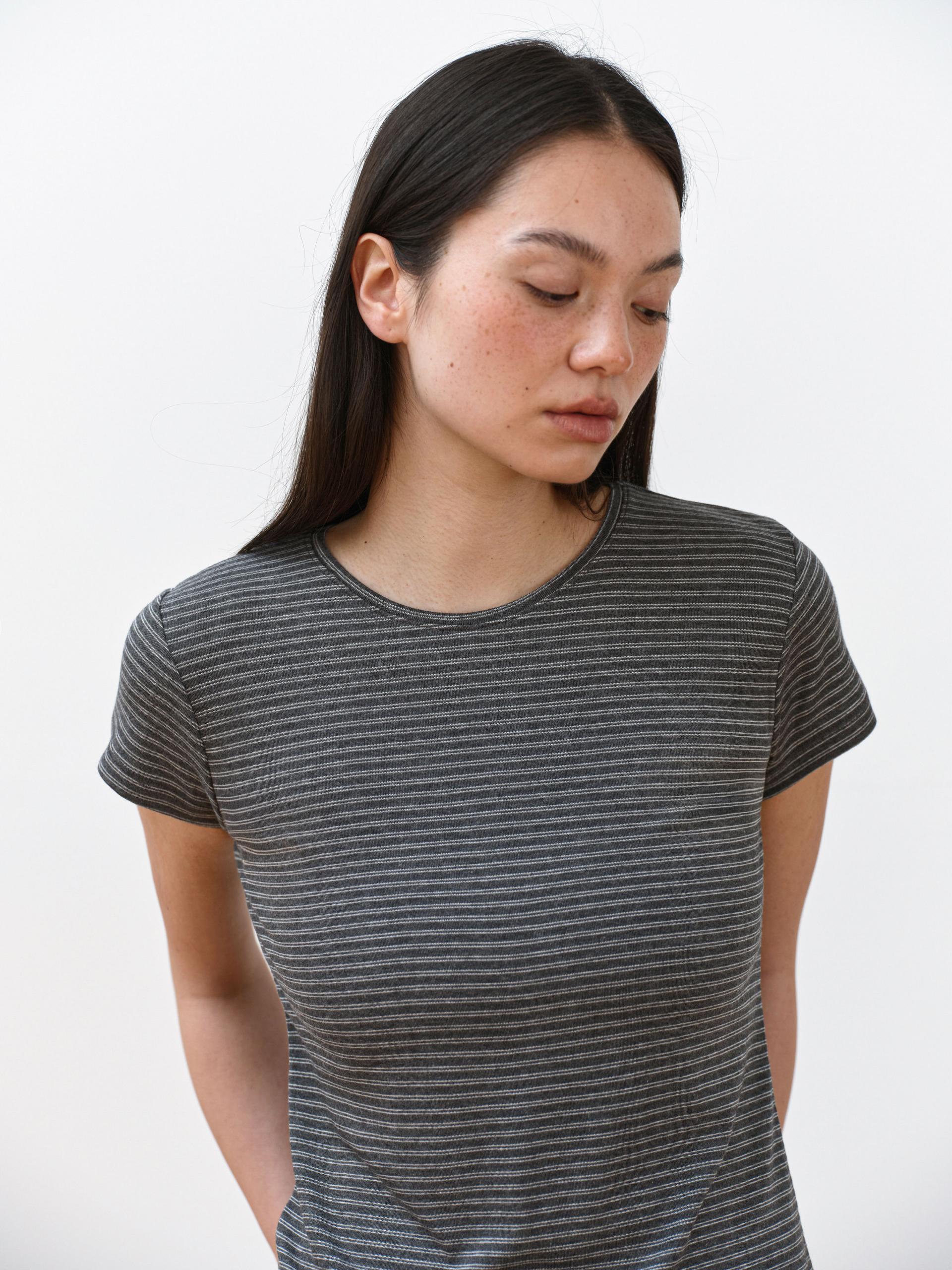 부드럽게 흐르는 레이온 혼방 원단으로 제작된 슬림핏 스트라이프 티셔츠입니다. 가볍고 신축성 좋은 소재로, 단독은 물론 이너로도 활용하기 좋습니다. 얇은 골지조직이 바디라인을 자연스럽게 잡아주며 여리한 실루엣을 완성합니다.