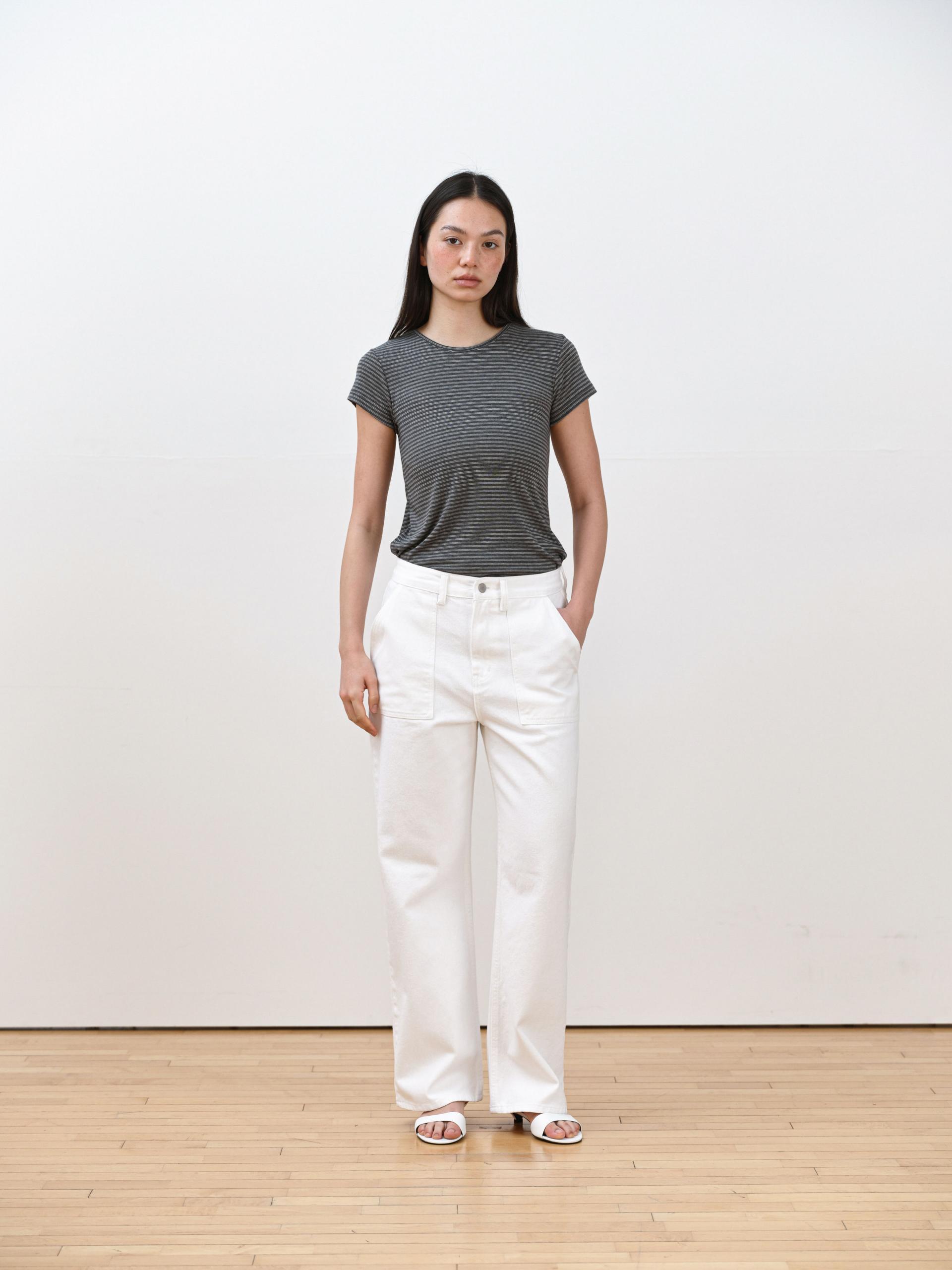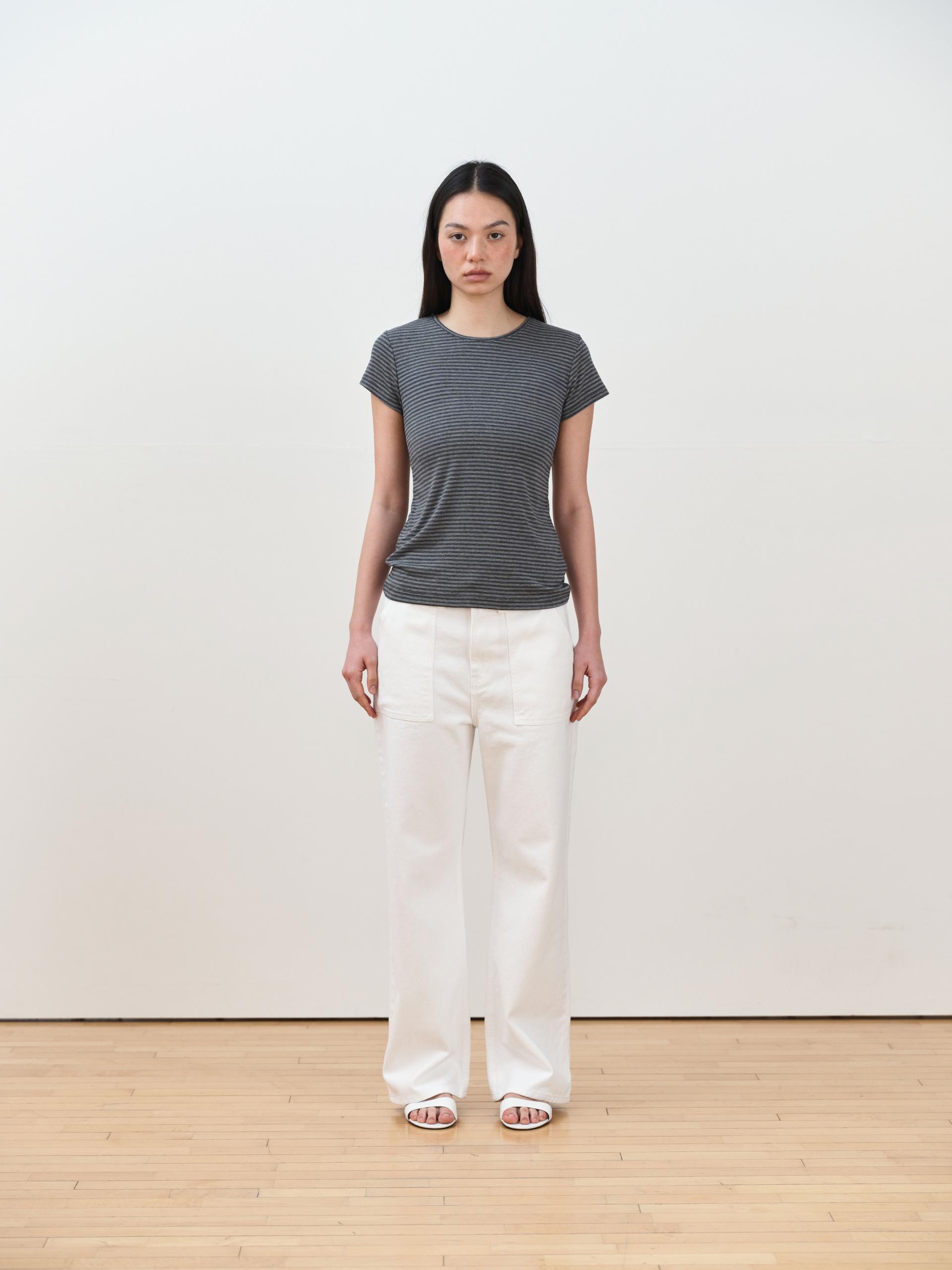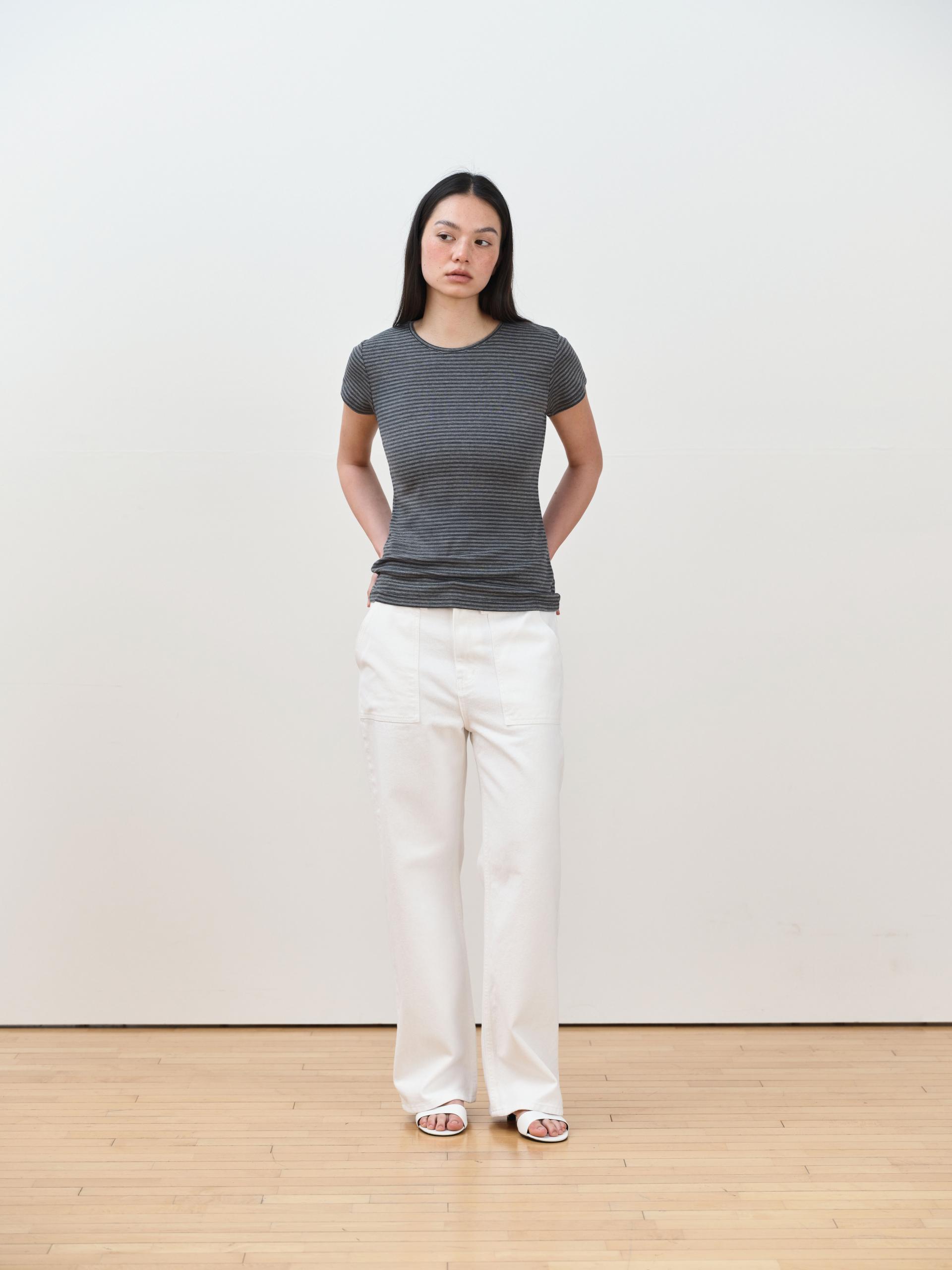 부드럽게 흐르는 레이온 혼방 원단으로 제작된 슬림핏 스트라이프 티셔츠입니다. 가볍고 신축성 좋은 소재로, 단독은 물론 이너로도 활용하기 좋습니다. 얇은 골지조직이 바디라인을 자연스럽게 잡아주며 여리한 실루엣을 완성합니다.