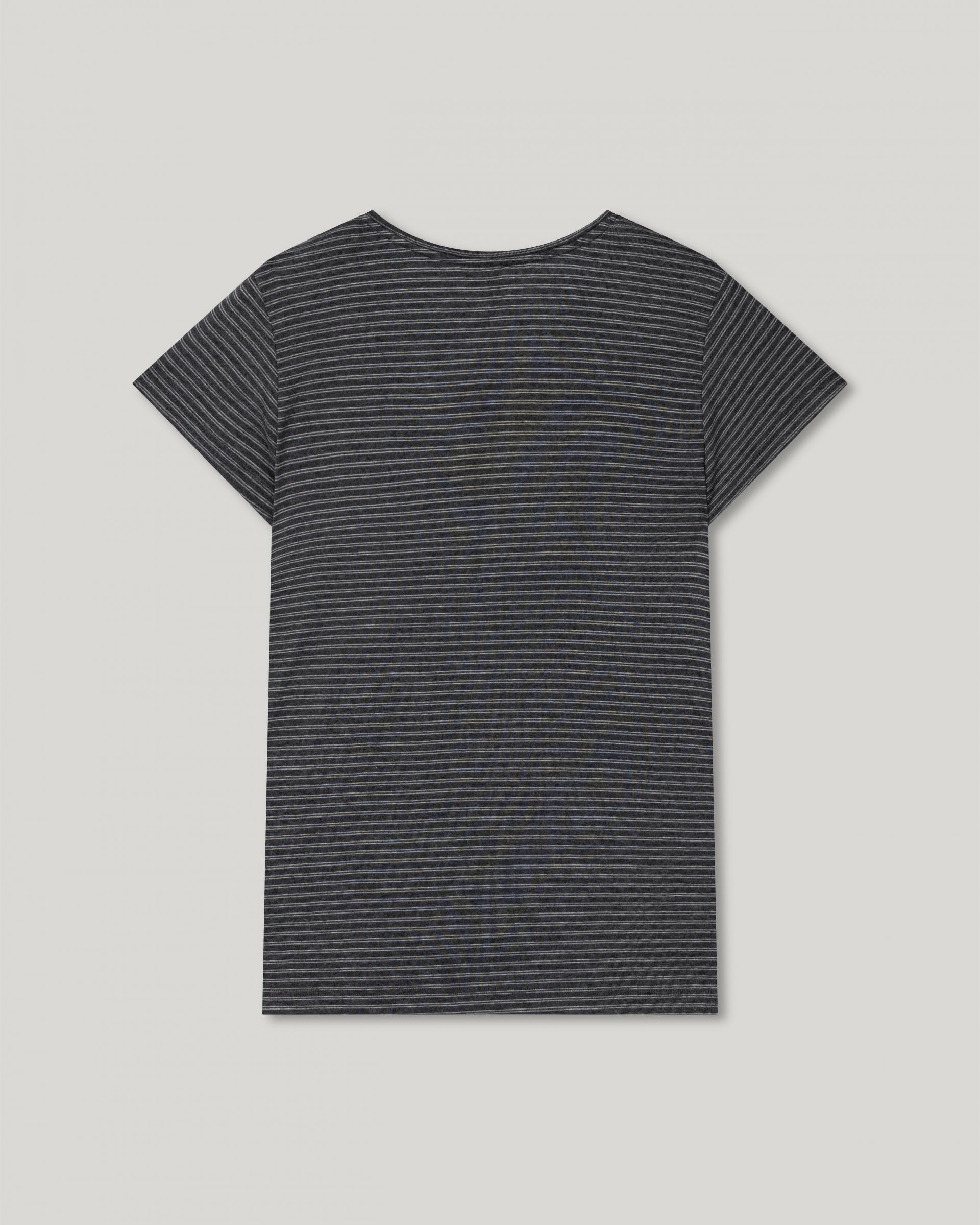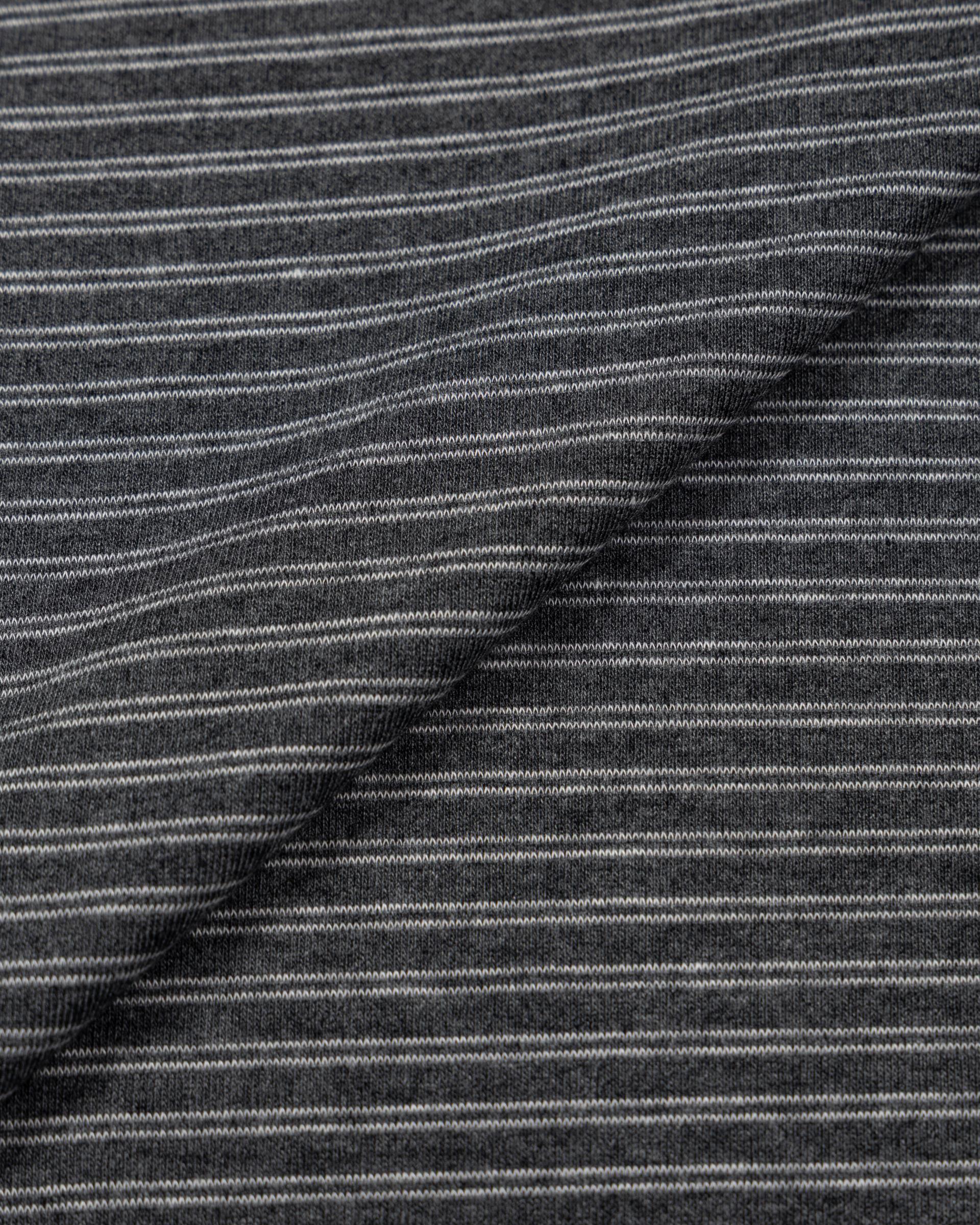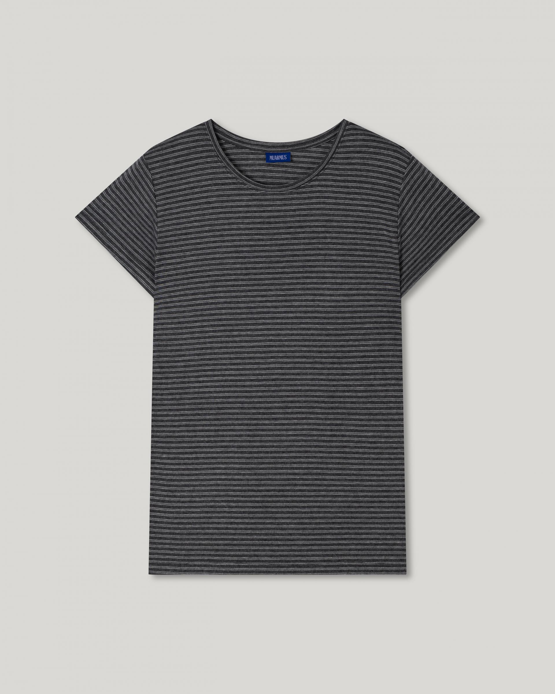 부드럽게 흐르는 레이온 혼방 원단으로 제작된 슬림핏 스트라이프 티셔츠입니다.