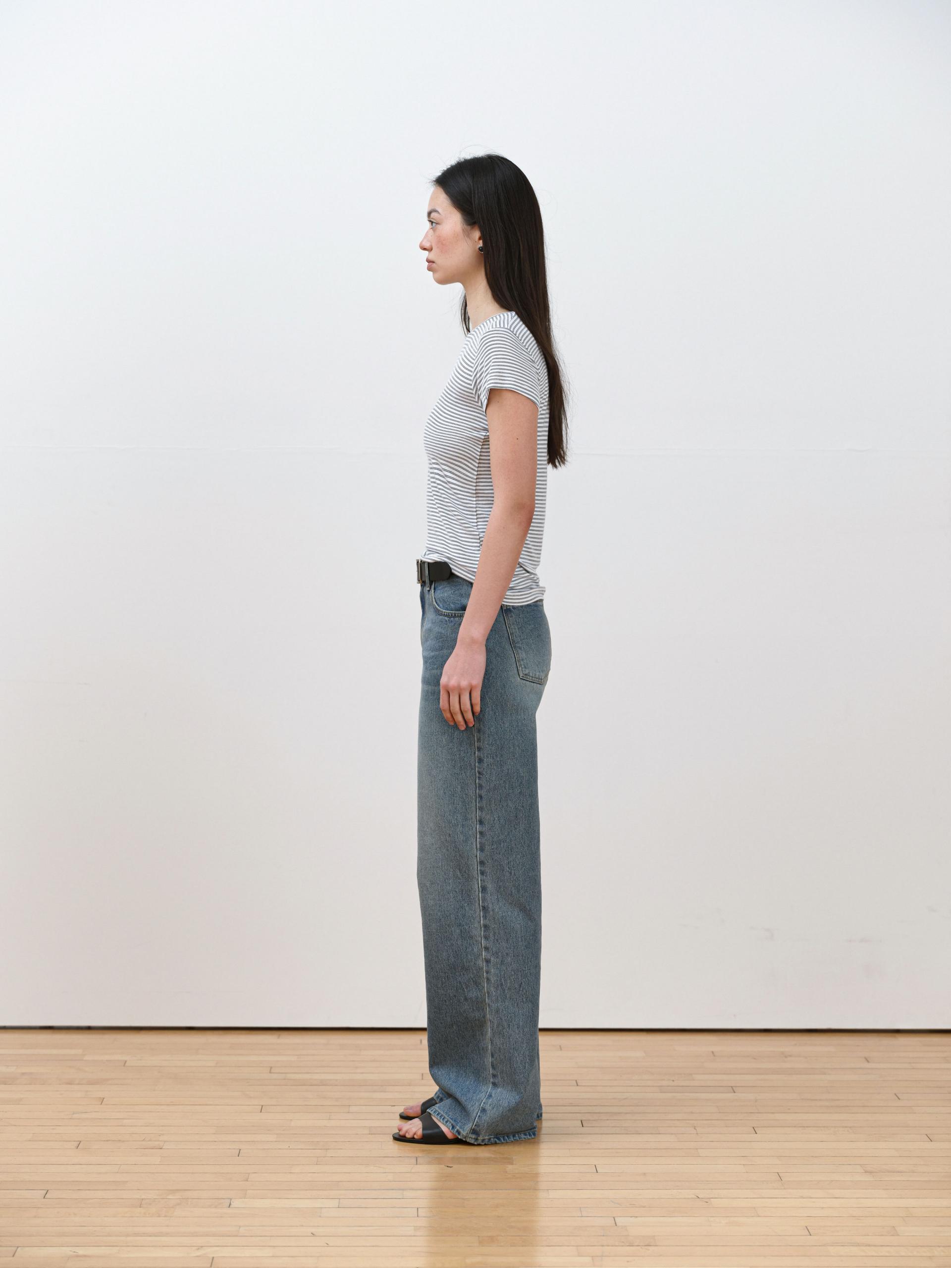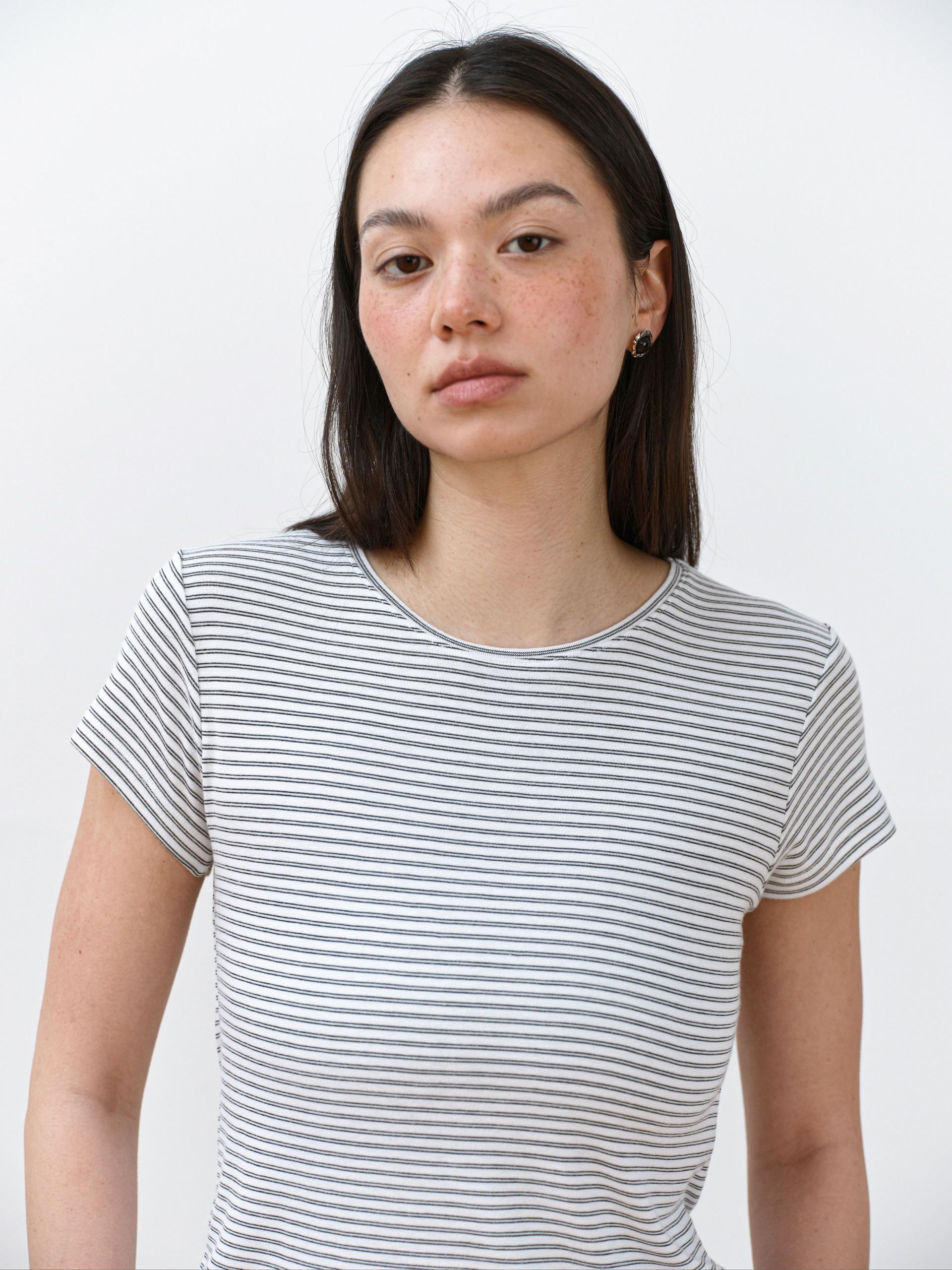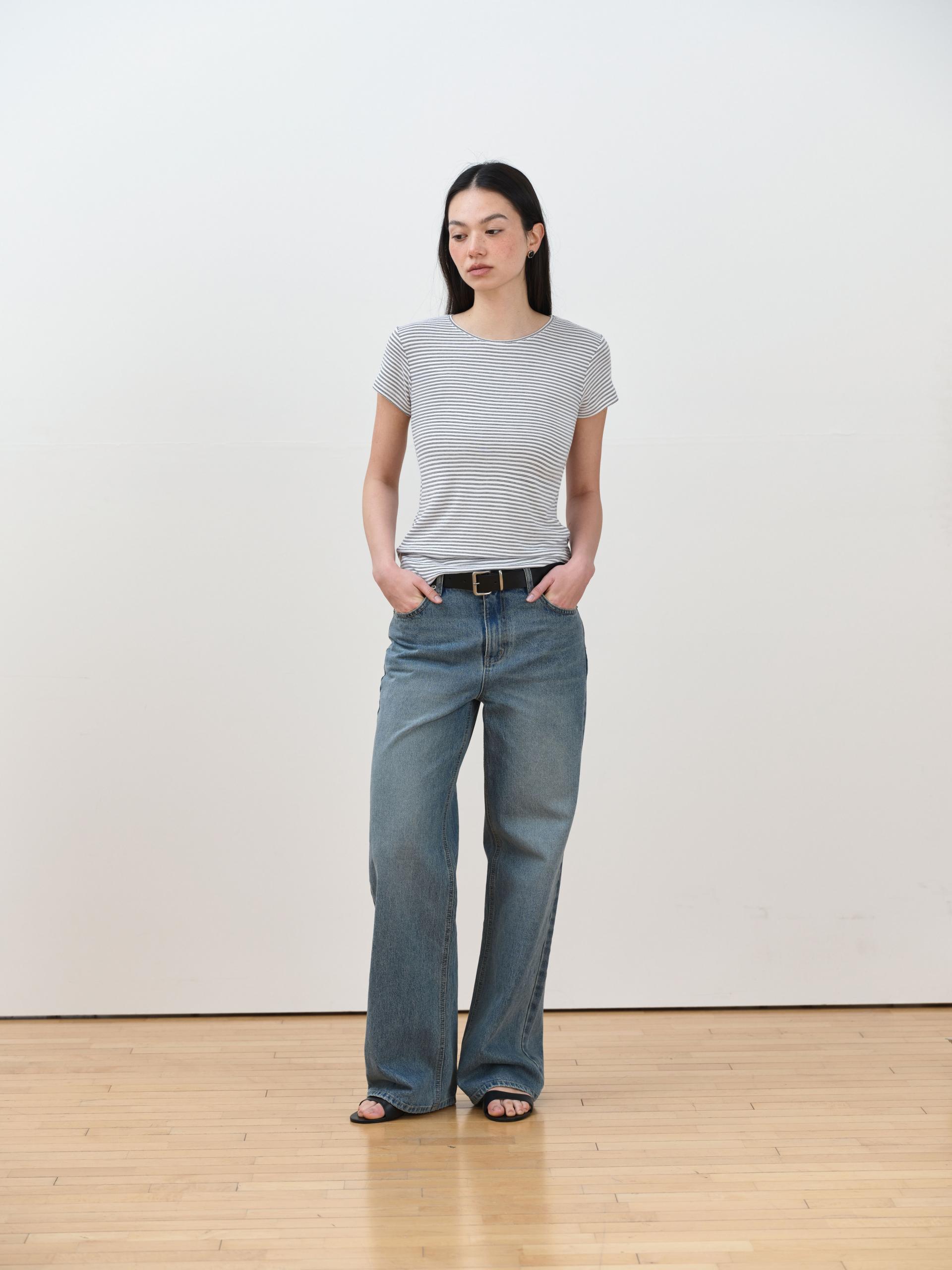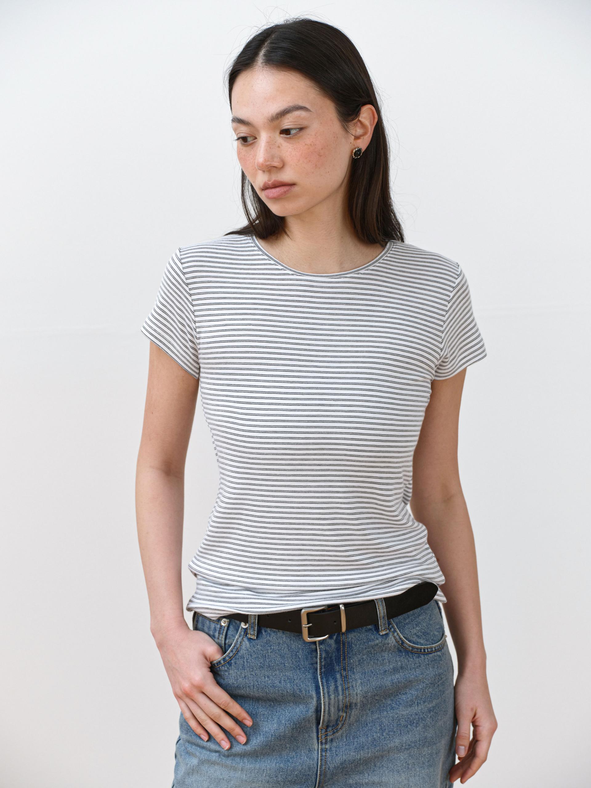 부드럽게 흐르는 레이온 혼방 원단으로 제작된 슬림핏 스트라이프 티셔츠입니다. 가볍고 신축성 좋은 소재로, 단독은 물론 이너로도 활용하기 좋습니다. 얇은 골지조직이 바디라인을 자연스럽게 잡아주며 여리한 실루엣을 완성합니다.