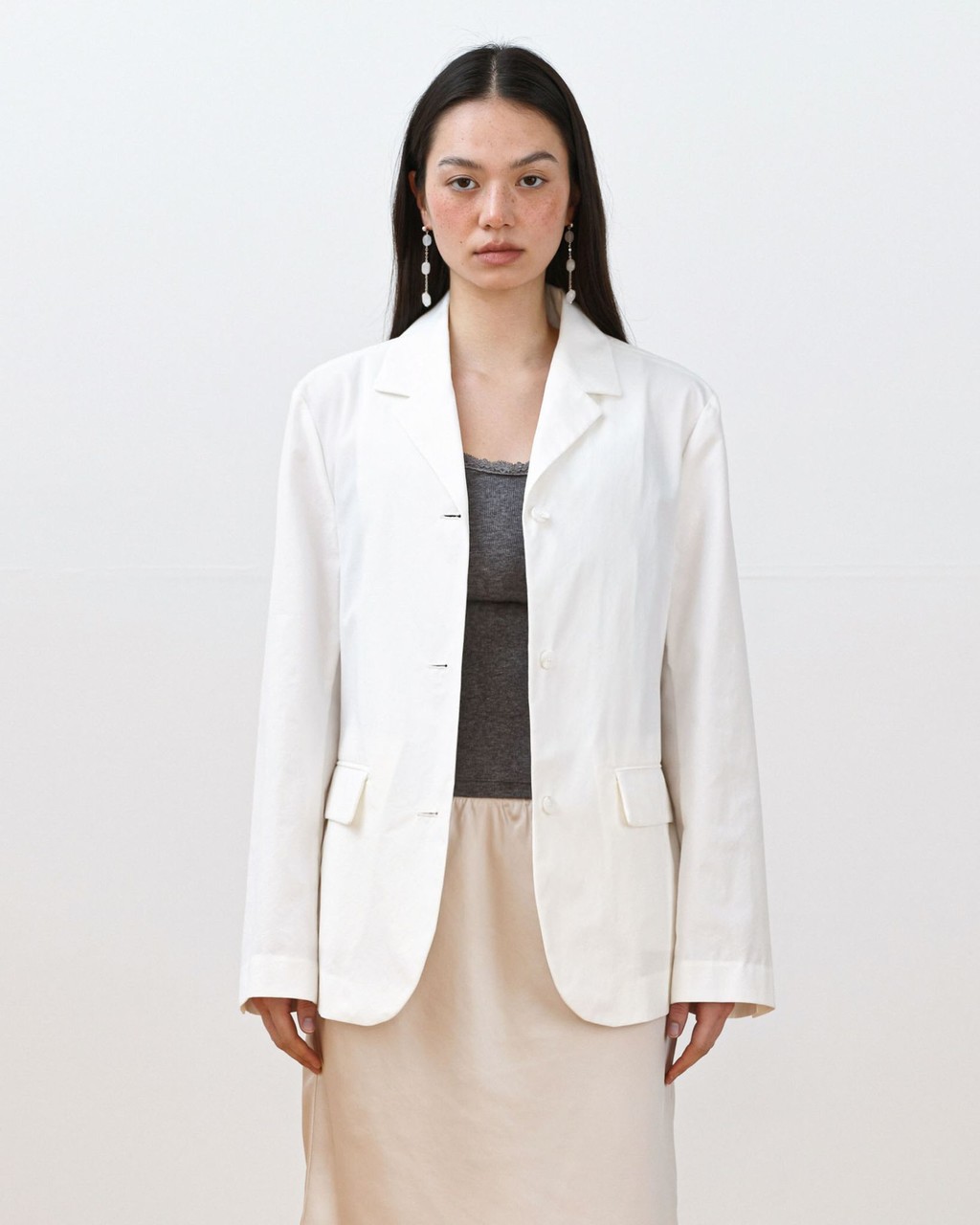 내추럴한 무드의 코튼 자켓으로, 세미 오버핏 실루엣이 체형을 자연스럽게 감싸주며 편안한 착용감을 제공합니다.
