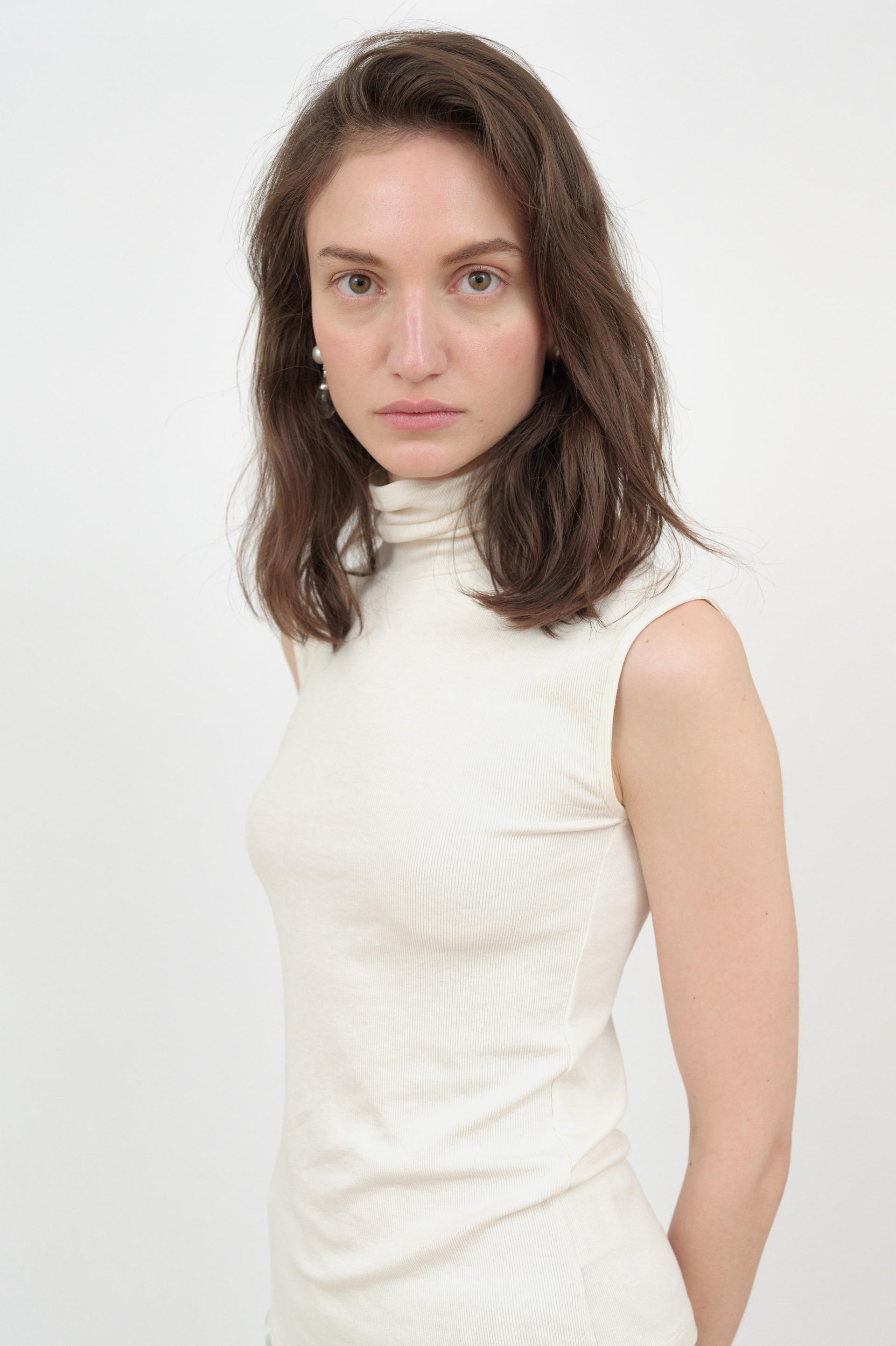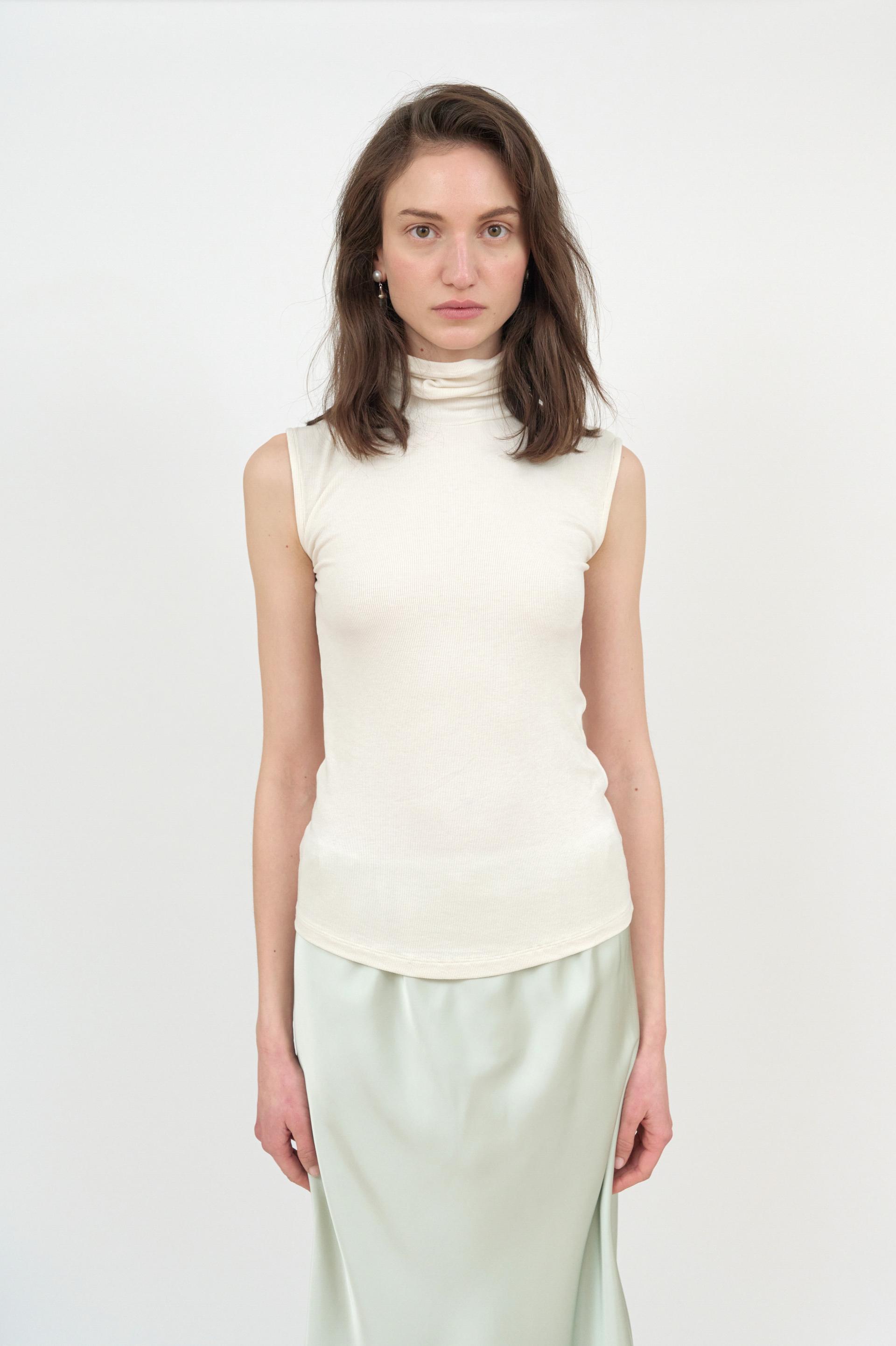 고급스러운 터틀넥 디자인의 골지 나시 티셔츠 입니다.