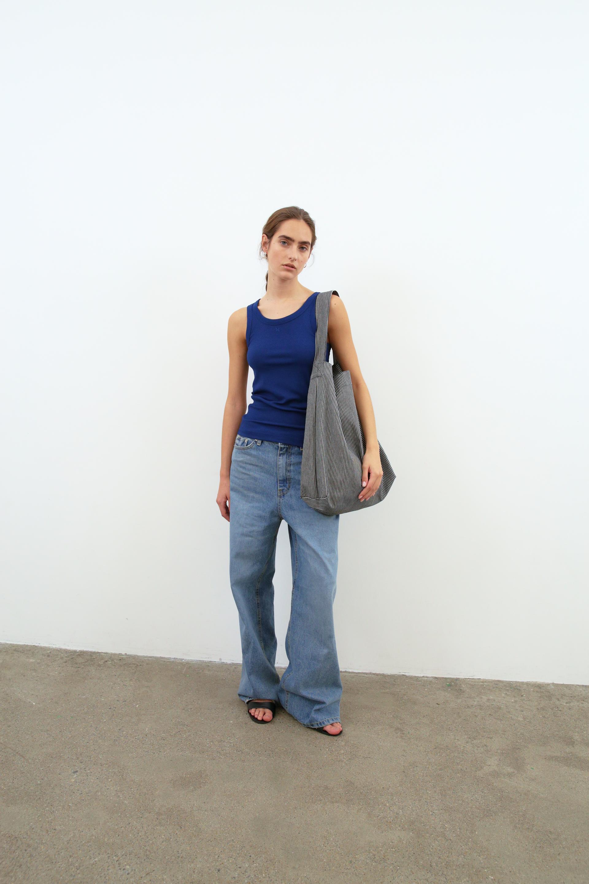 무아르무스의 MUARMUS 자수 로고가 들어간 스트라이프 에코백입니다.
