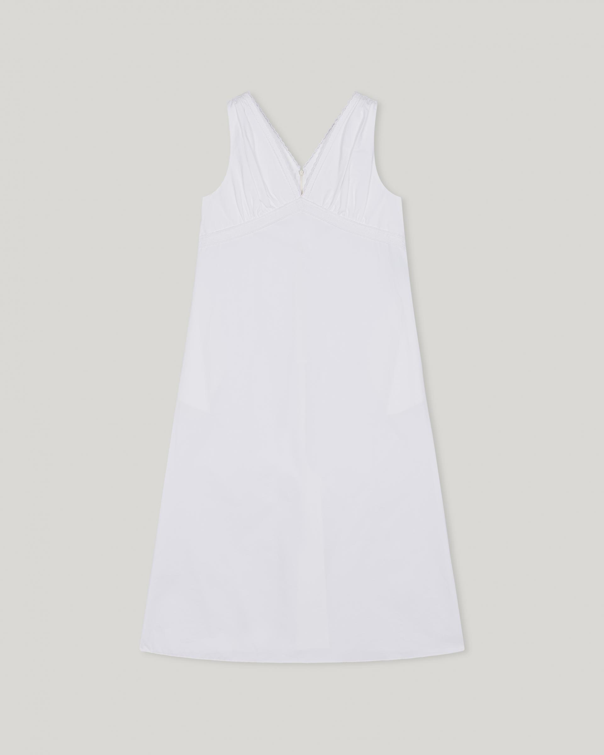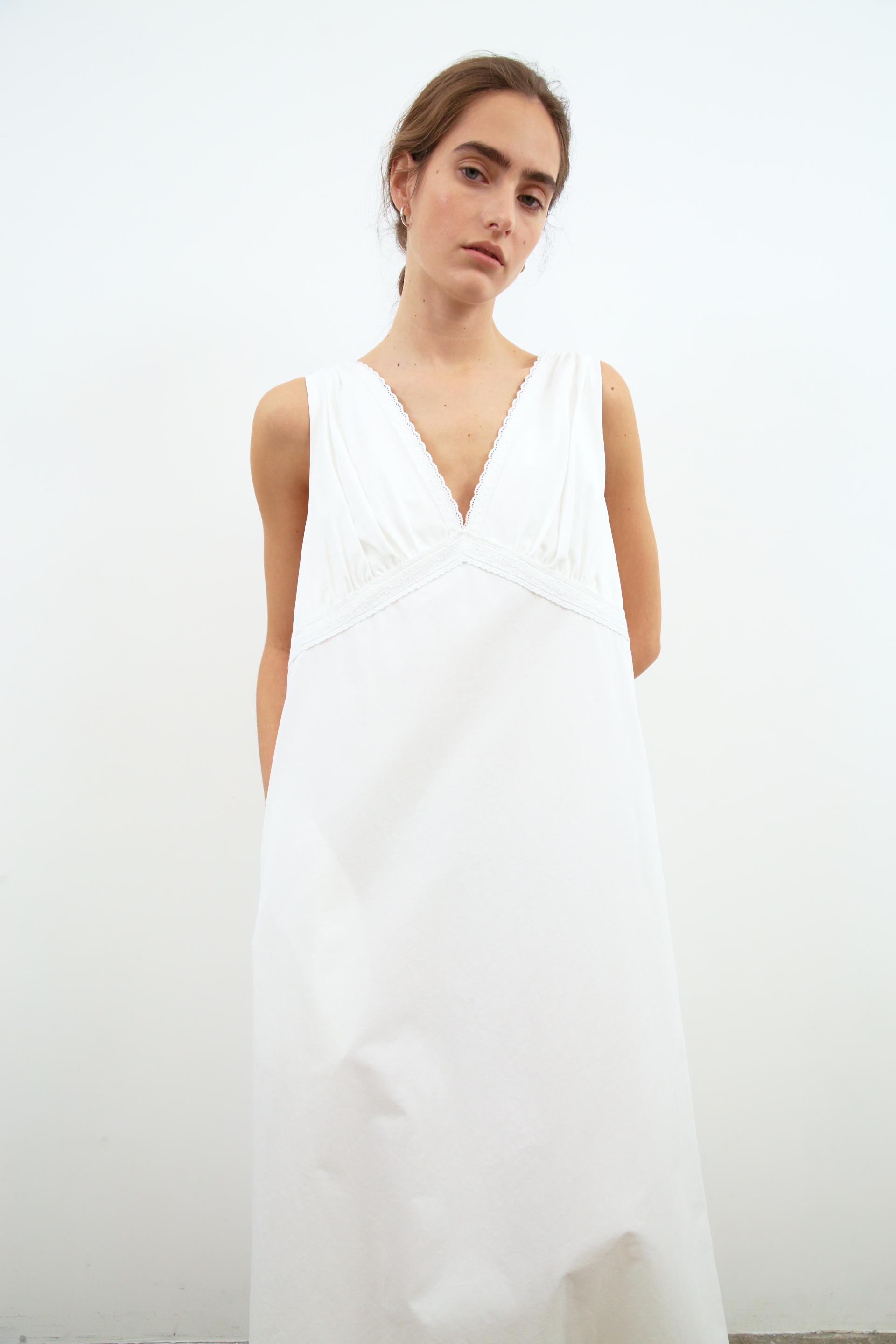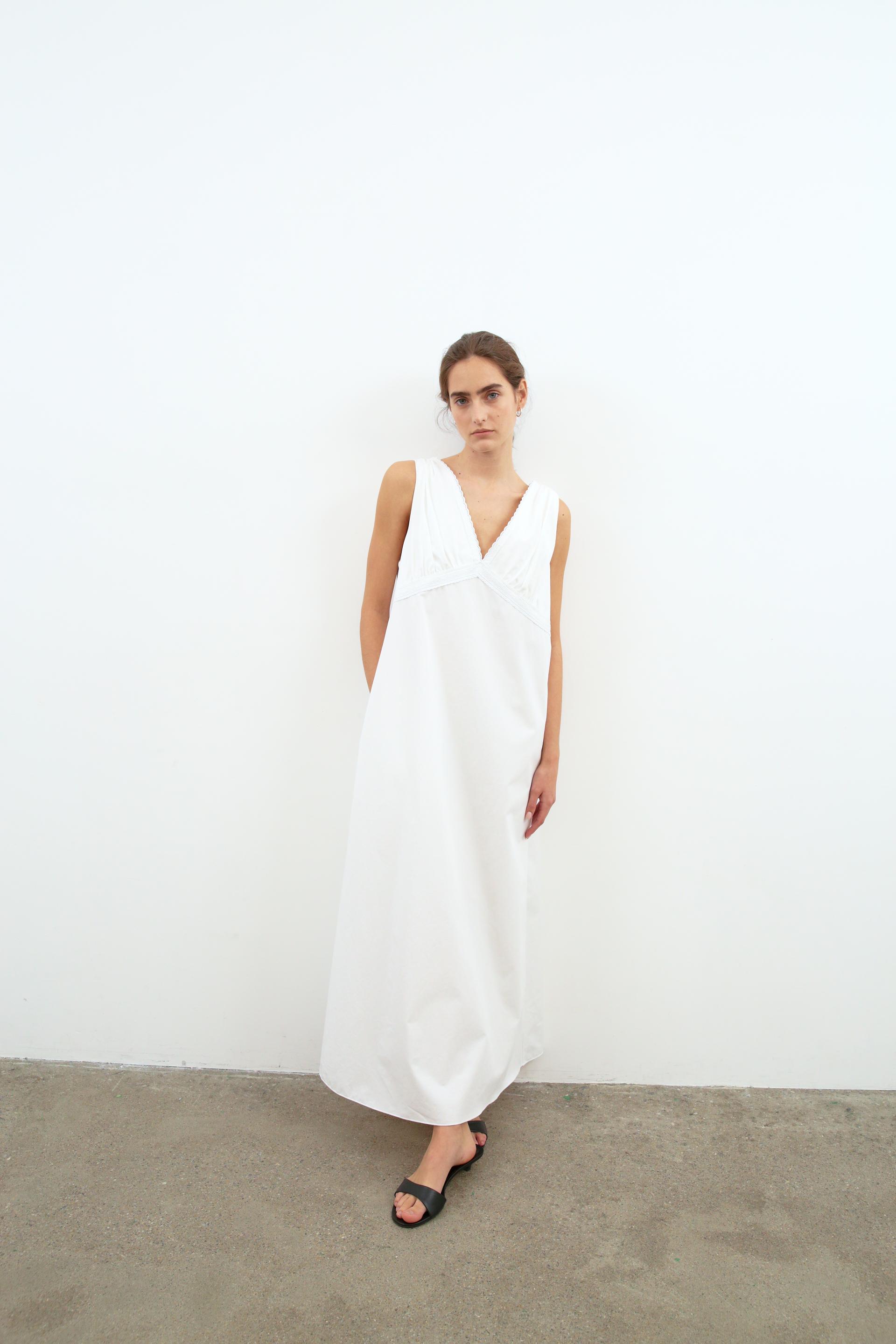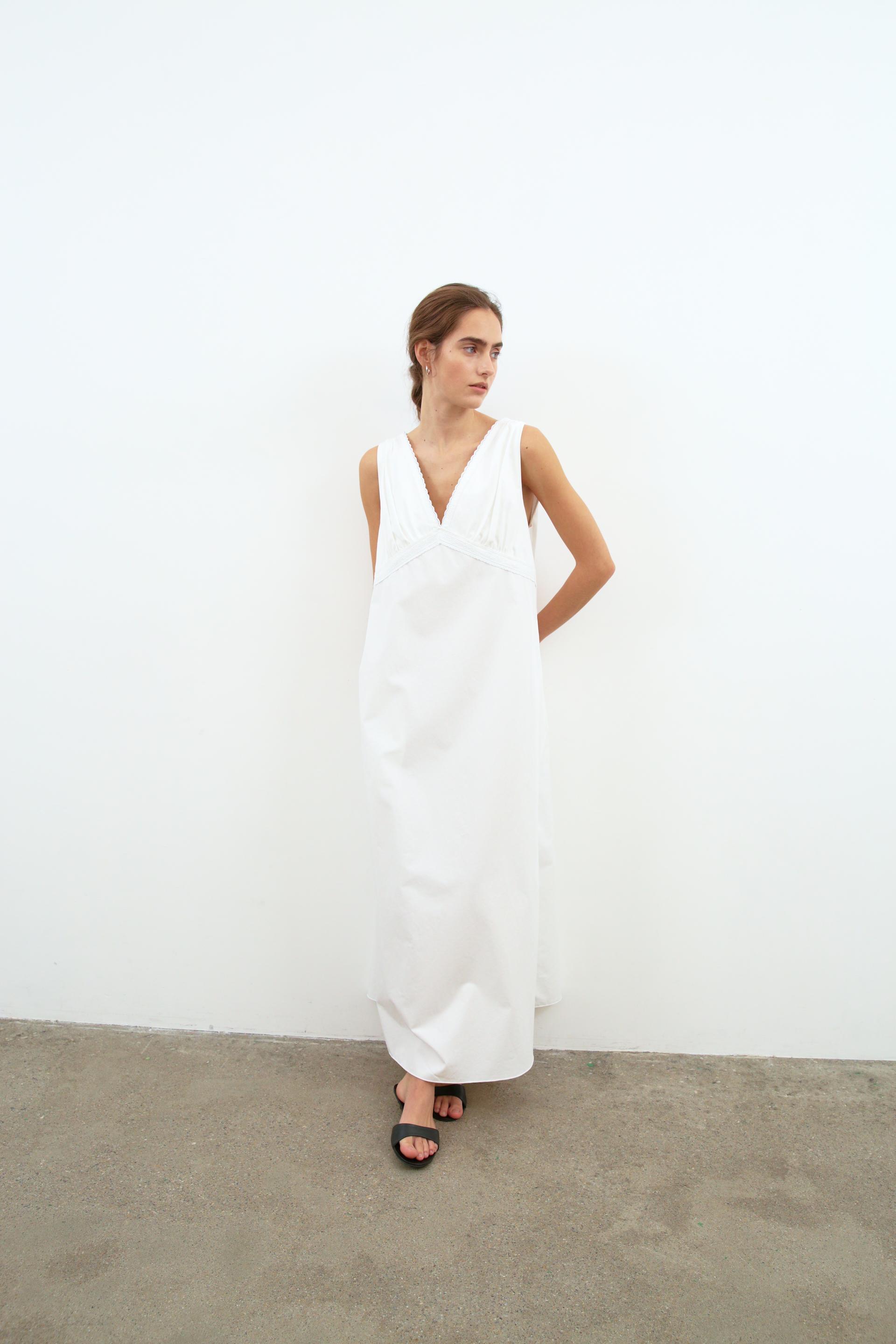 클래식한 브이넥 코튼 맥시 드레스입니다.